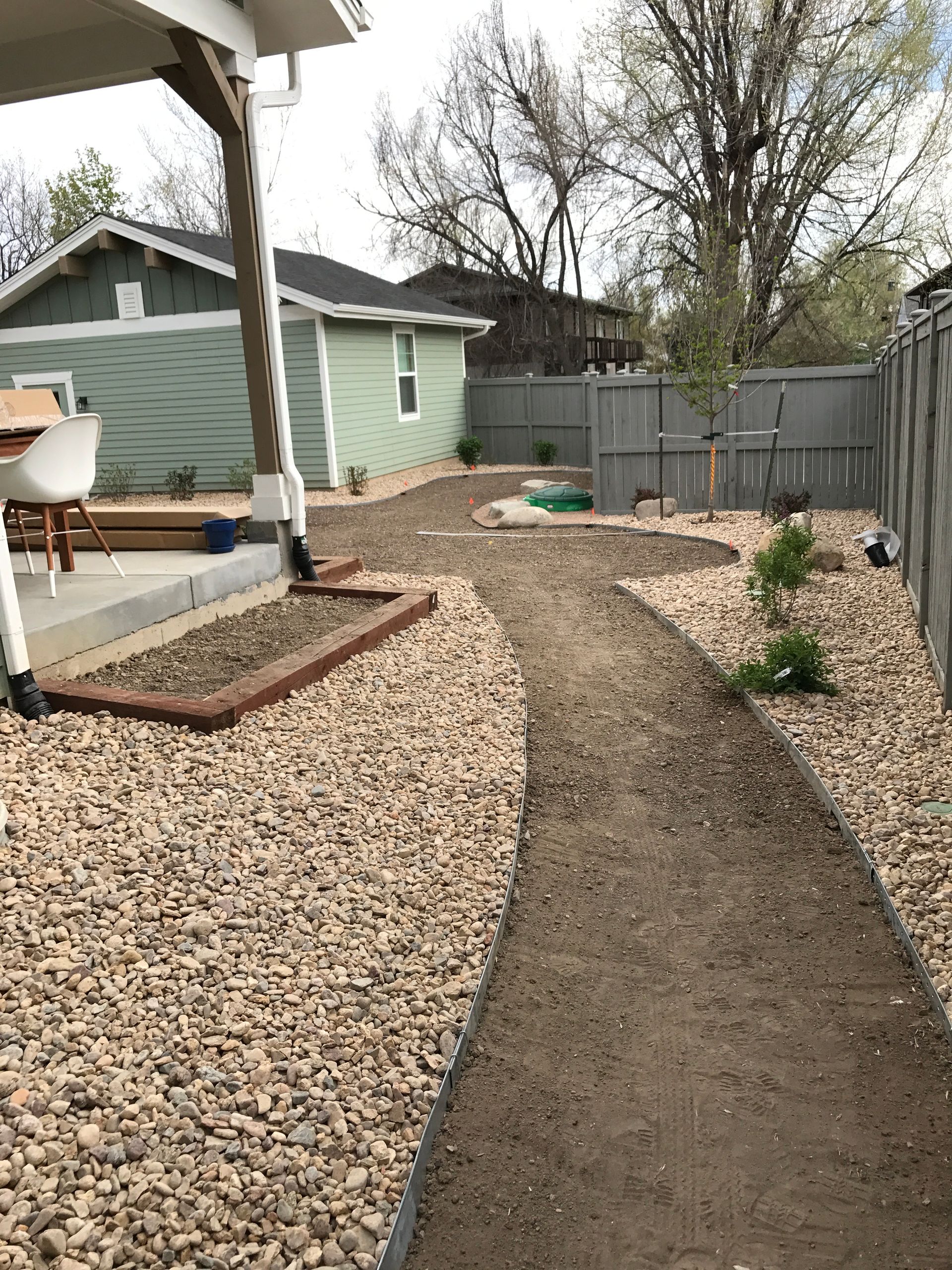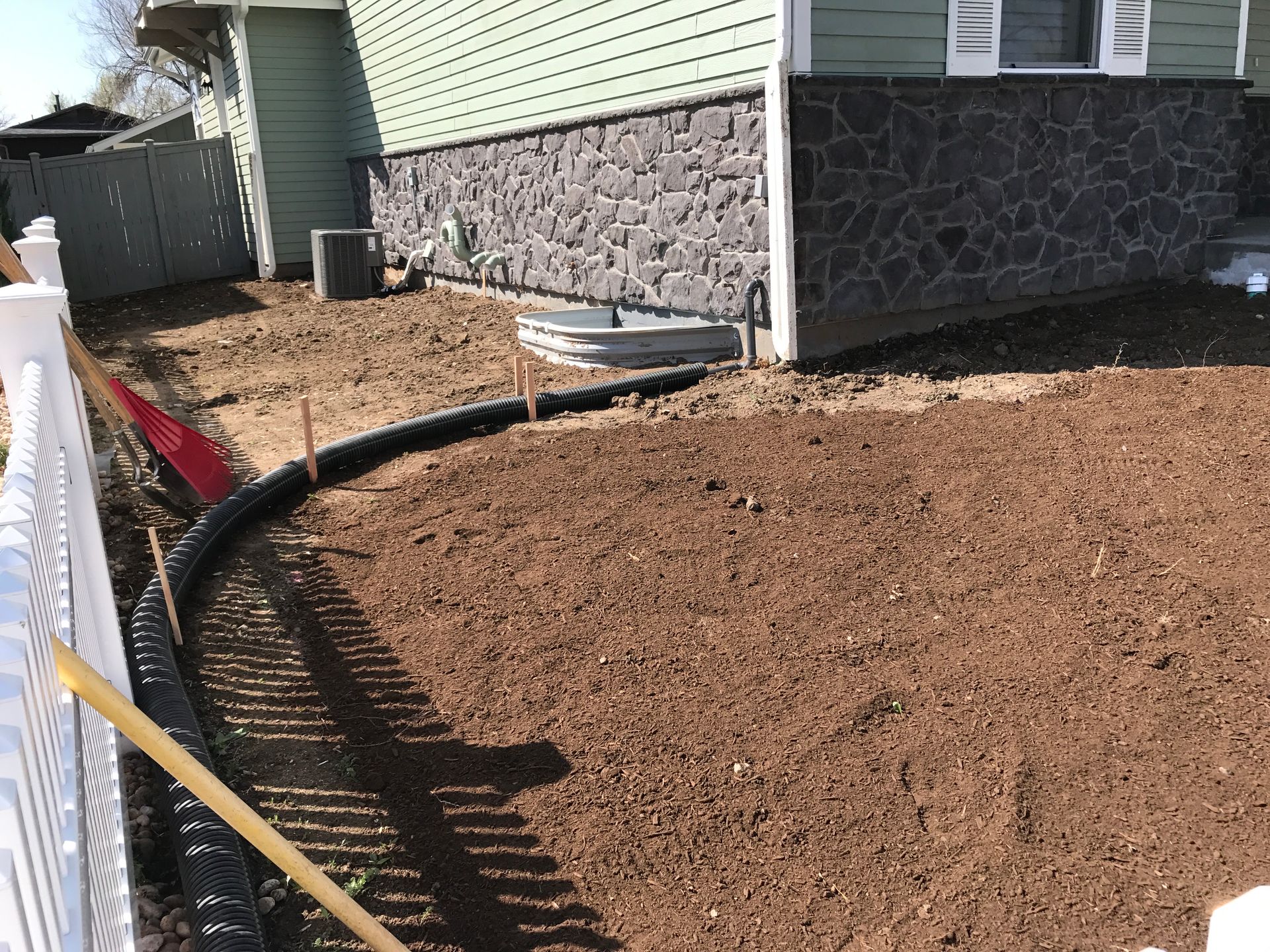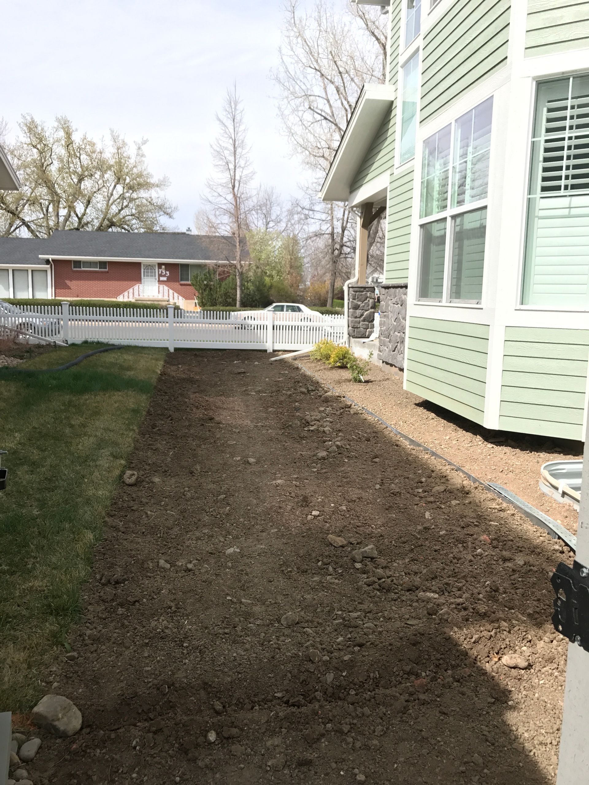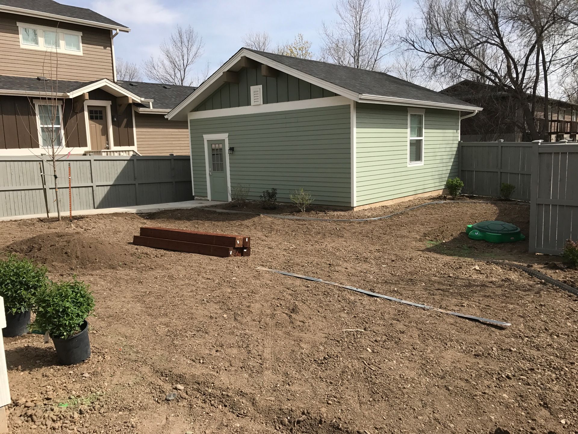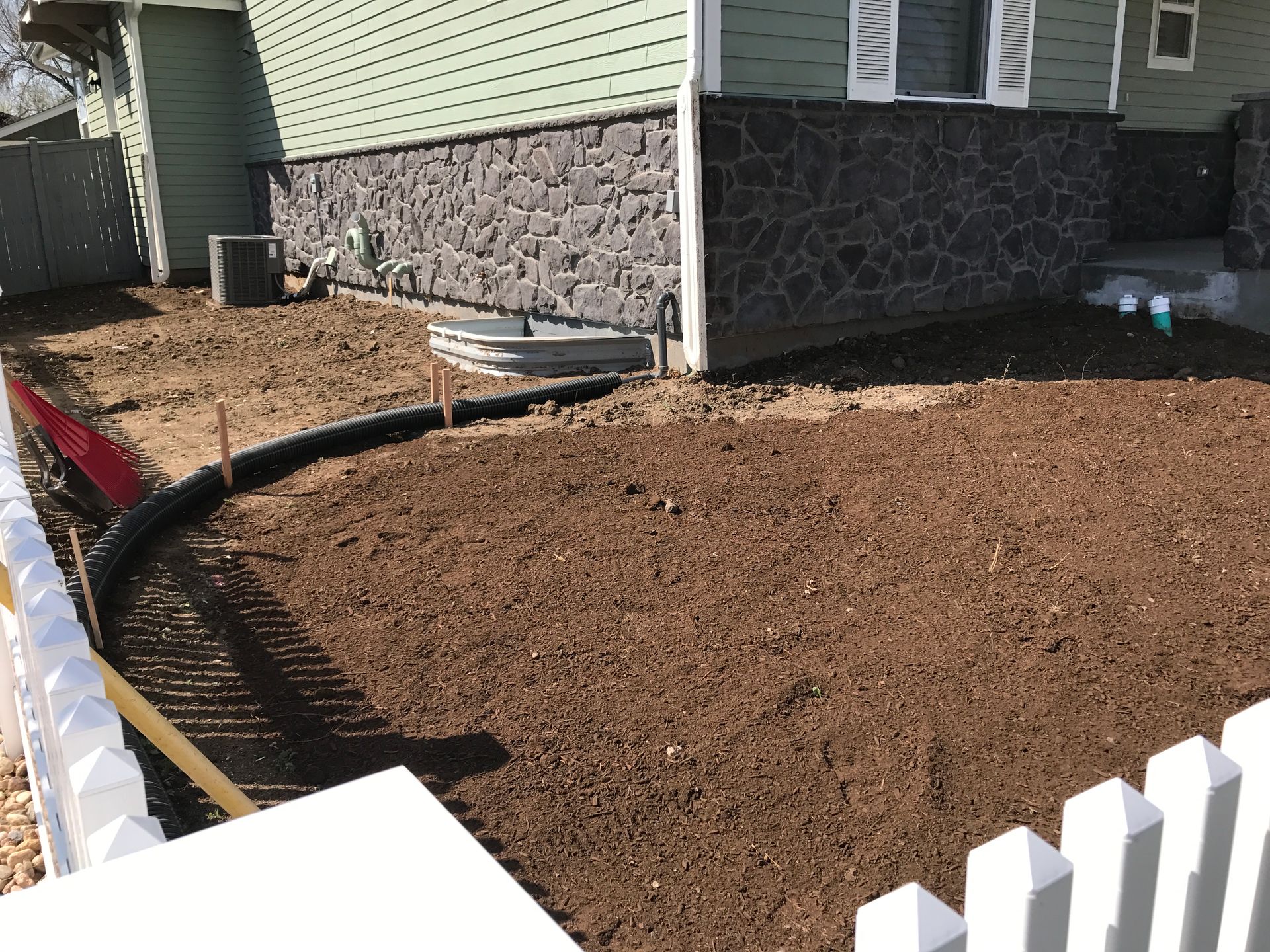 Full landscape remodel with decorative rock, plantings, sprinklers and grass. Lafayette, CO 2019