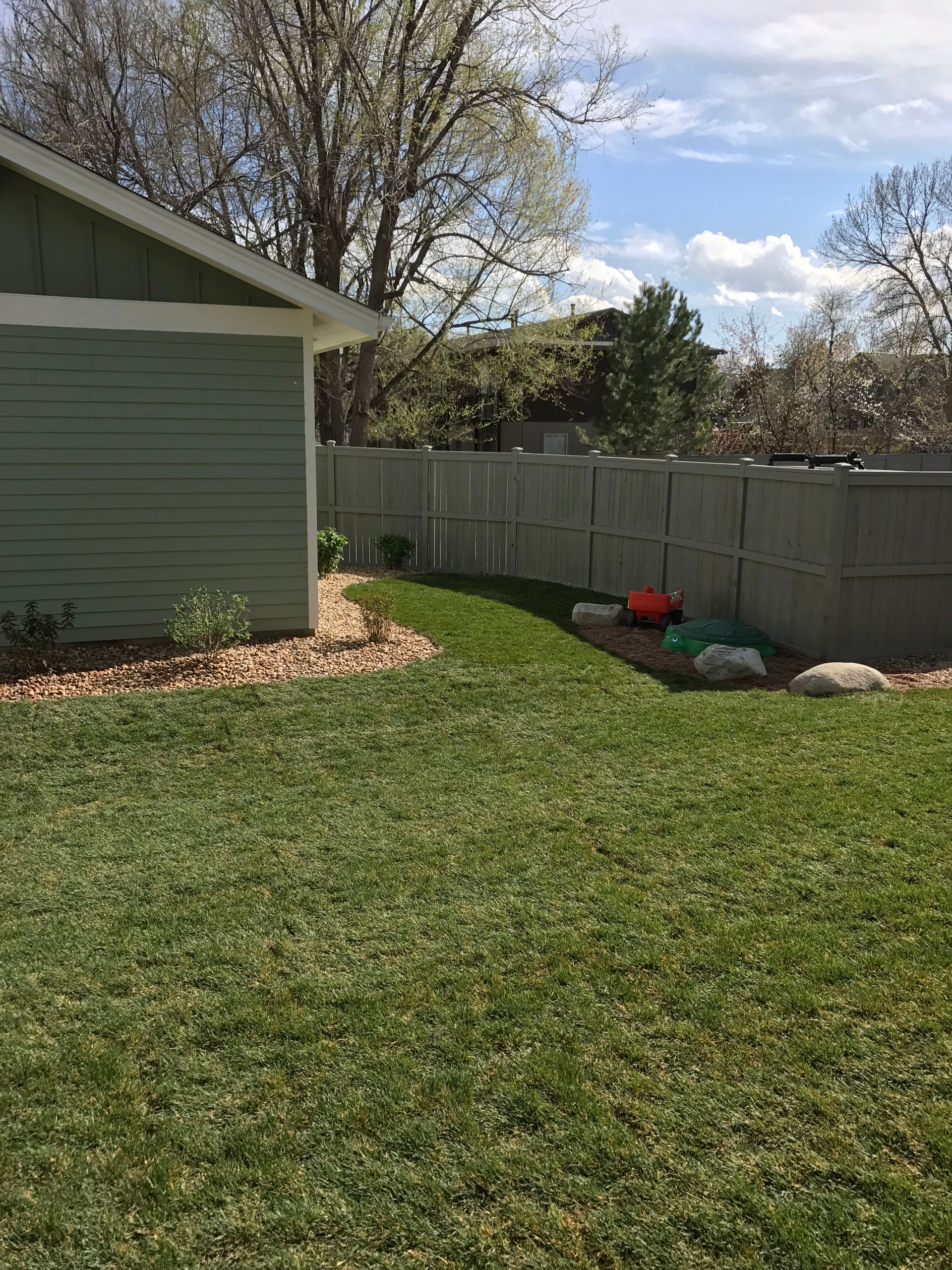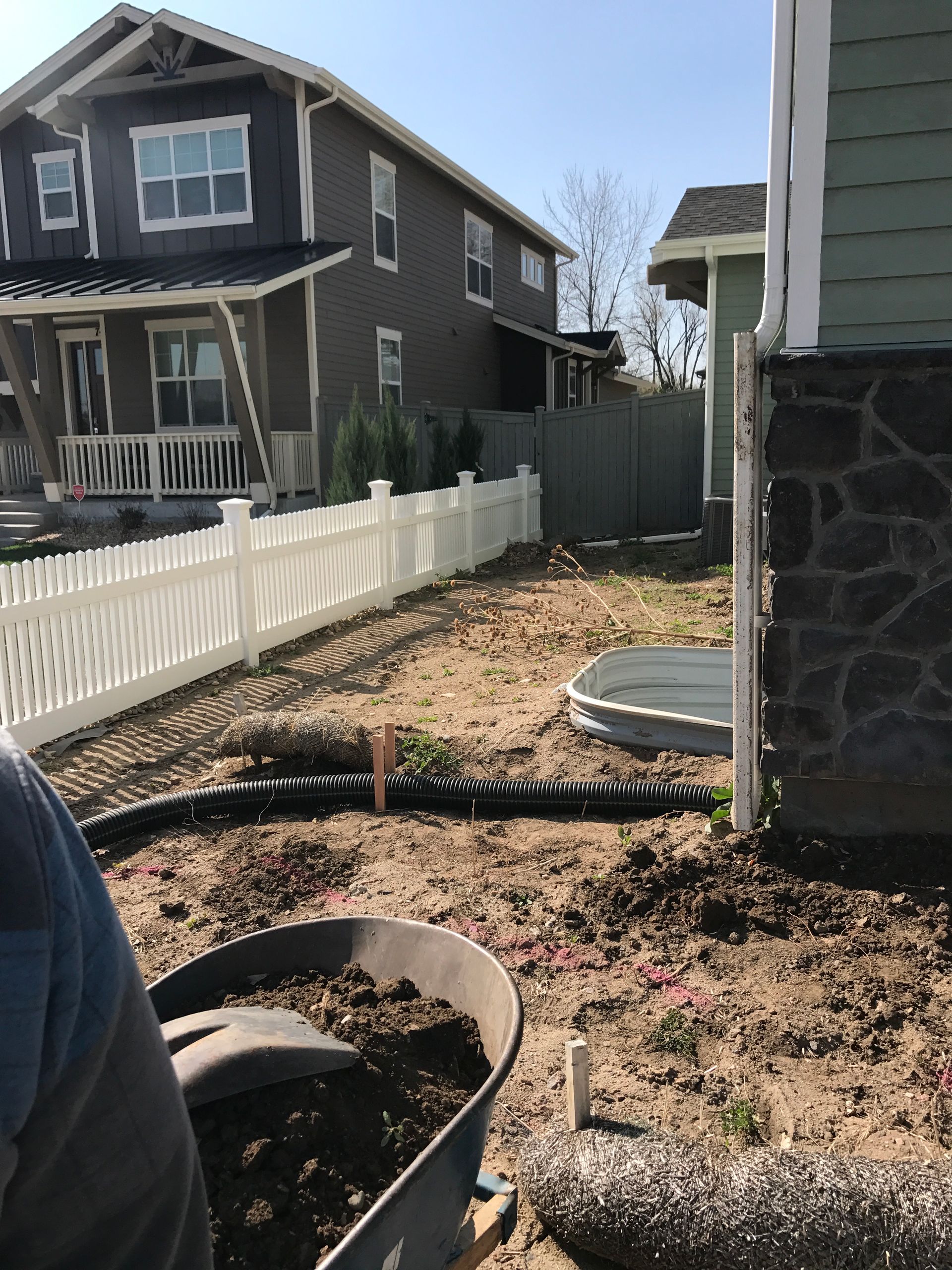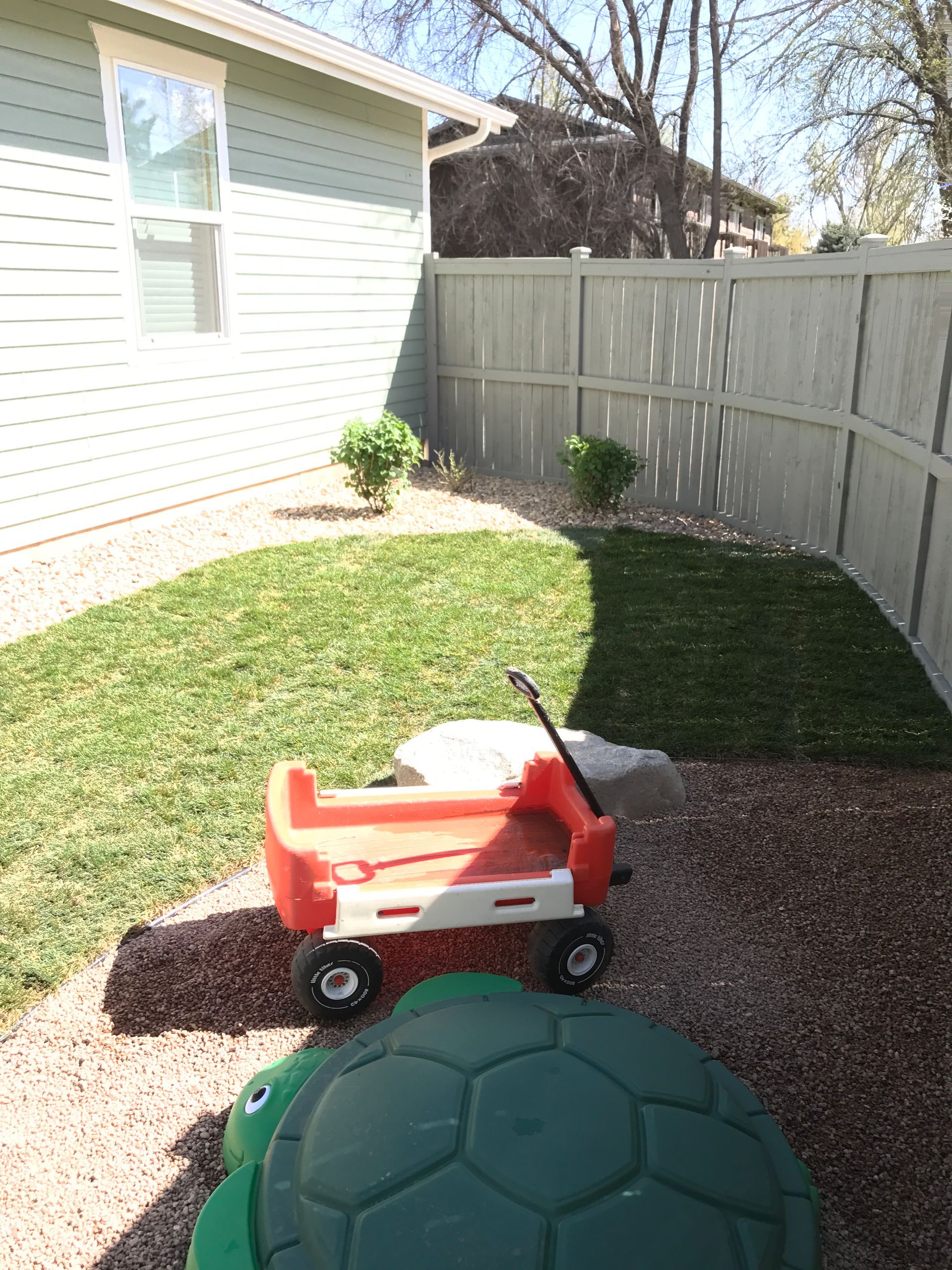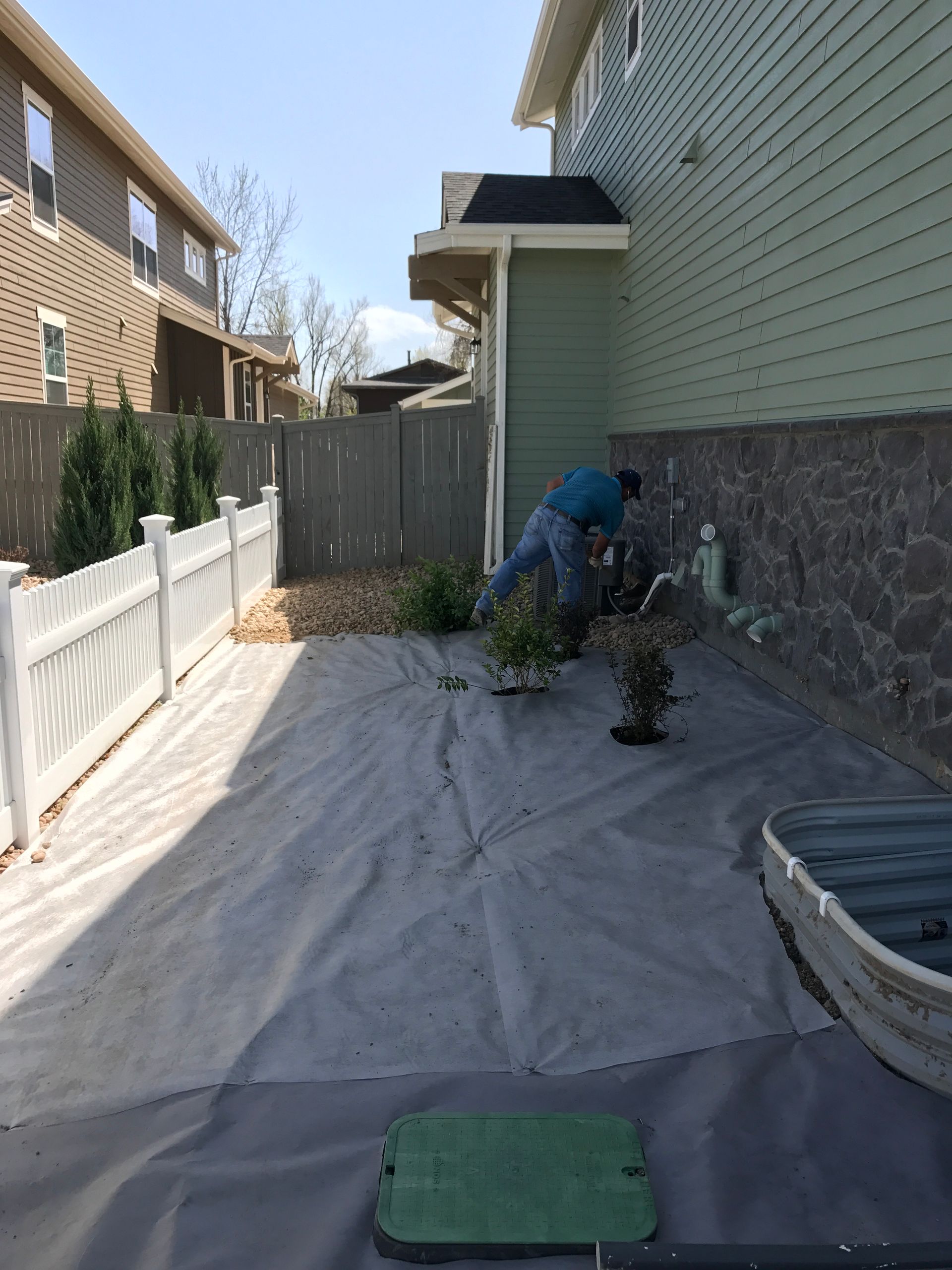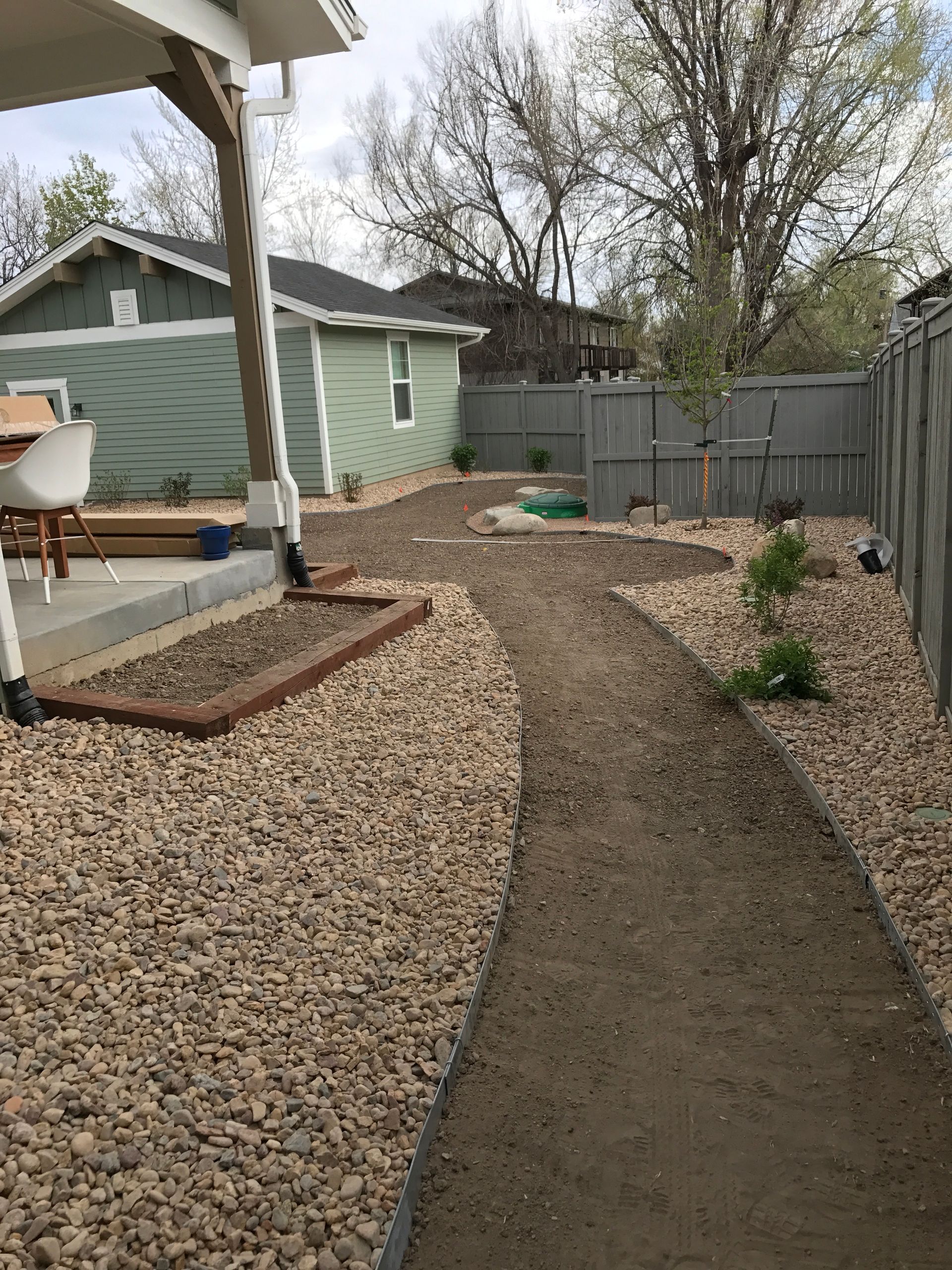 Full landscape remodel with decorative rock, plantings, sprinklers and grass. Lafayette, CO 2019