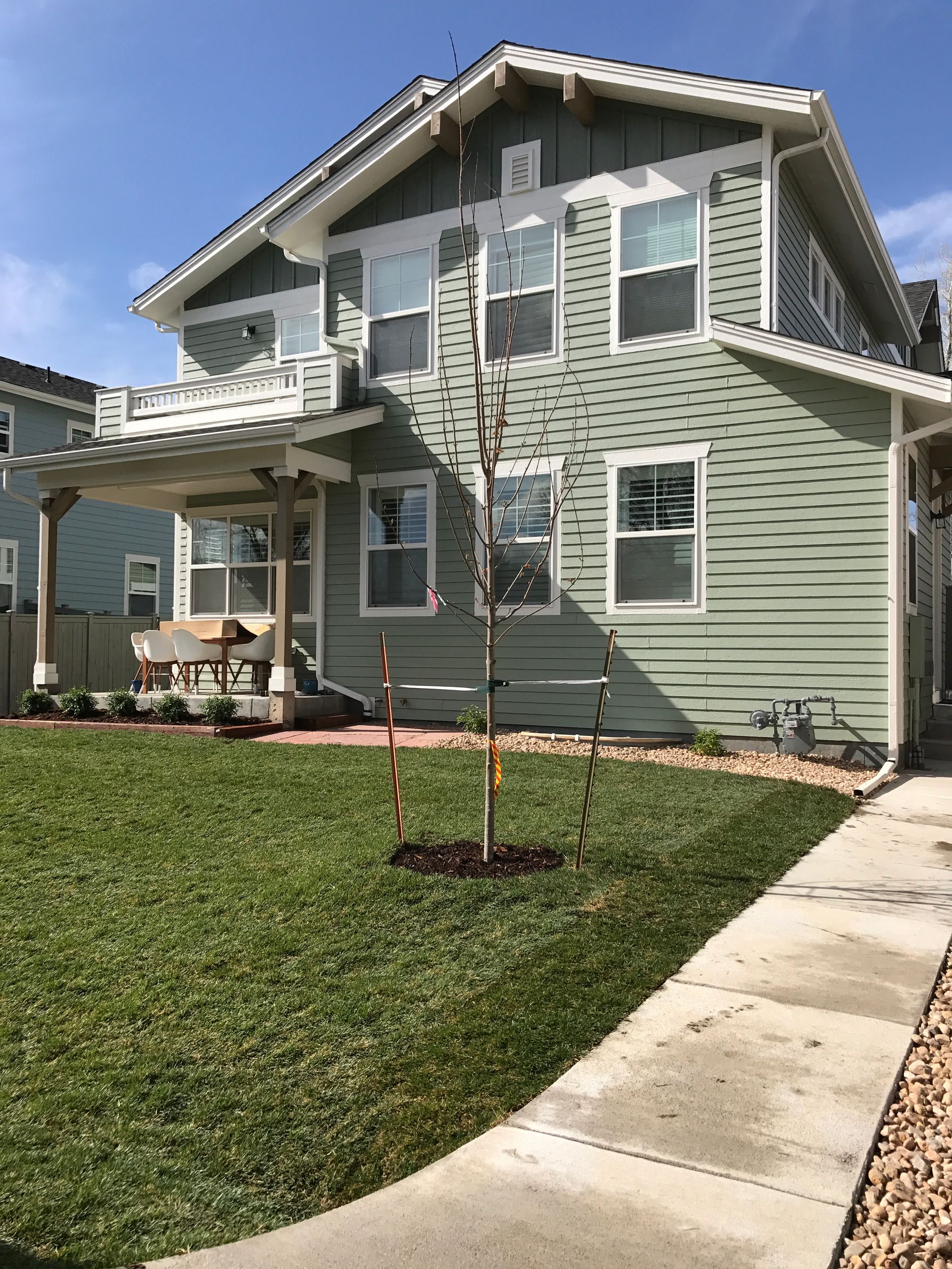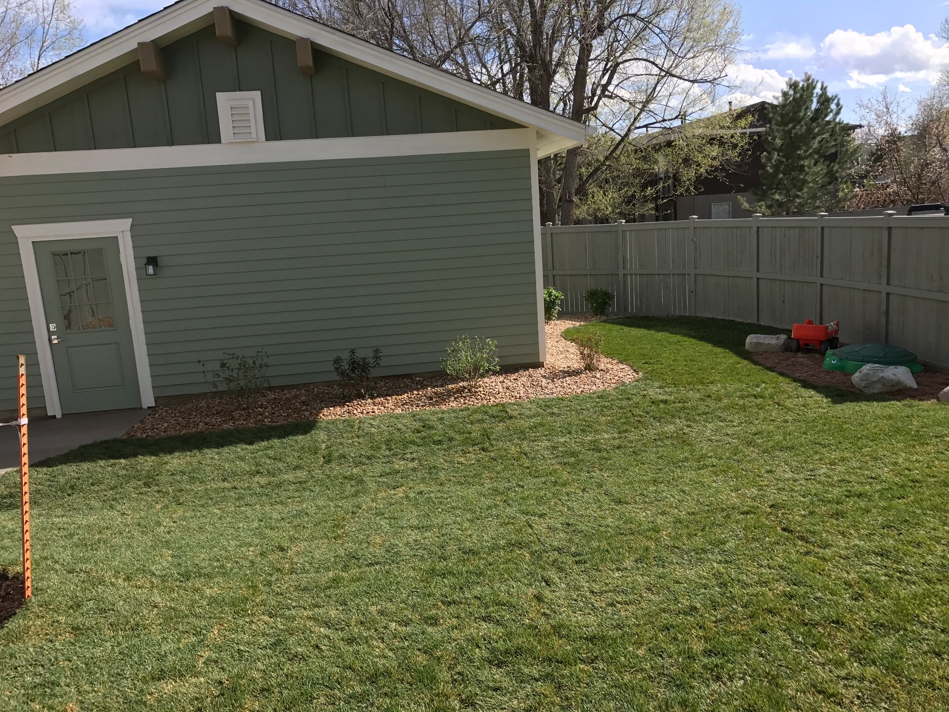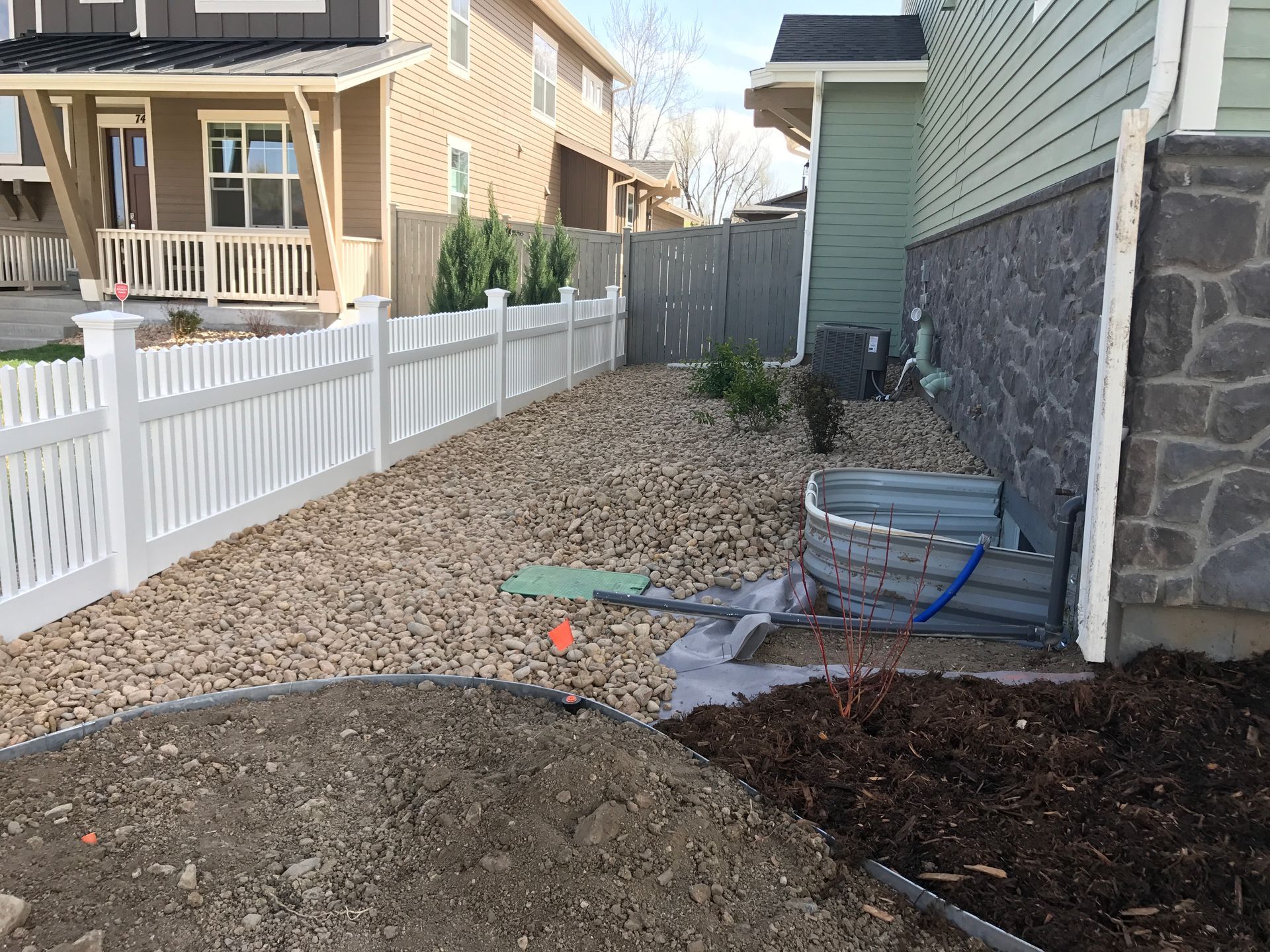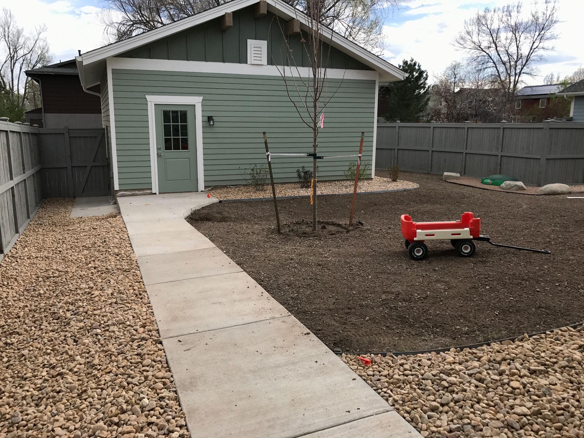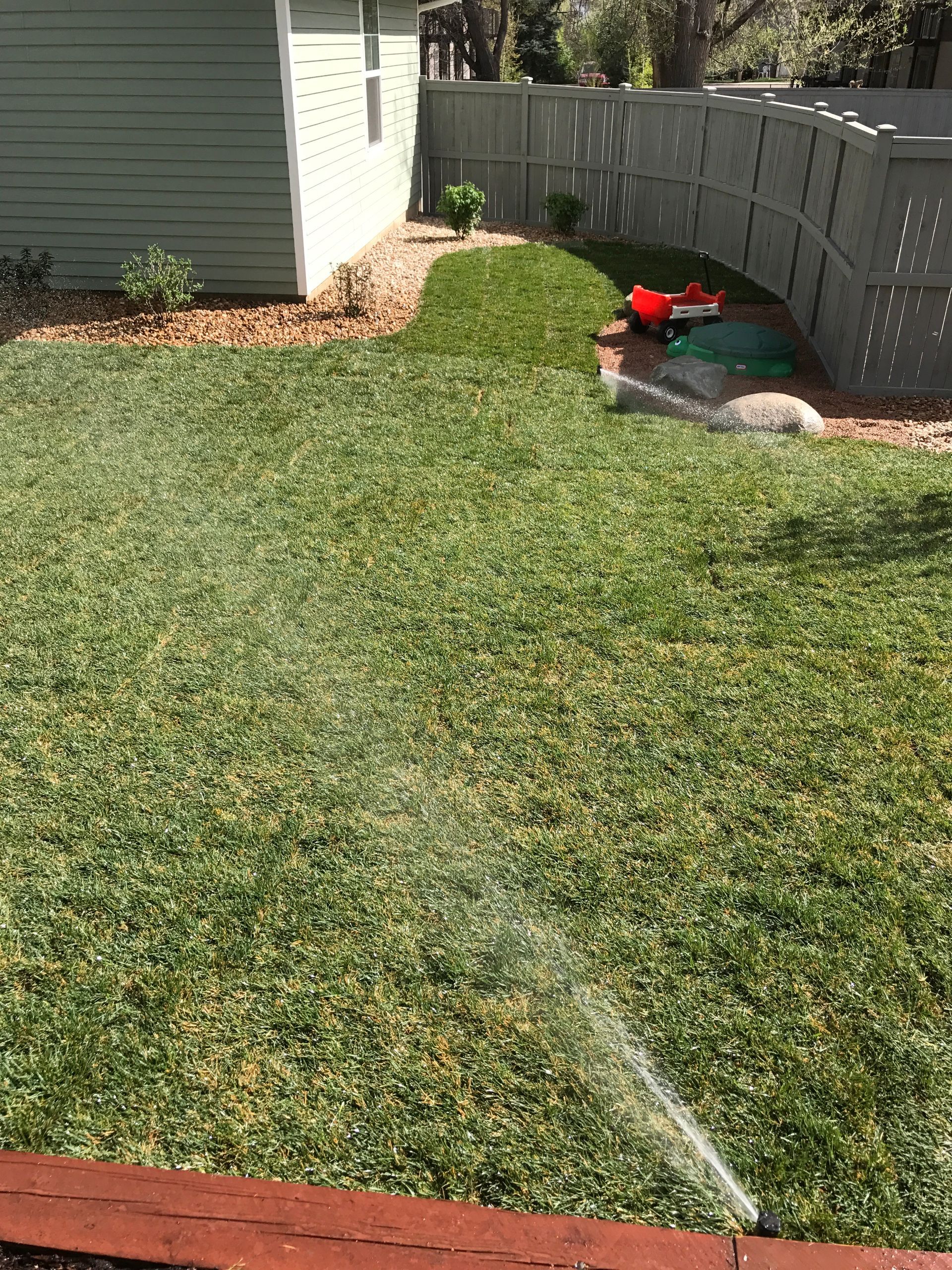 Full landscape remodel with decorative rock, plantings, sprinklers and grass. Lafayette, CO 2019