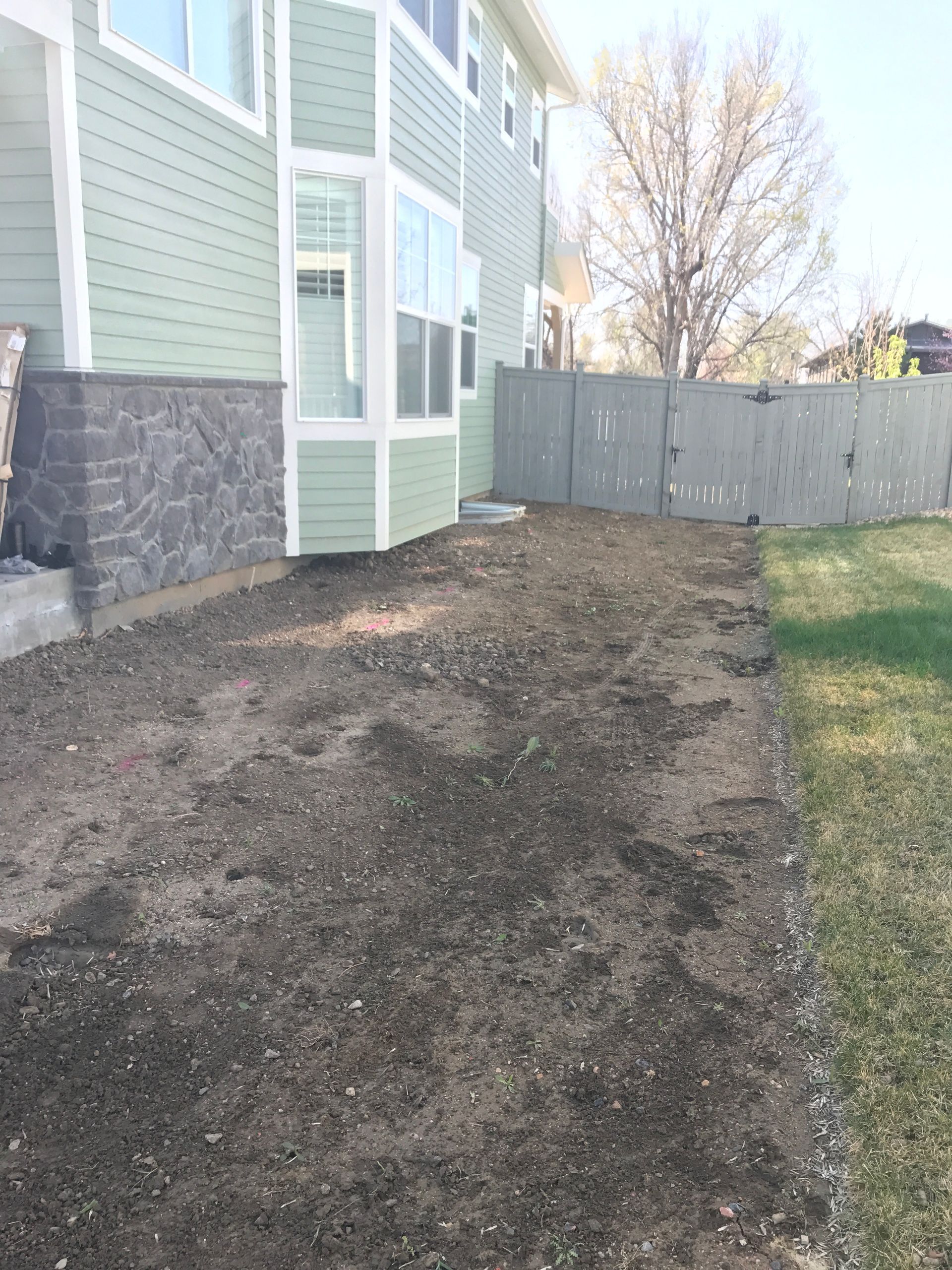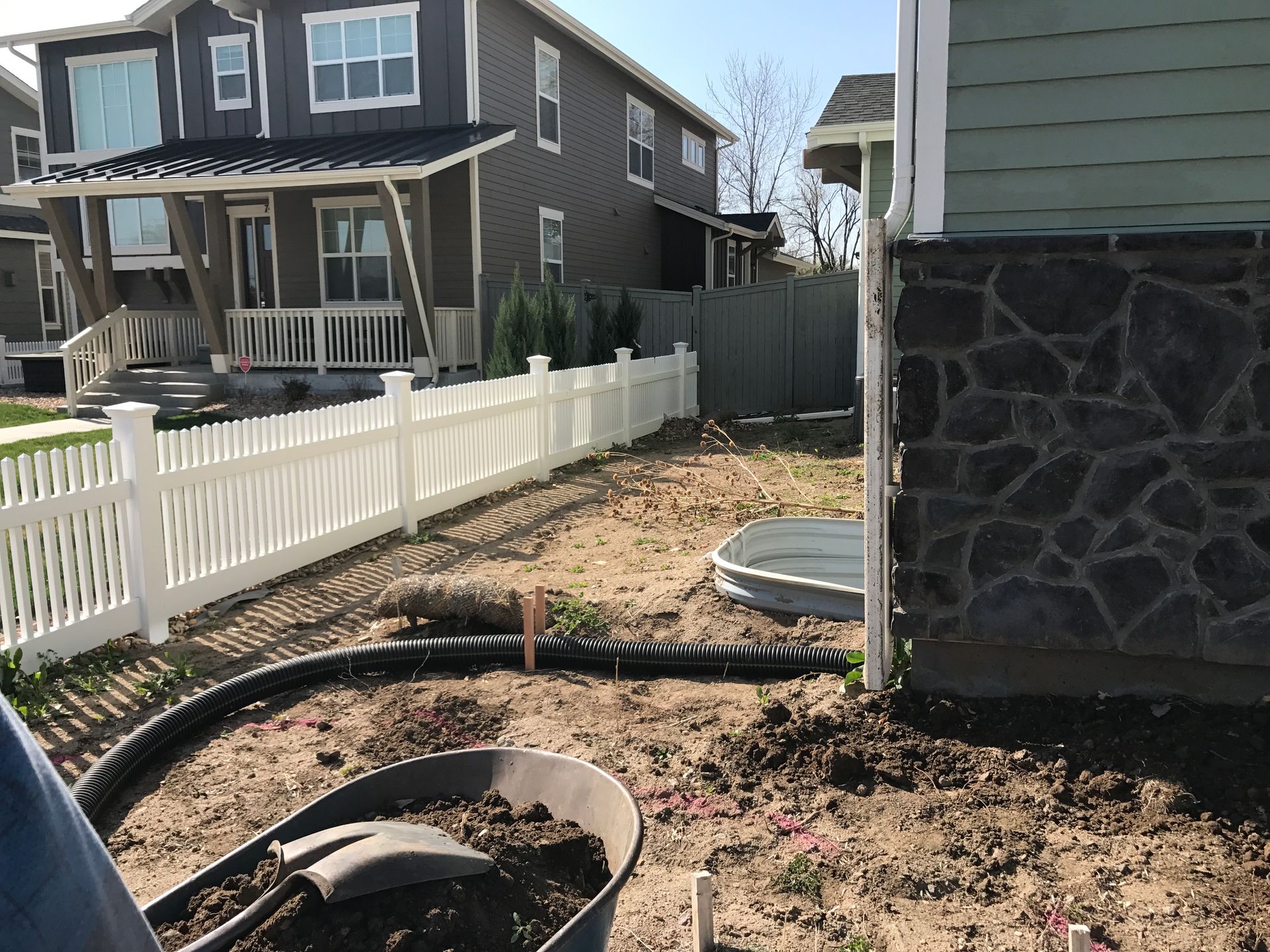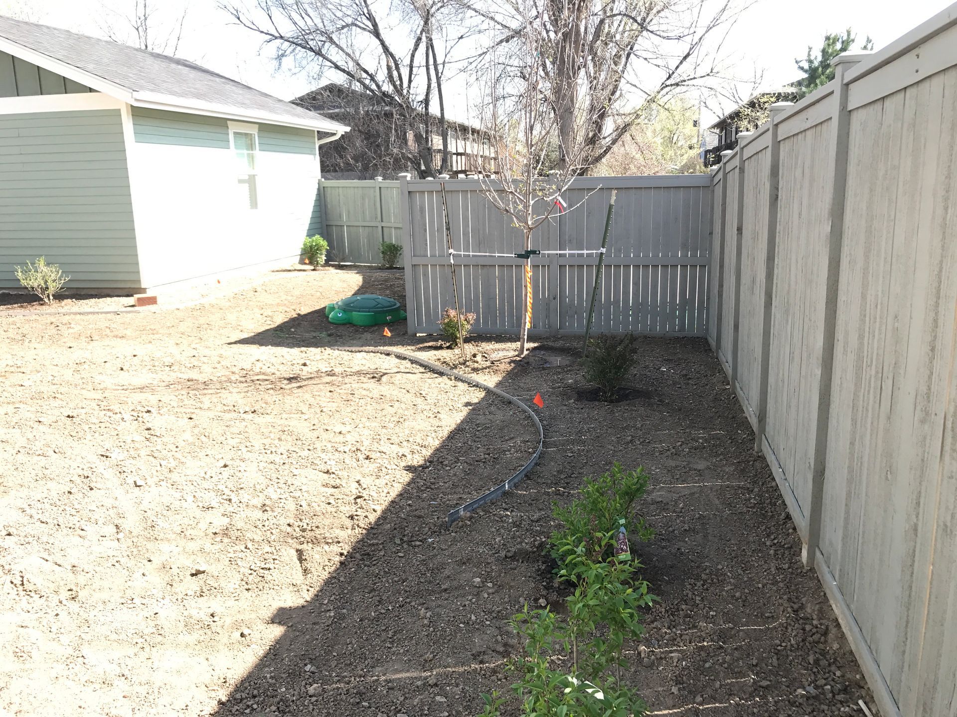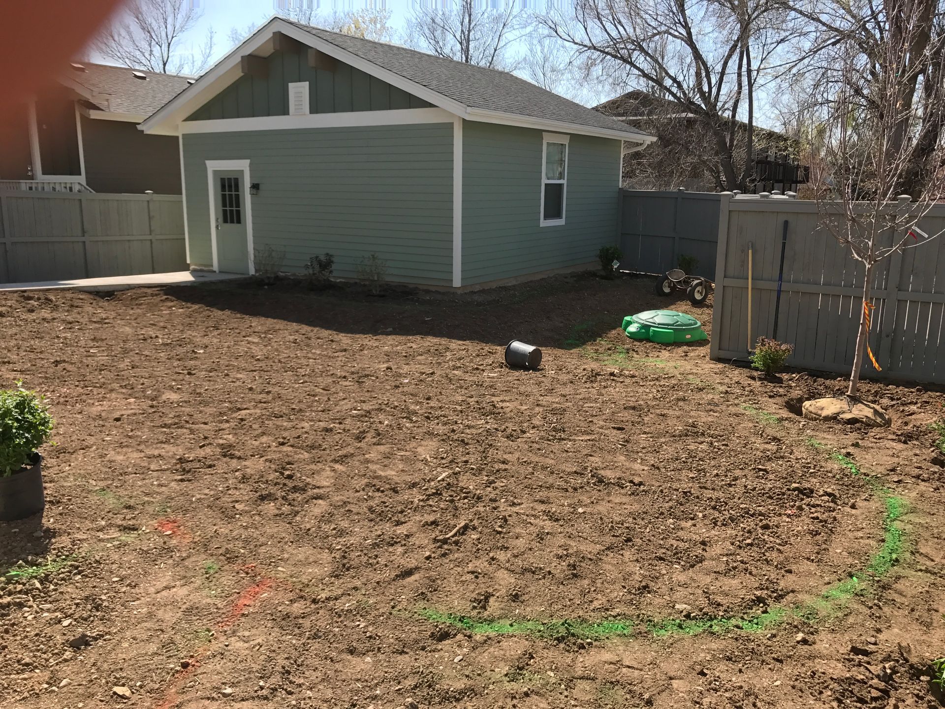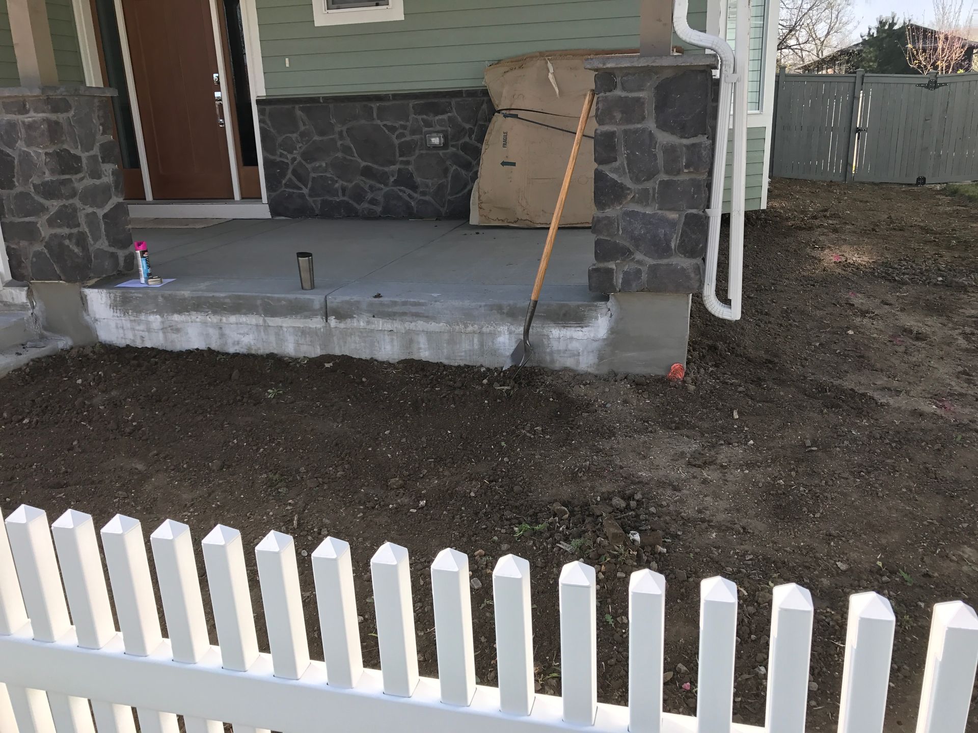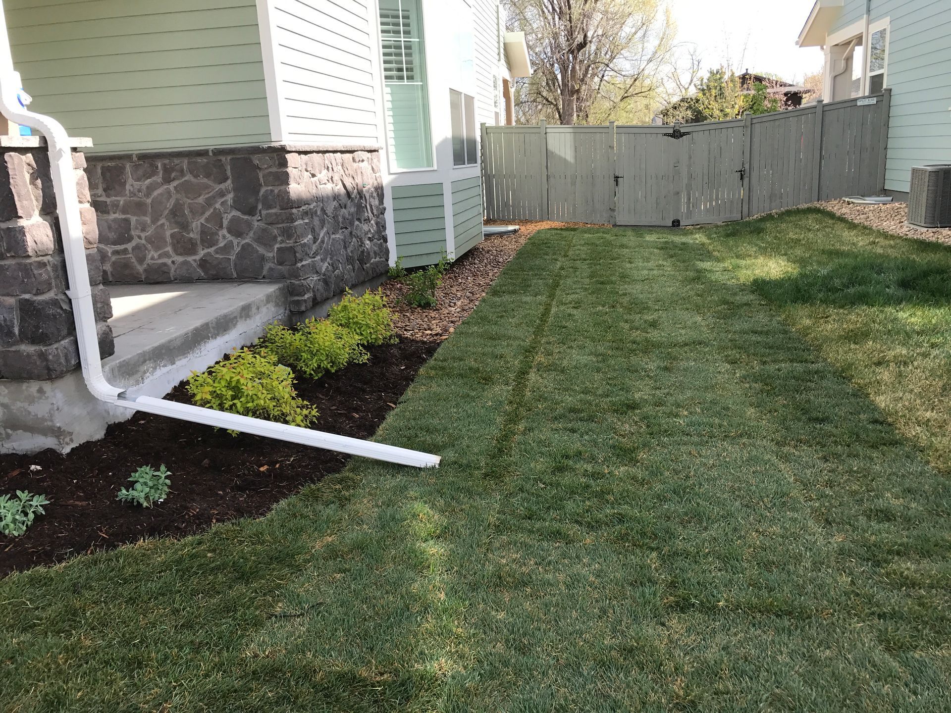 Full landscape remodel with decorative rock, plantings, sprinklers and grass. Lafayette, CO 2019