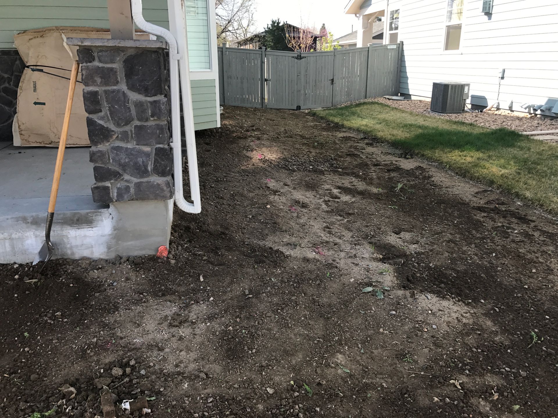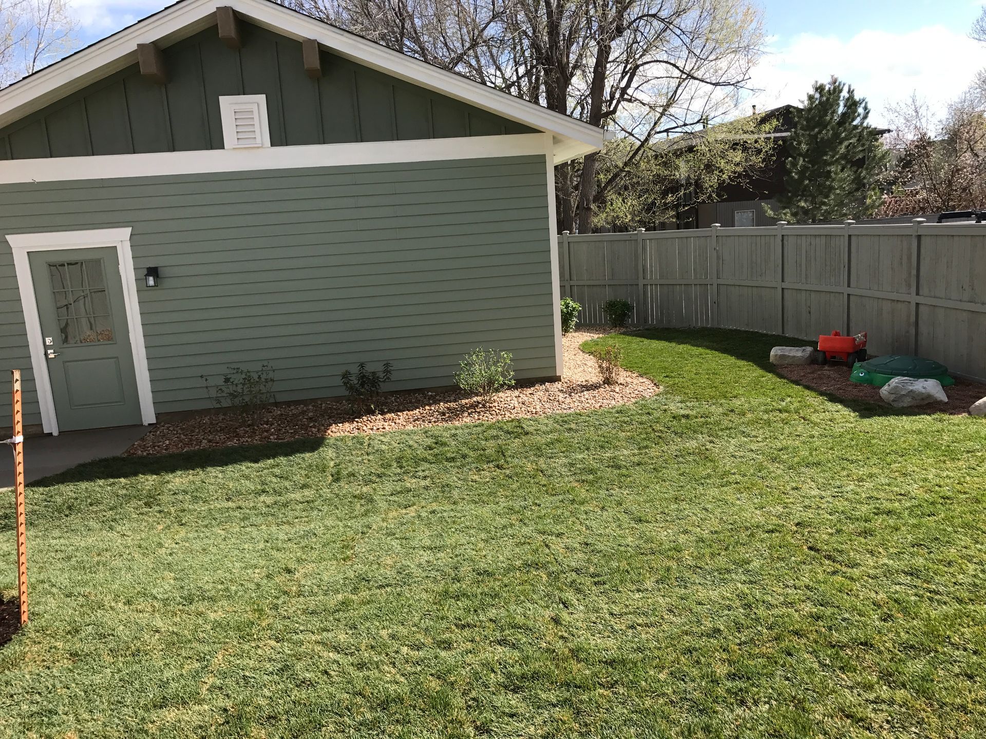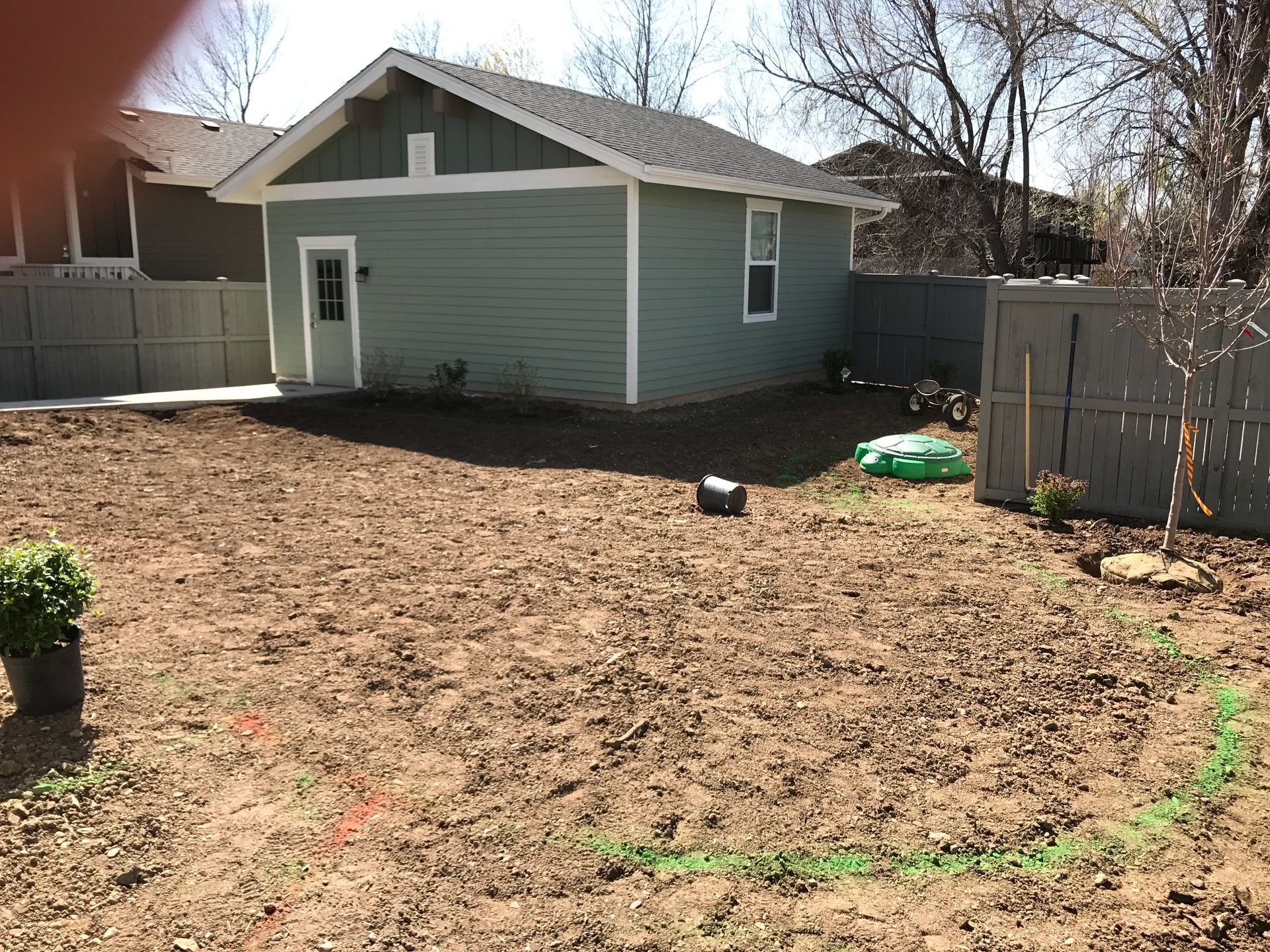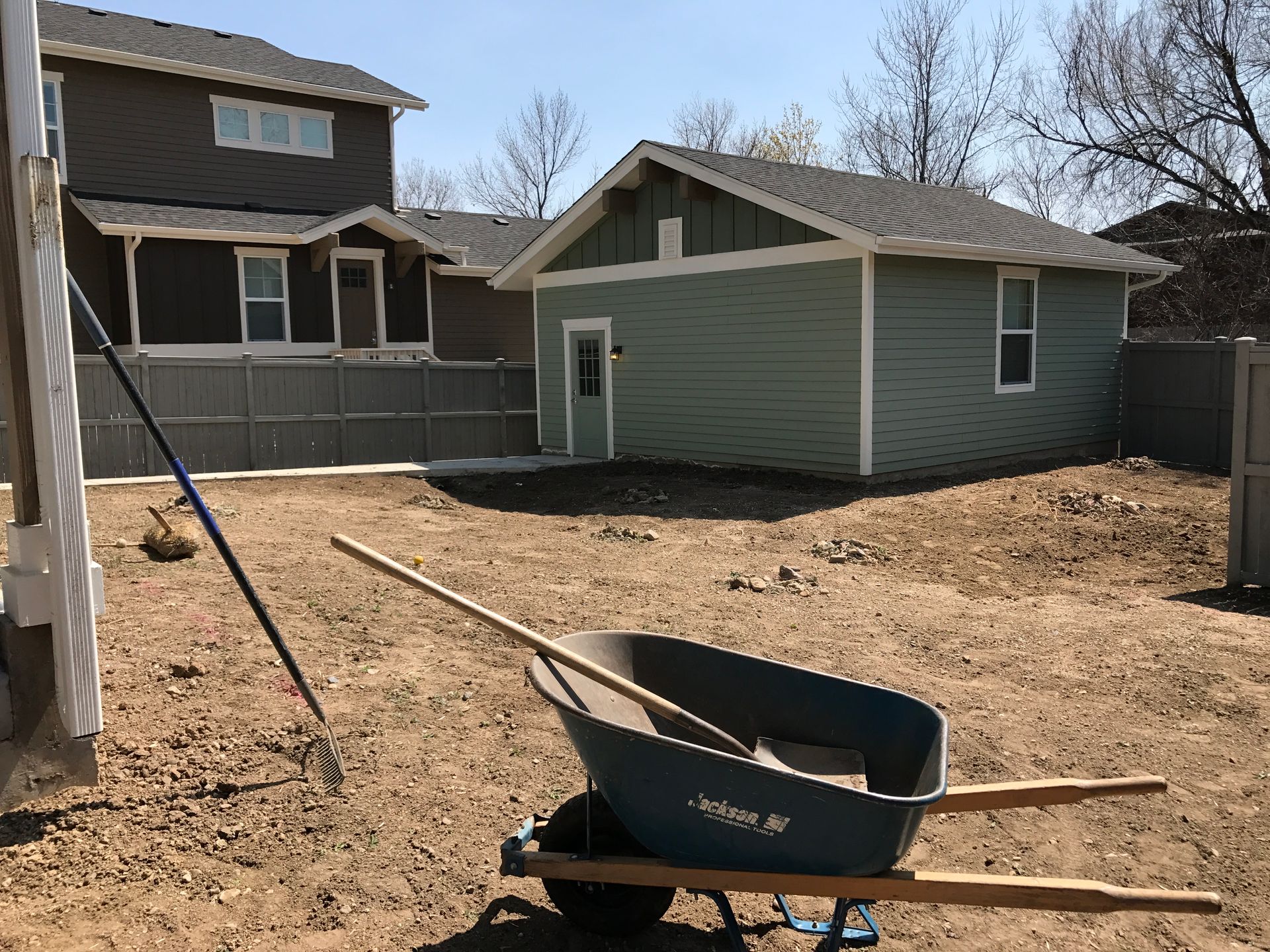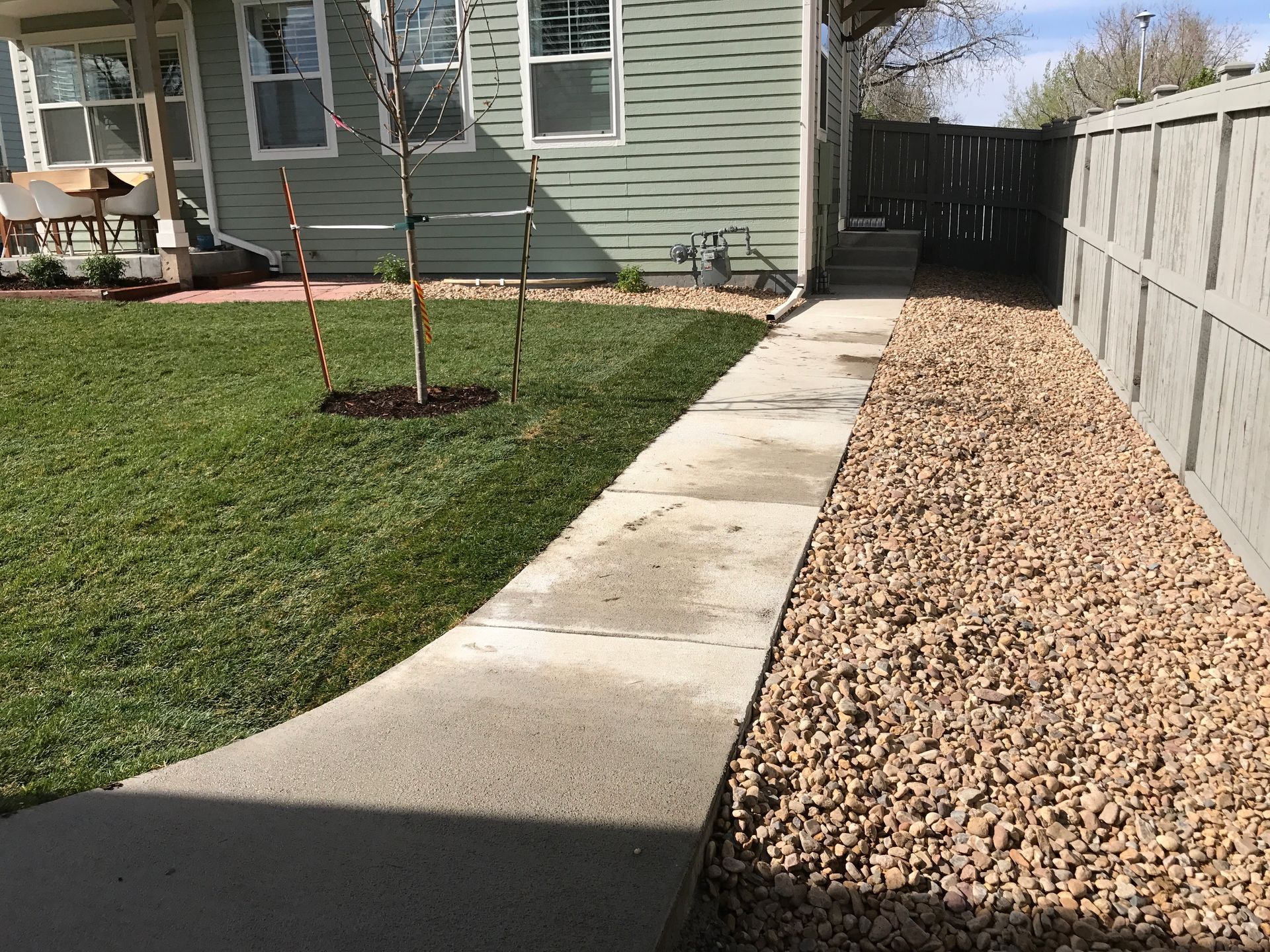Full landscape remodel with decorative rock, plantings, sprinklers and grass. Lafayette, CO 2019