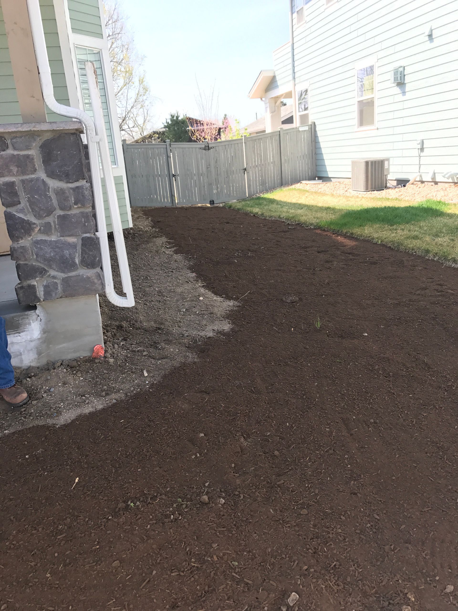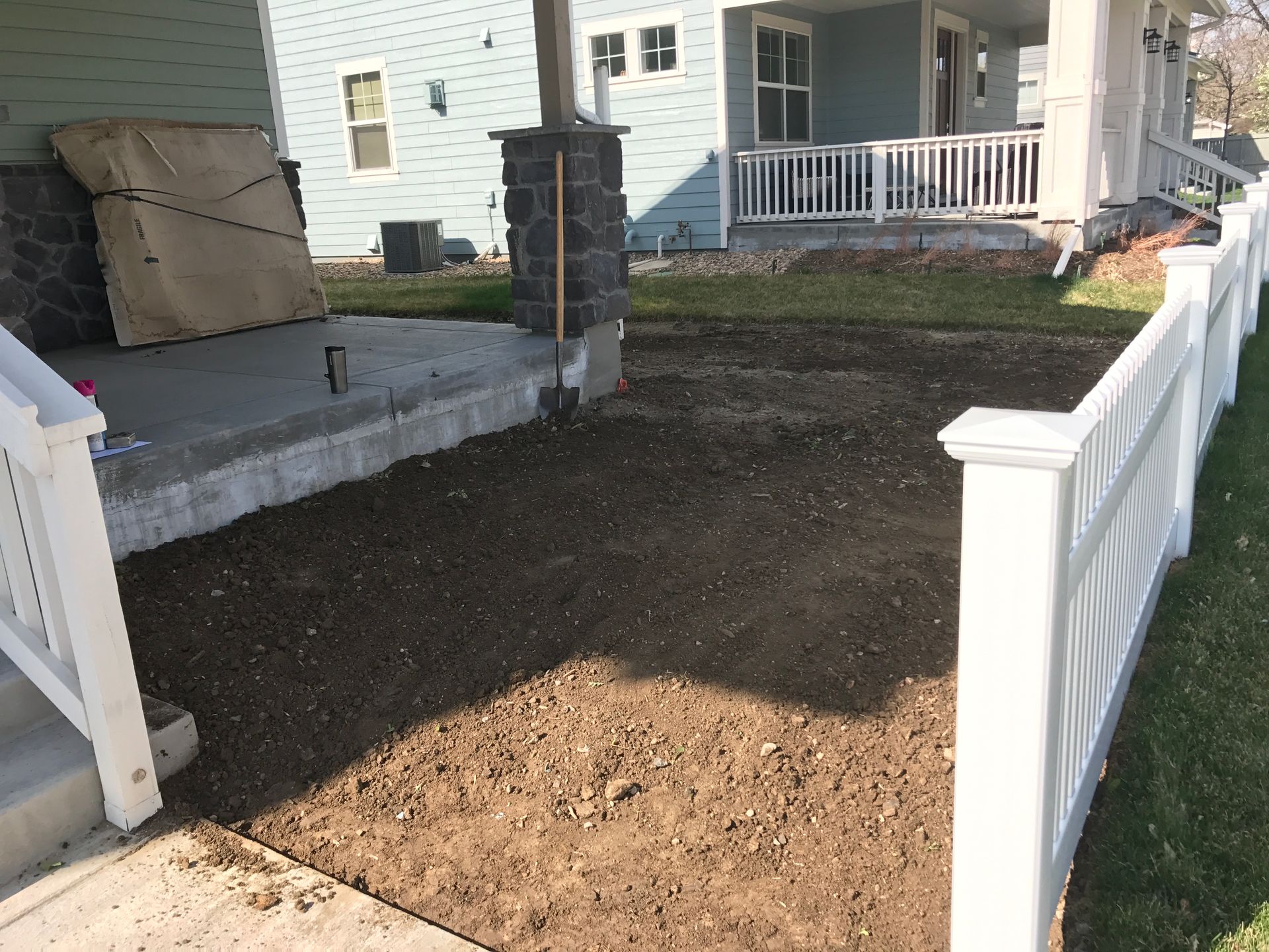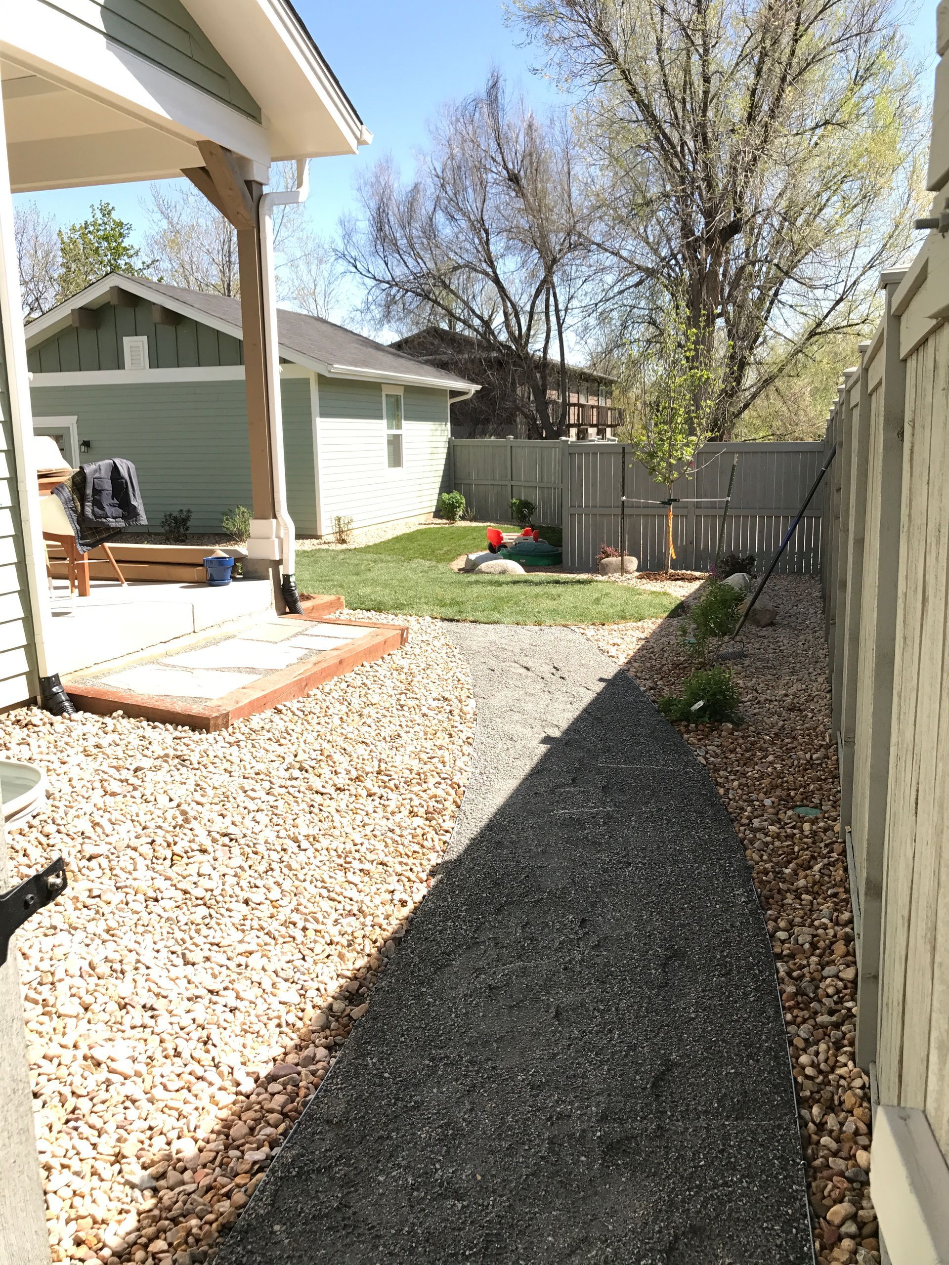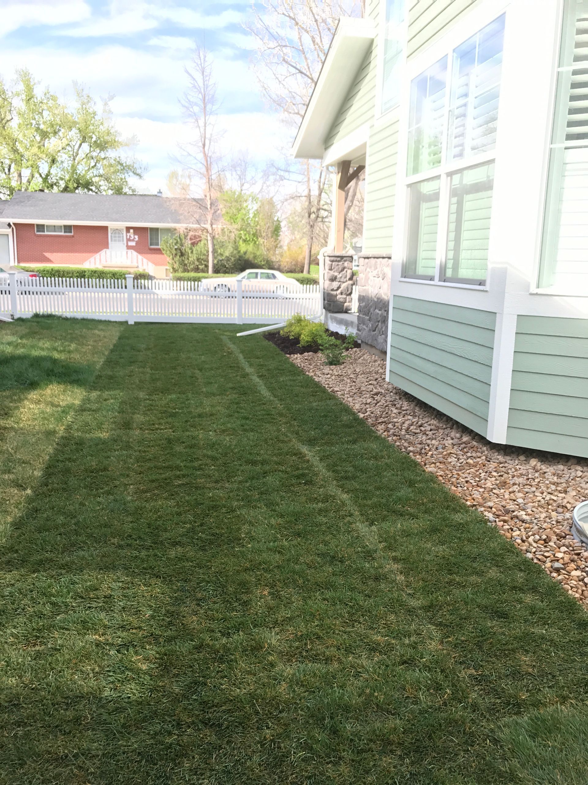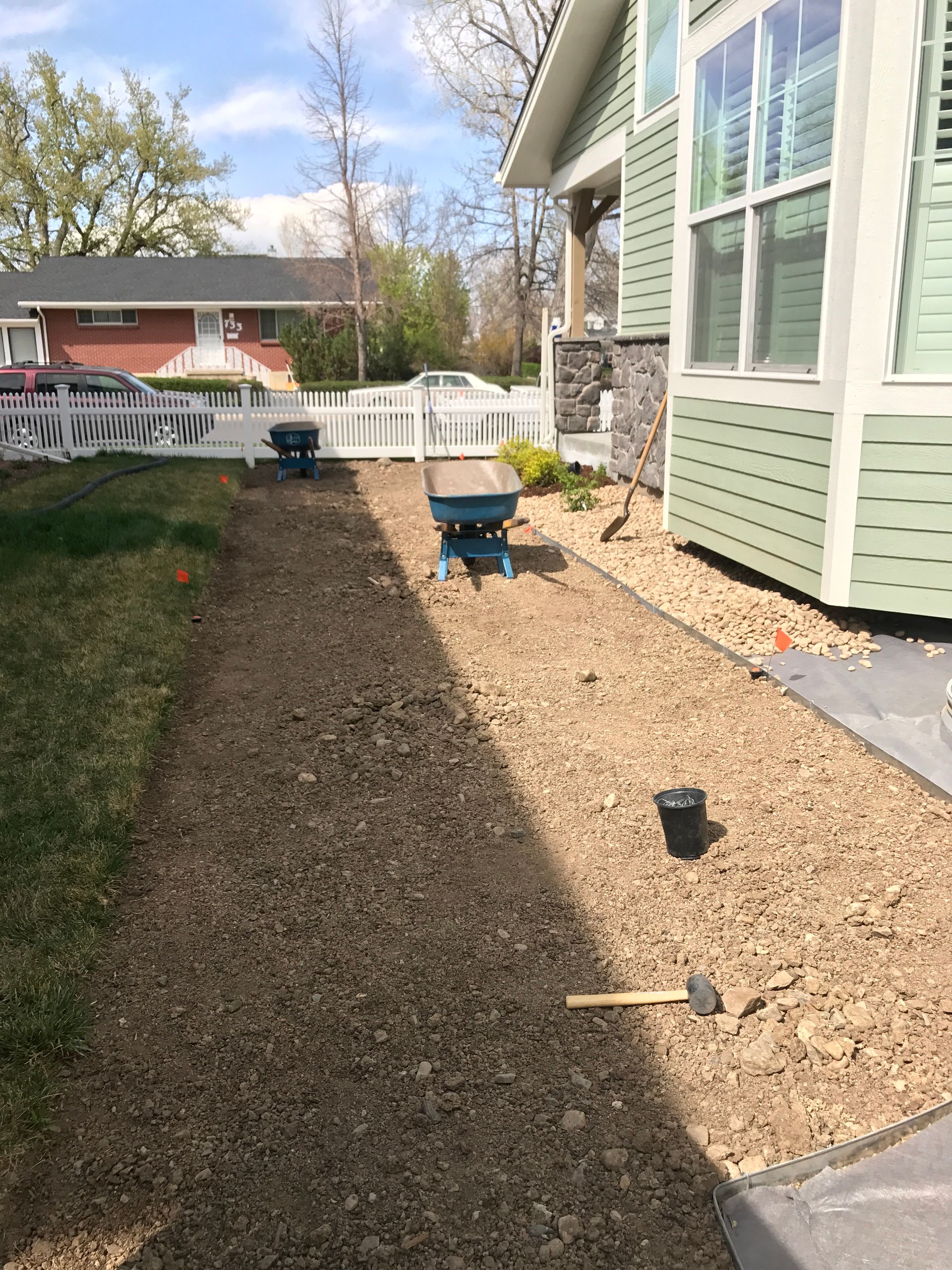 Full landscape remodel with decorative rock, plantings, sprinklers and grass. Lafayette, CO 2019