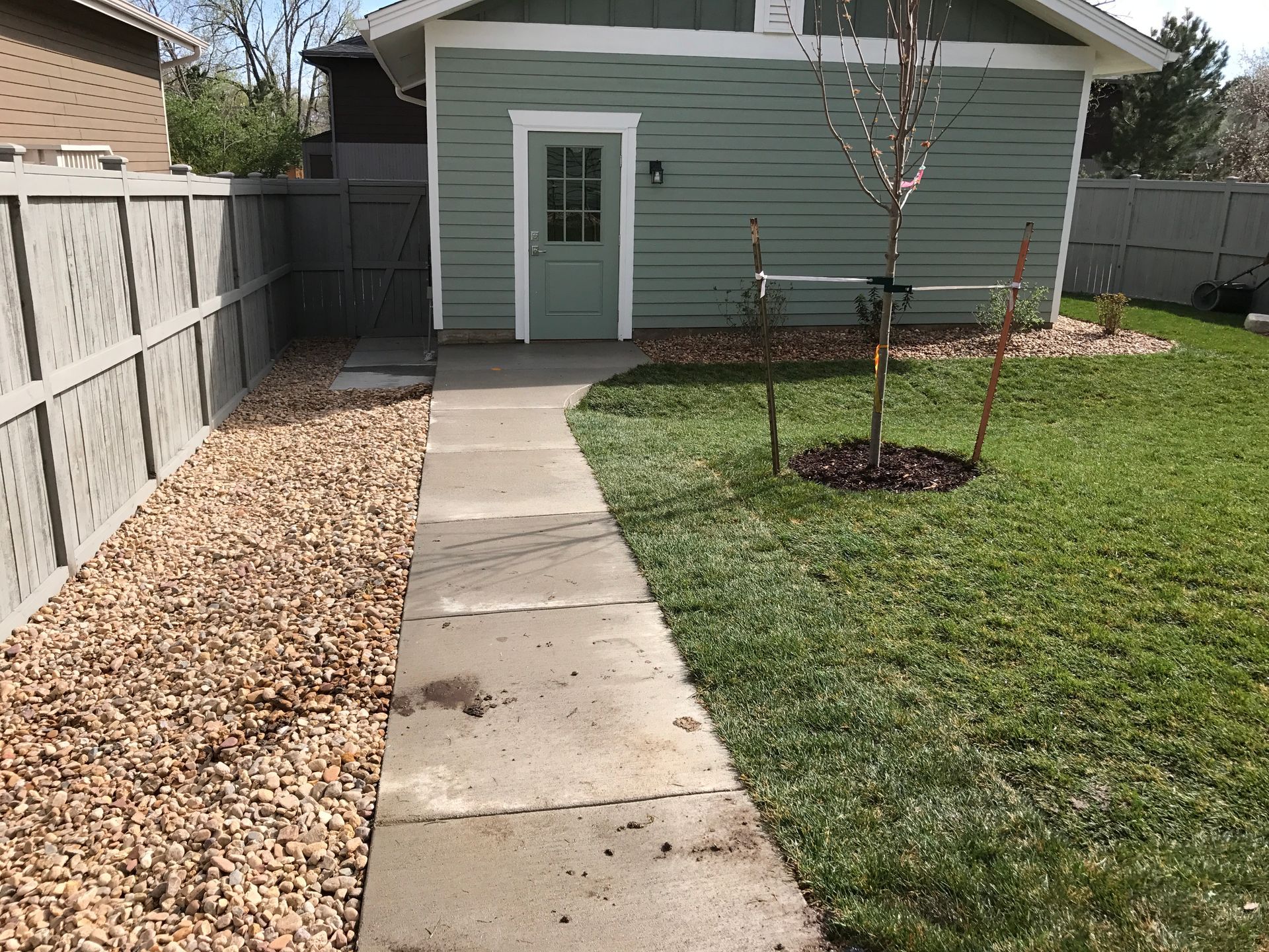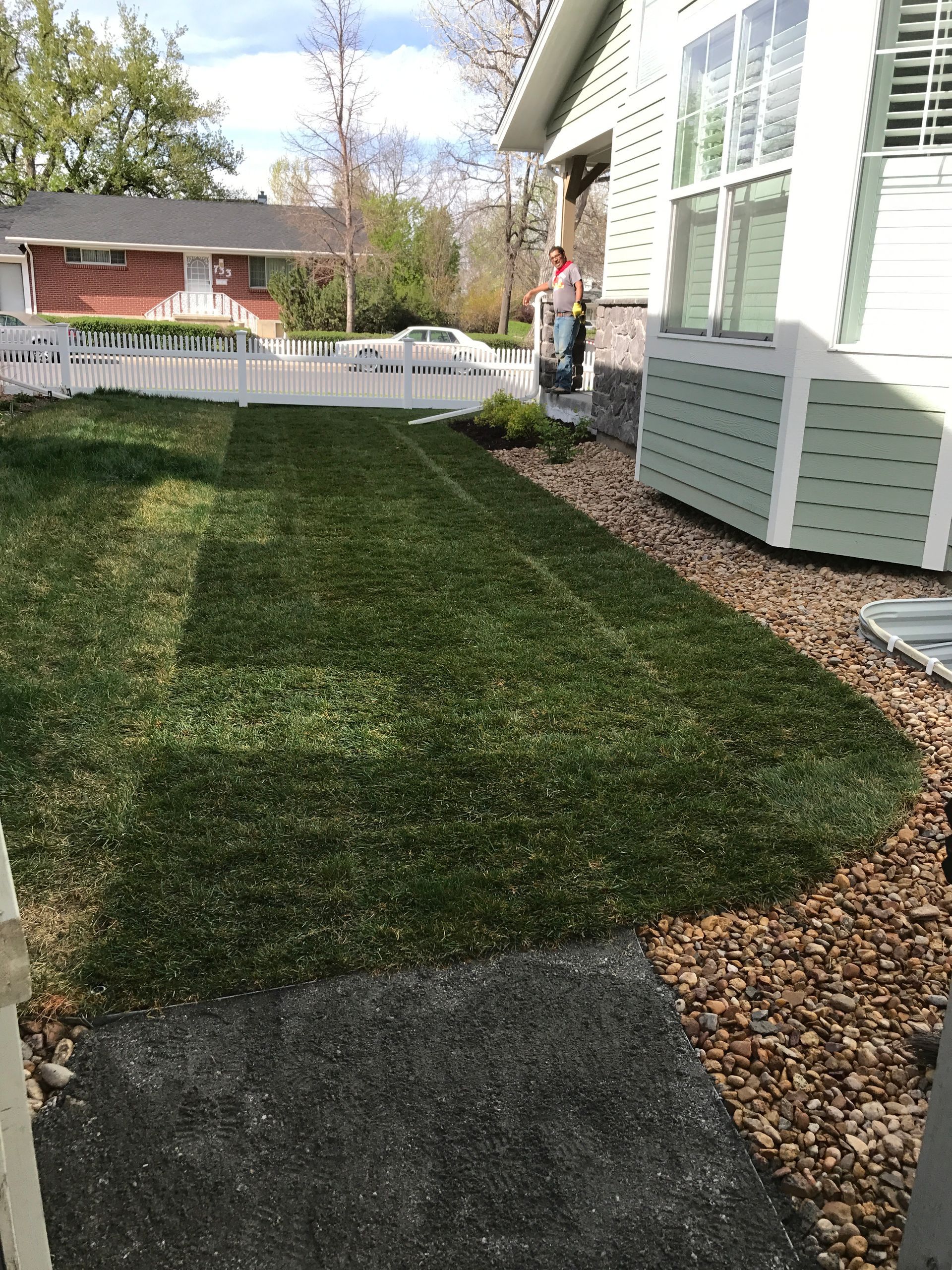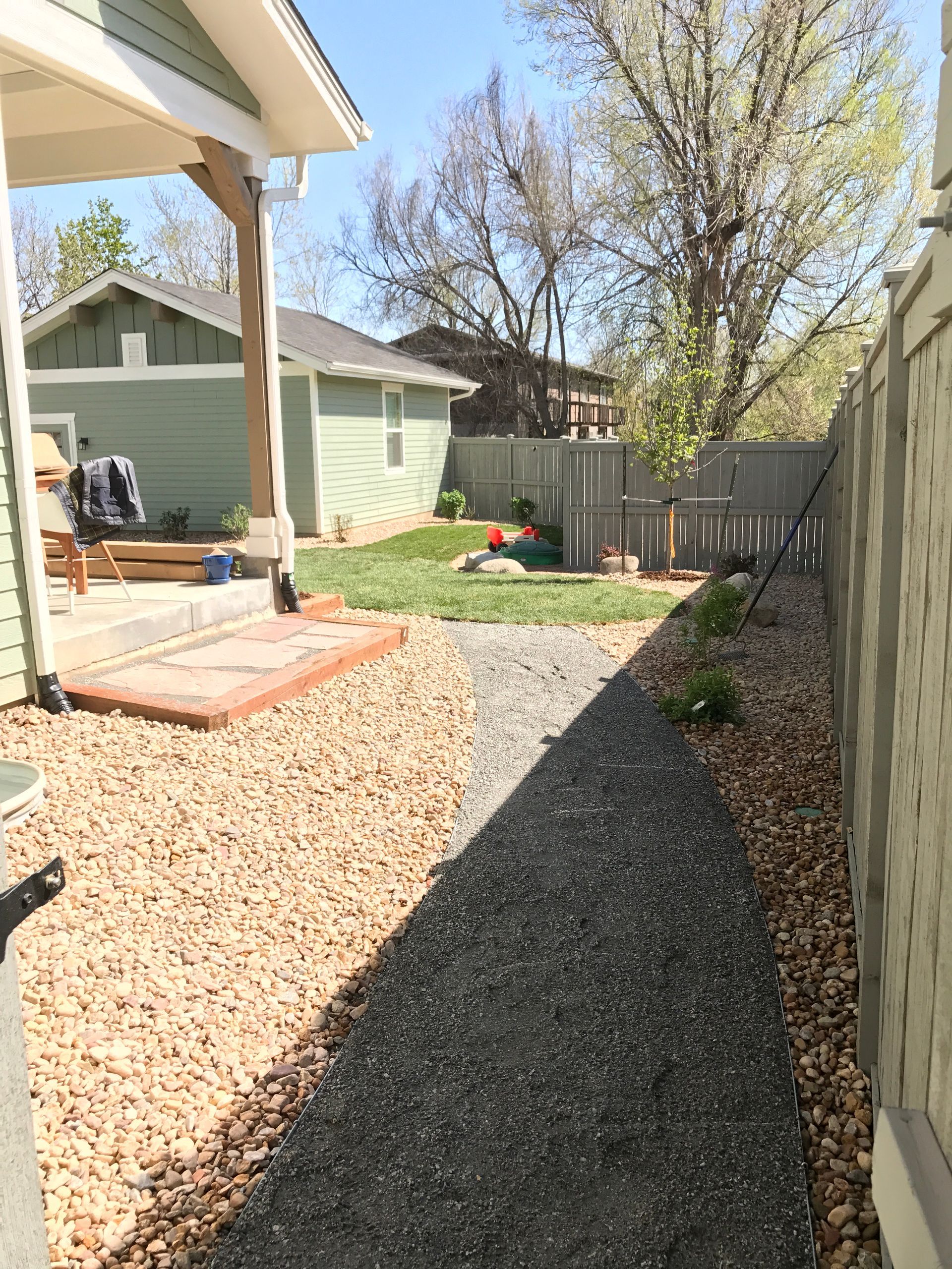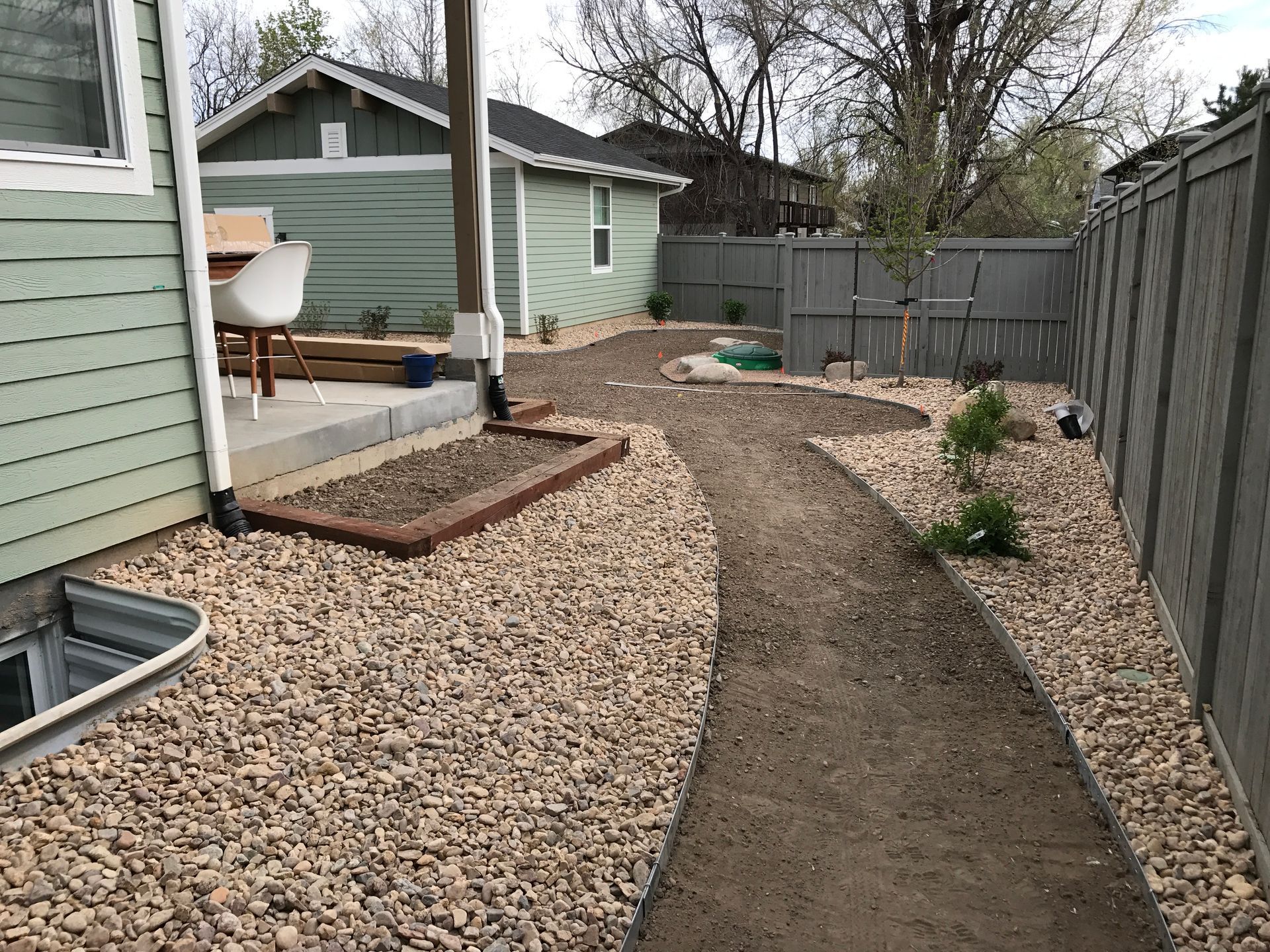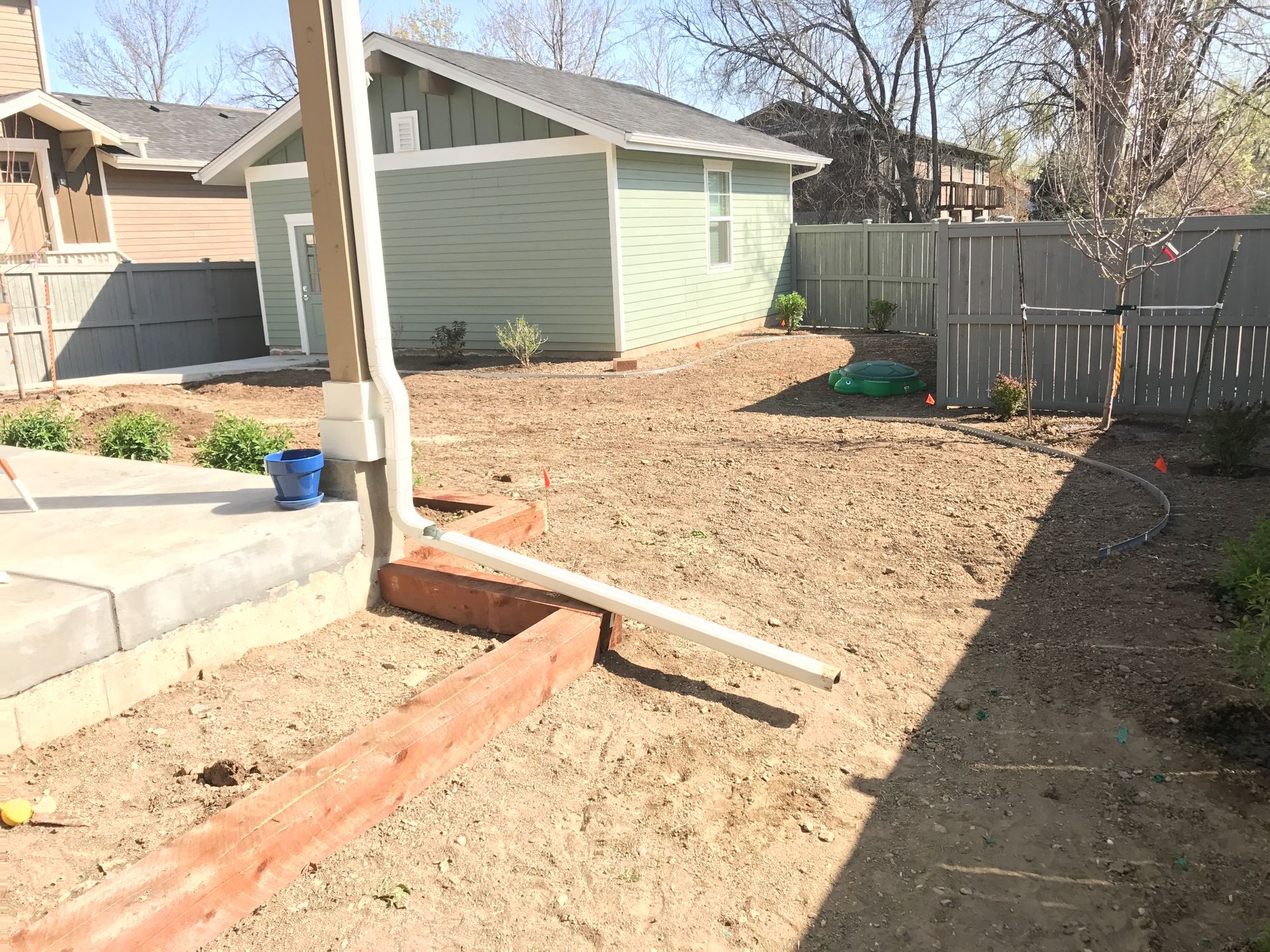 Full landscape remodel with decorative rock, plantings, sprinklers and grass. Lafayette, CO 2019