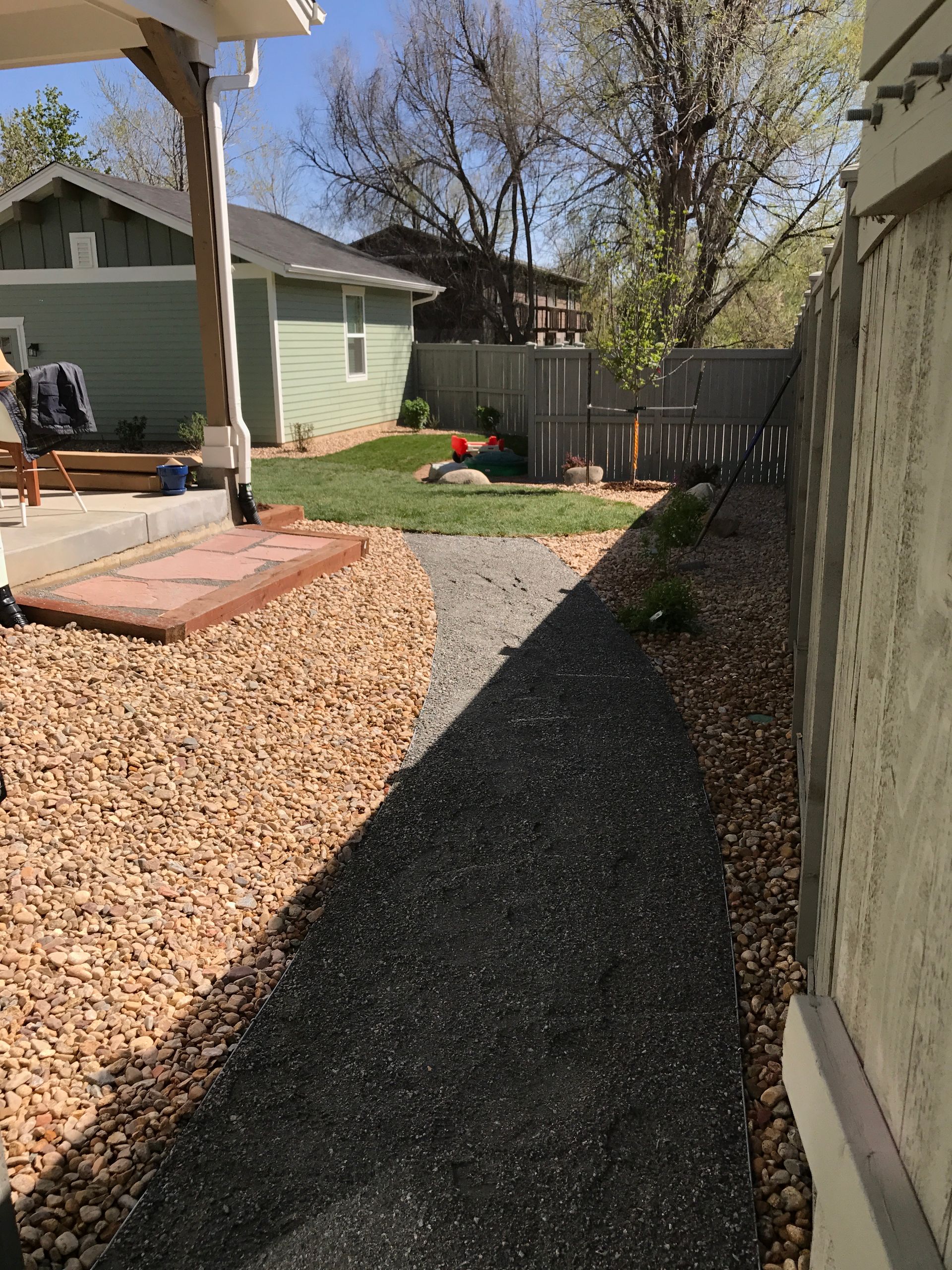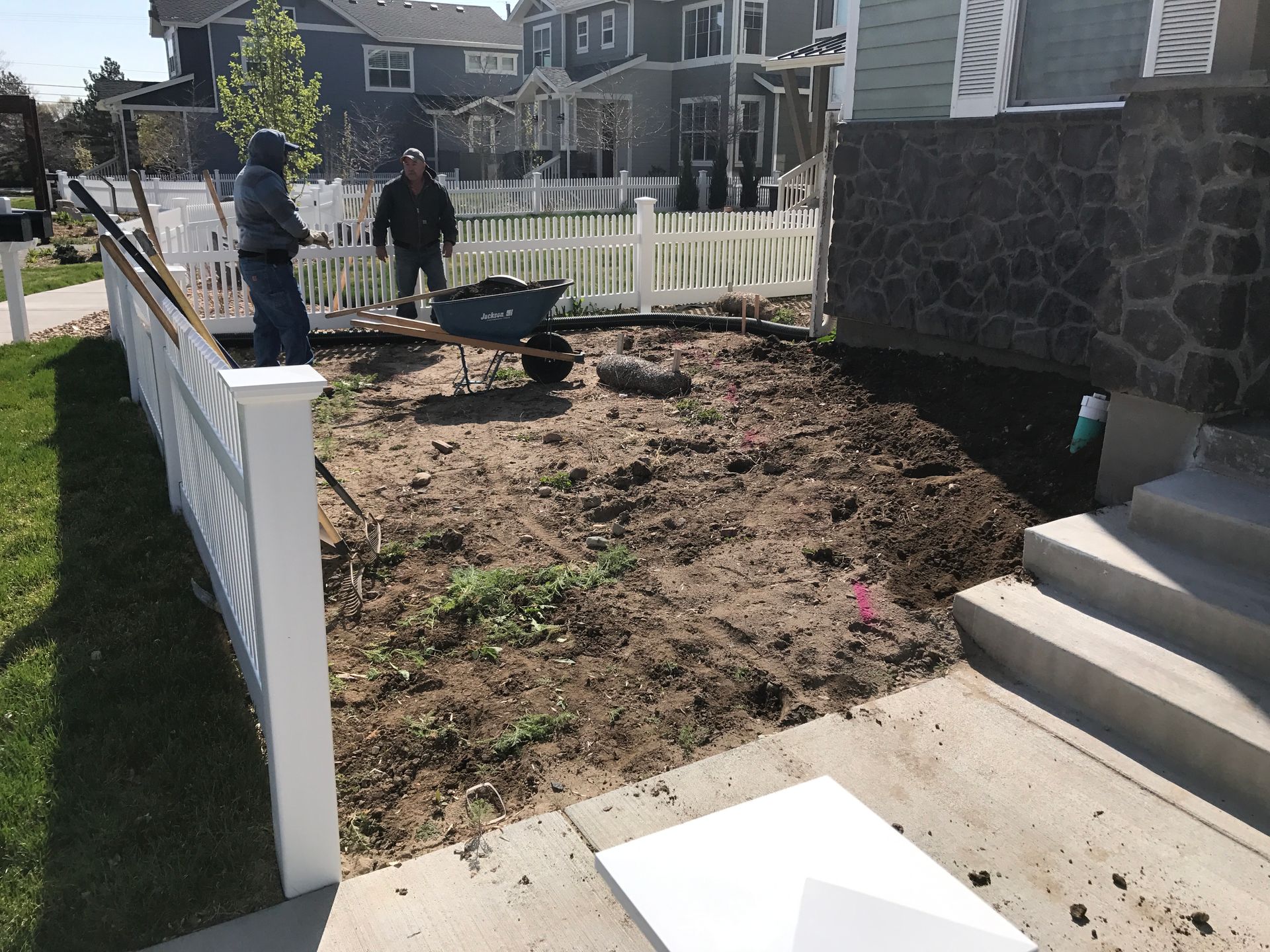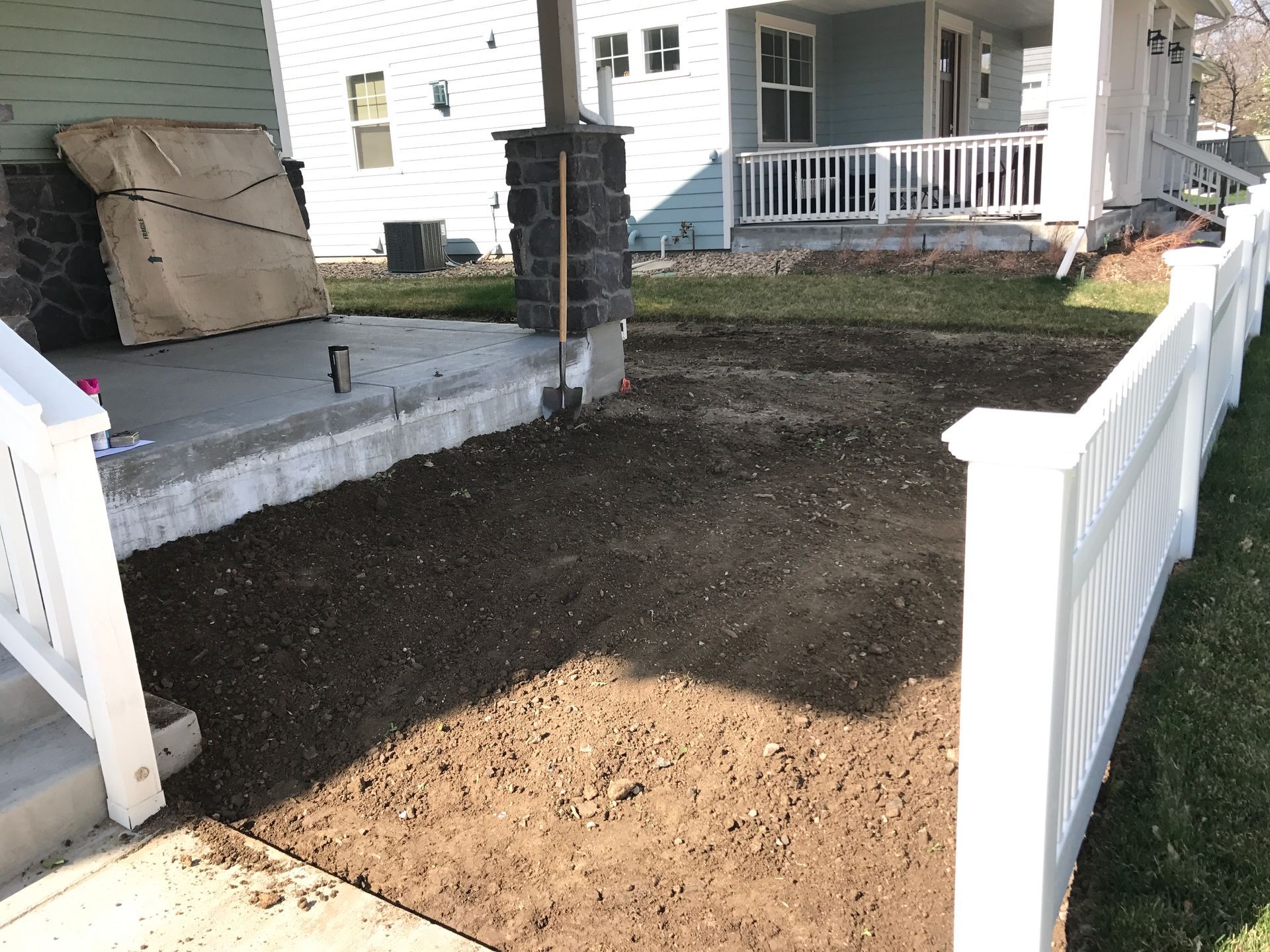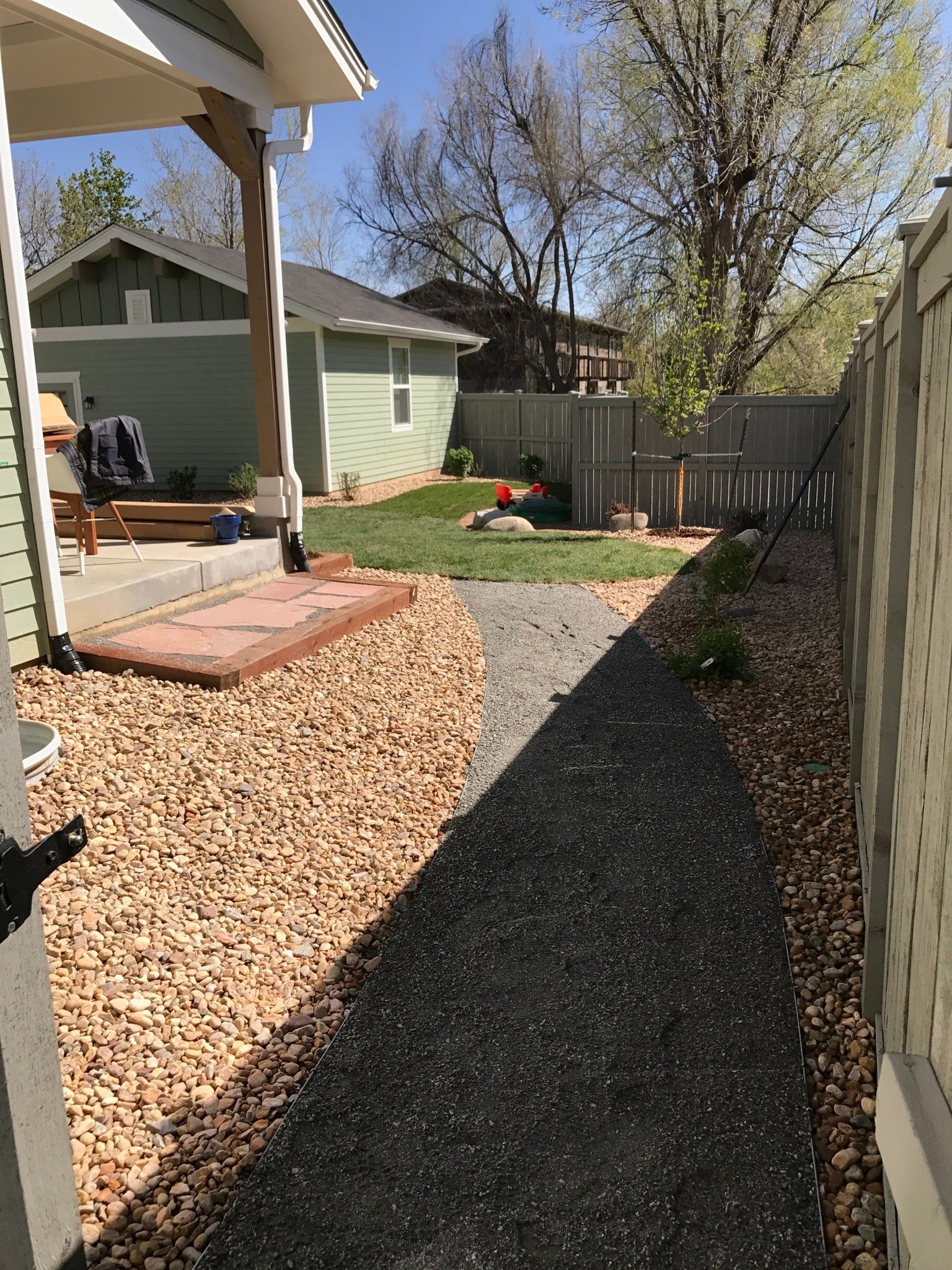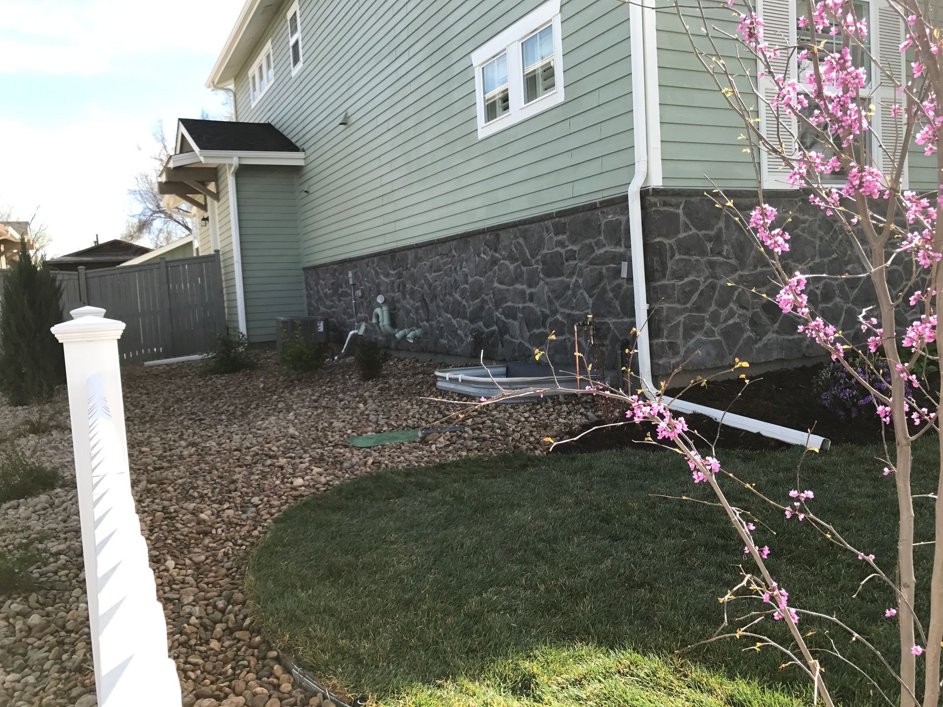 Full landscape remodel with decorative rock, plantings, sprinklers and grass. Lafayette, CO 2019