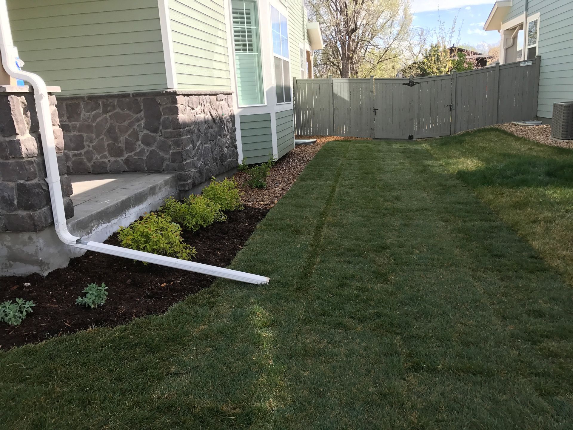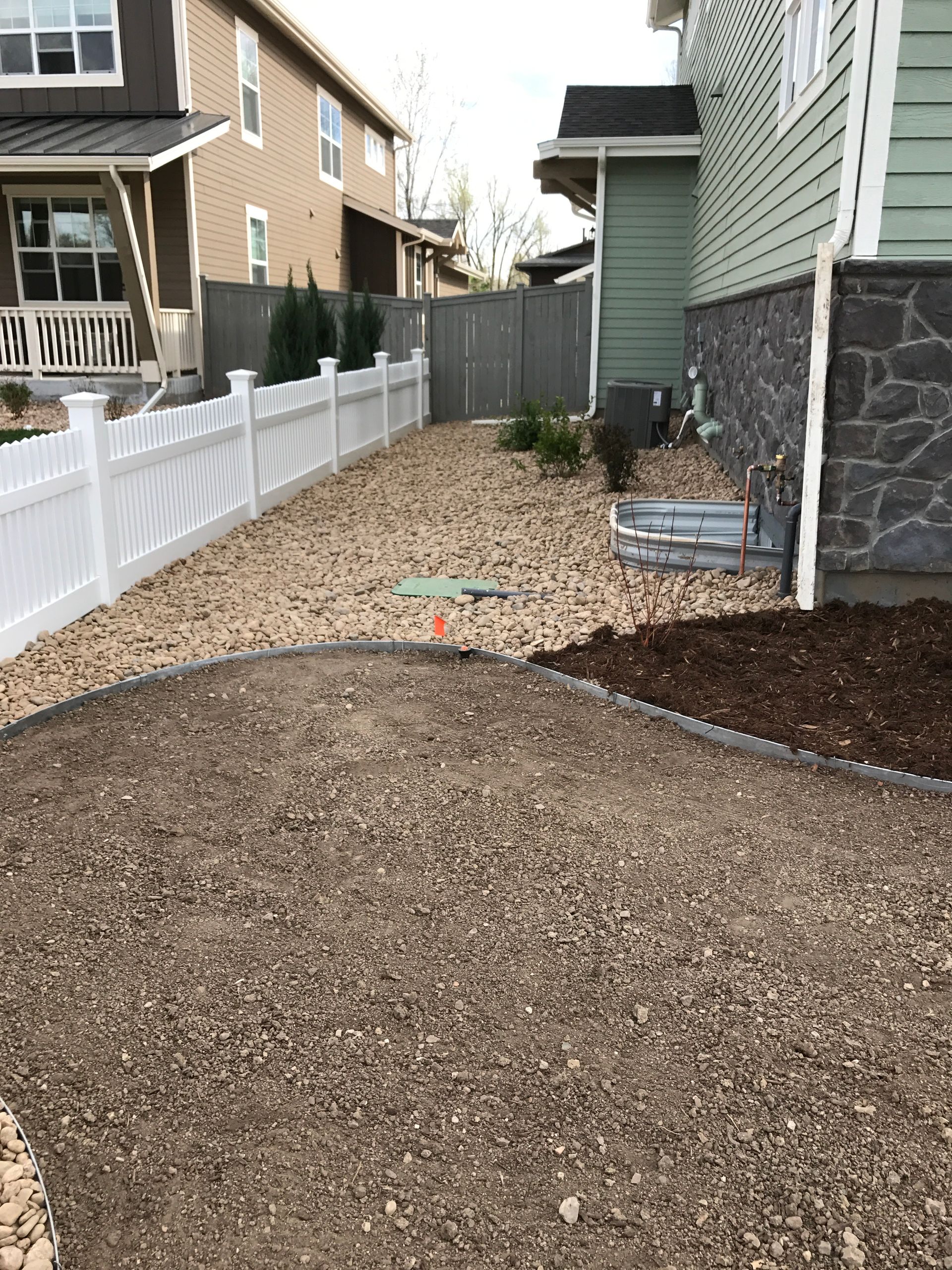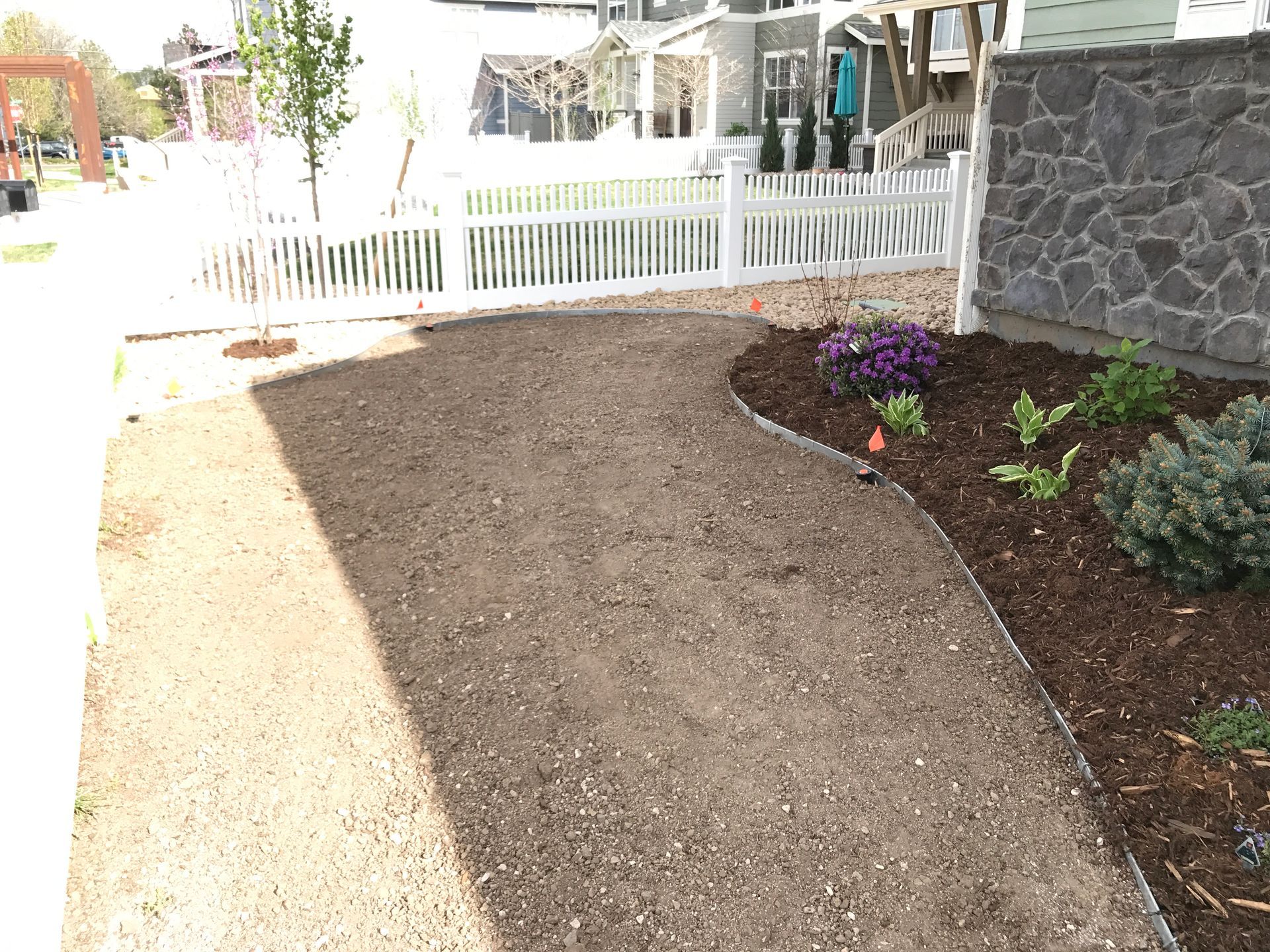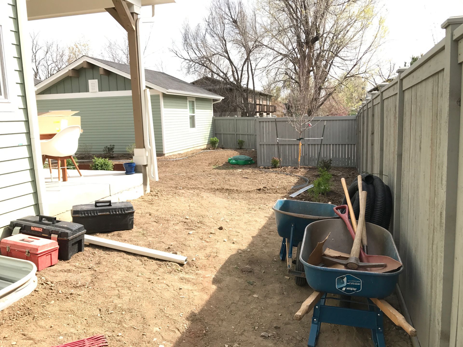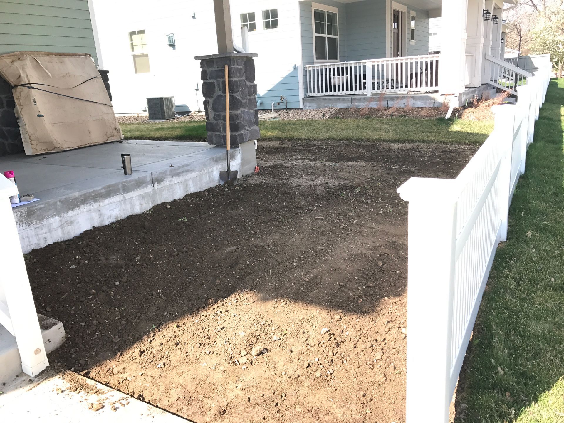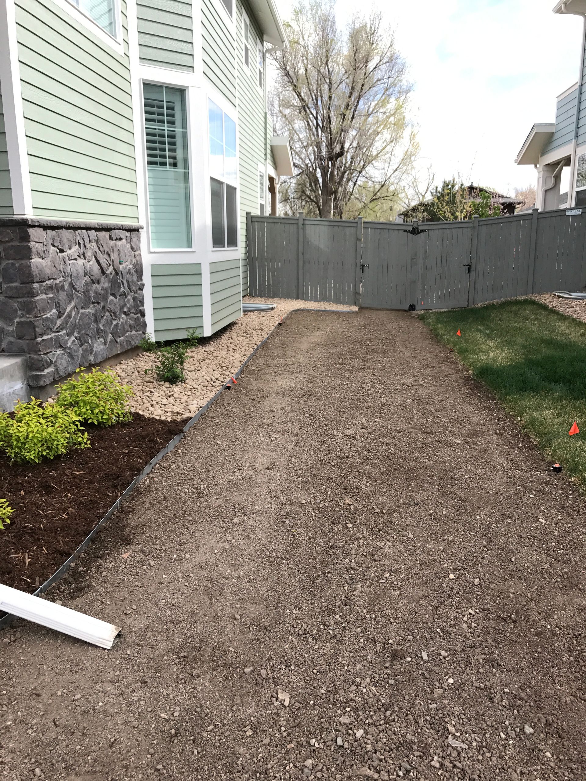 Full landscape remodel with decorative rock, plantings, sprinklers and grass. Lafayette, CO 2019