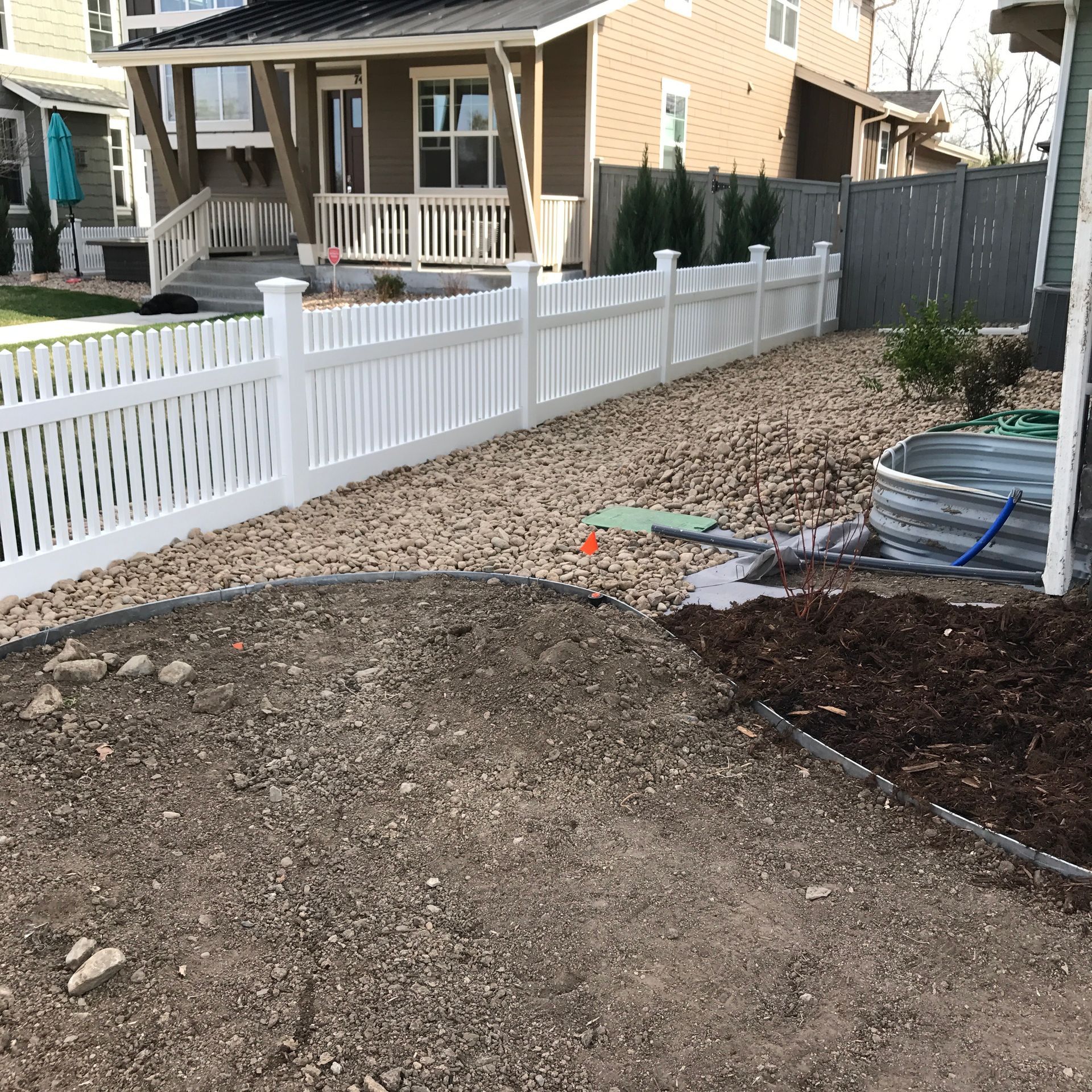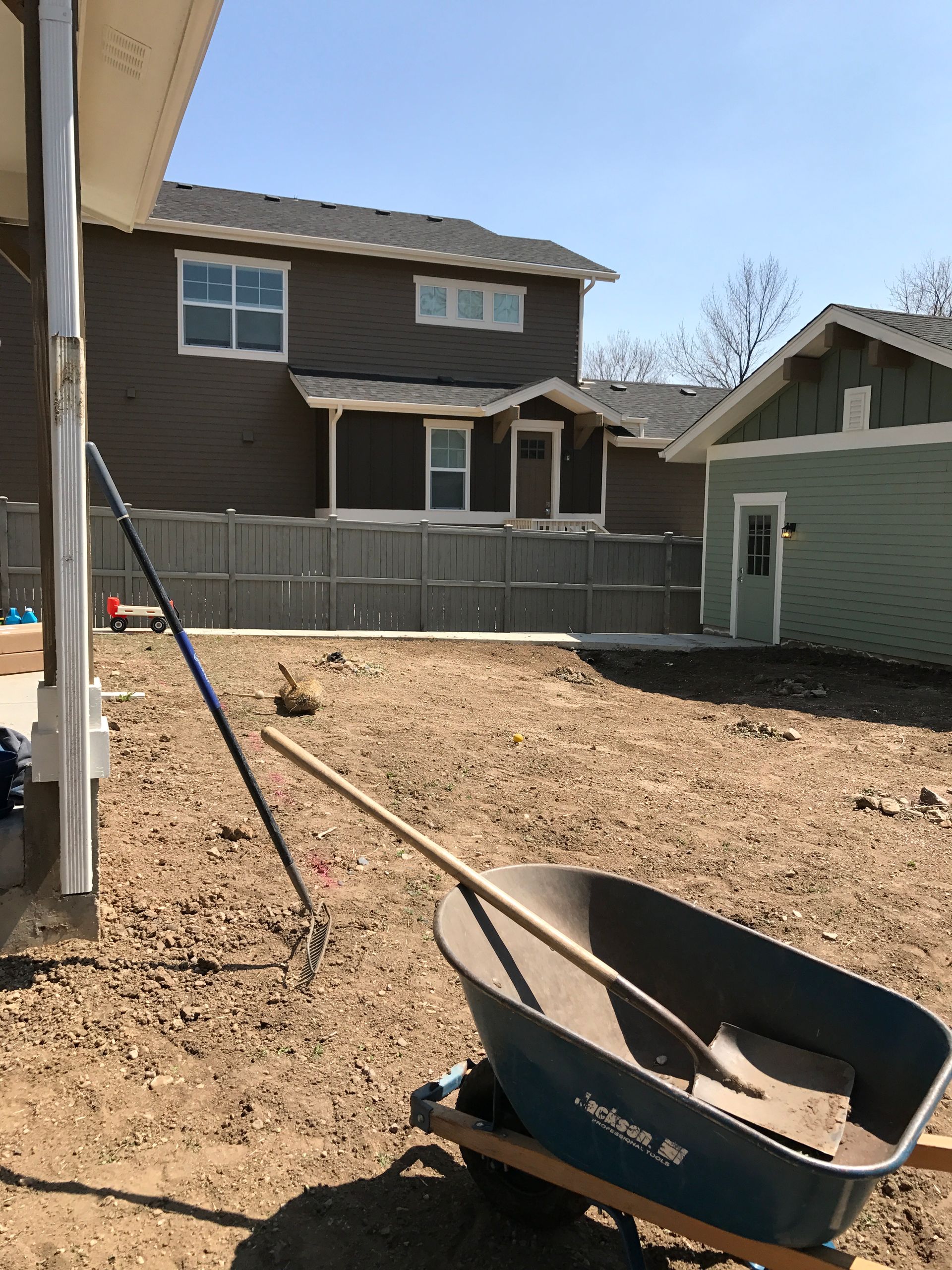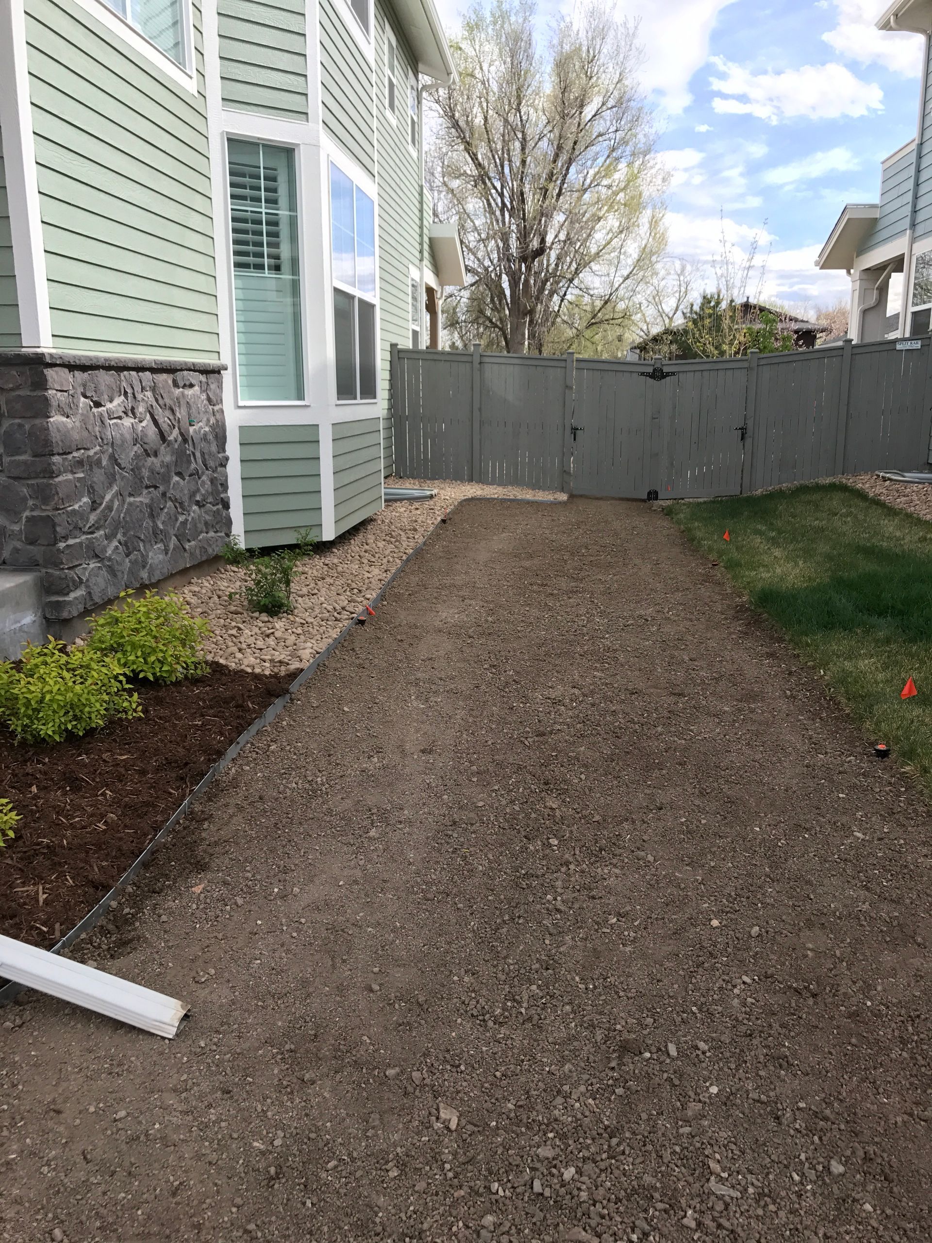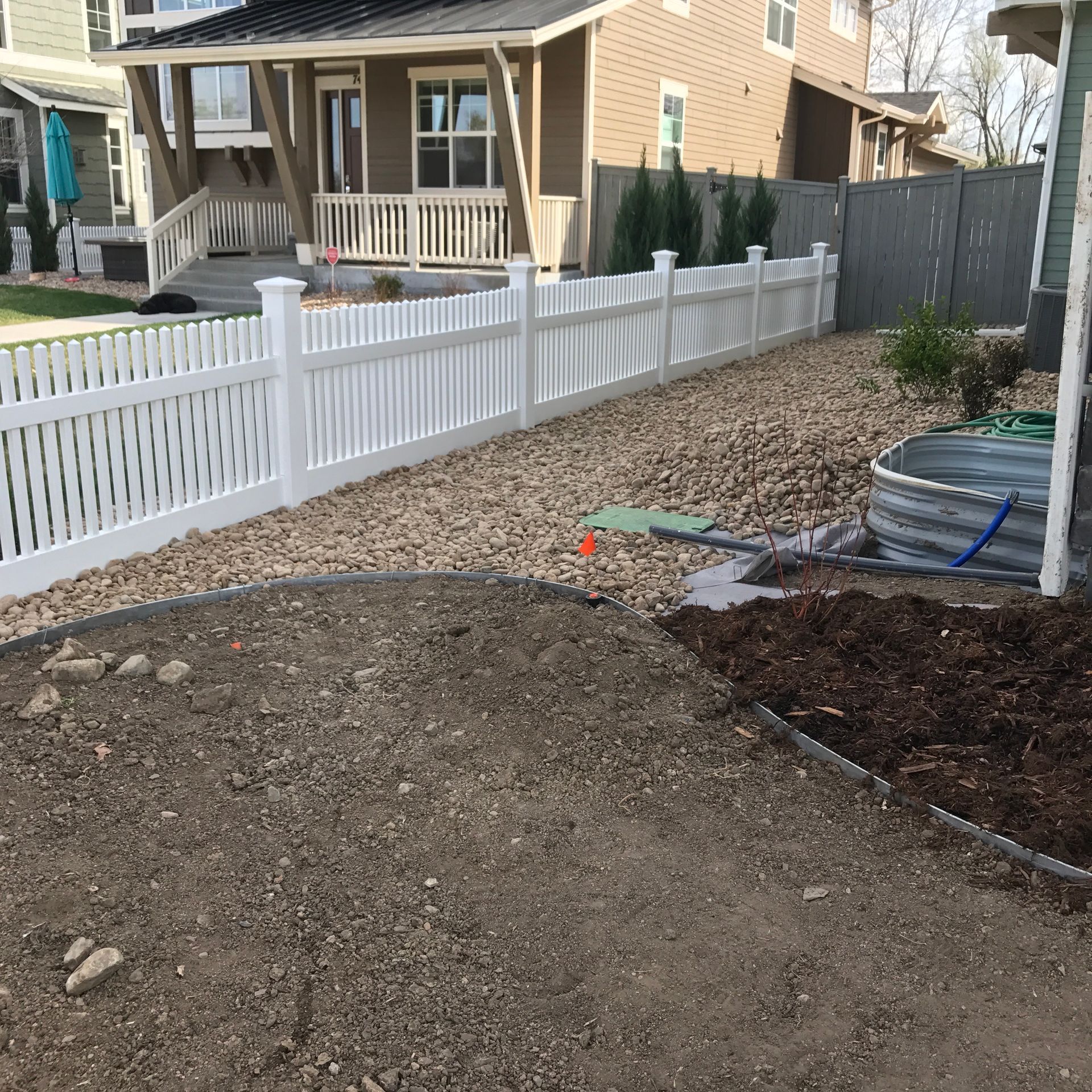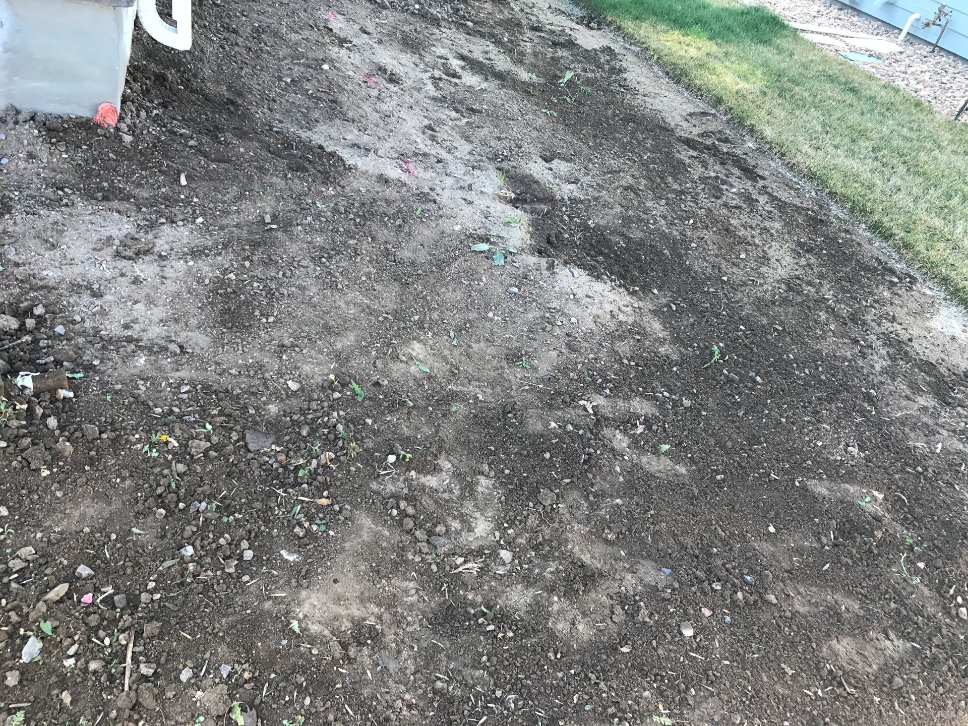 Full landscape remodel with decorative rock, plantings, sprinklers and grass. Lafayette, CO 2019
