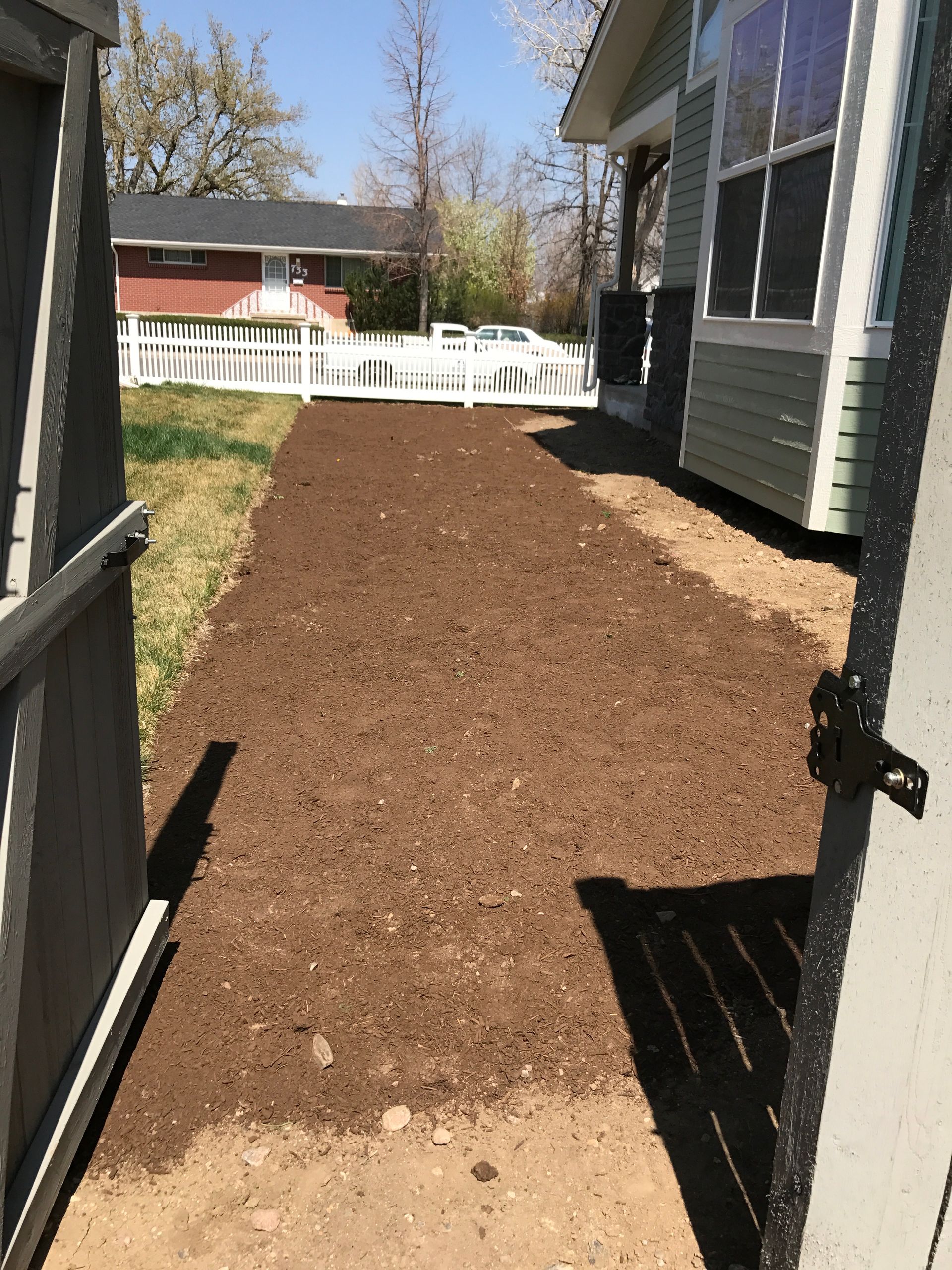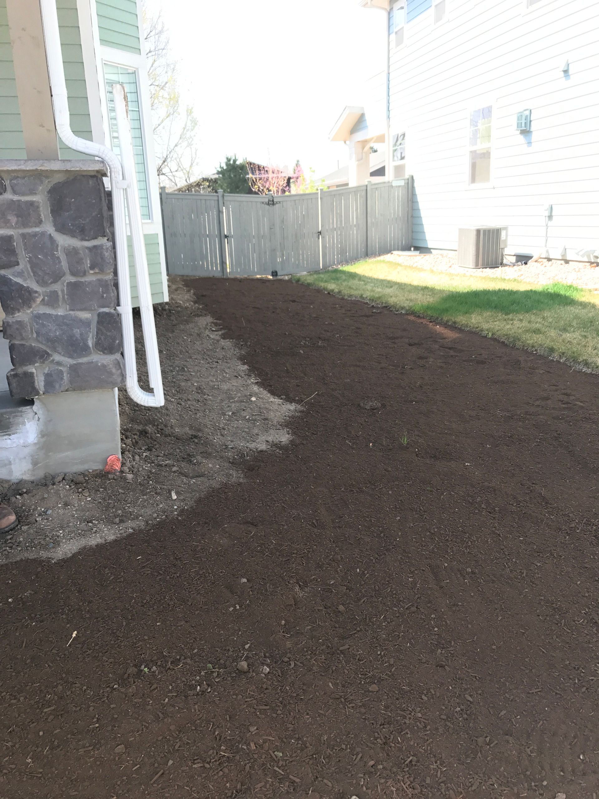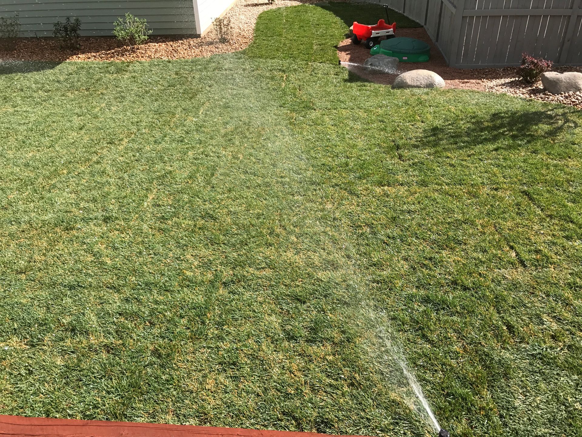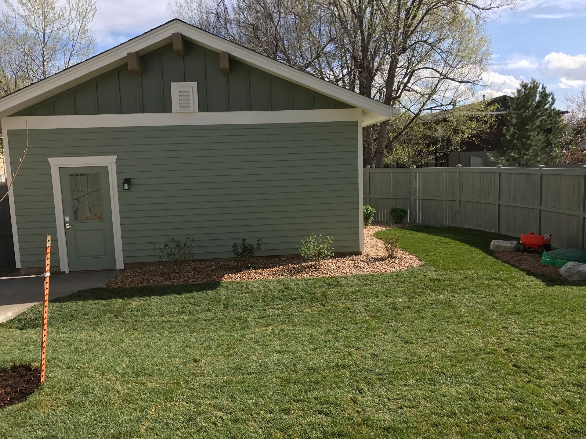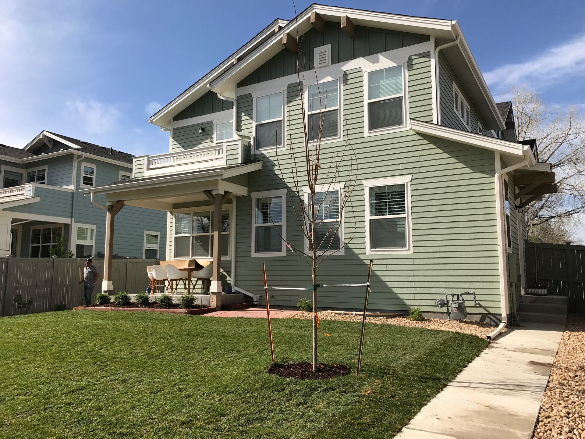 Full landscape remodel with decorative rock, plantings, sprinklers and grass. Lafayette, CO 2019