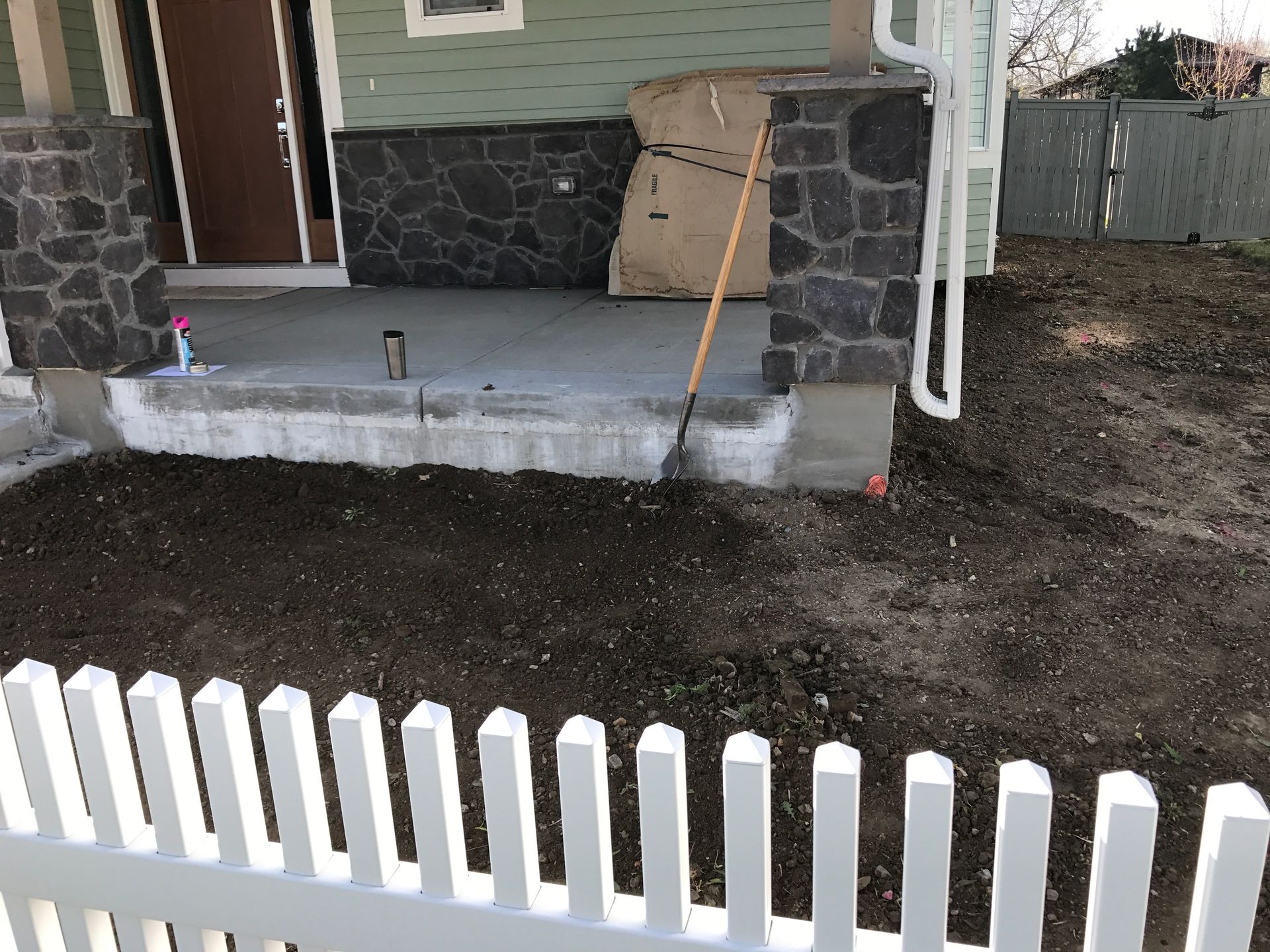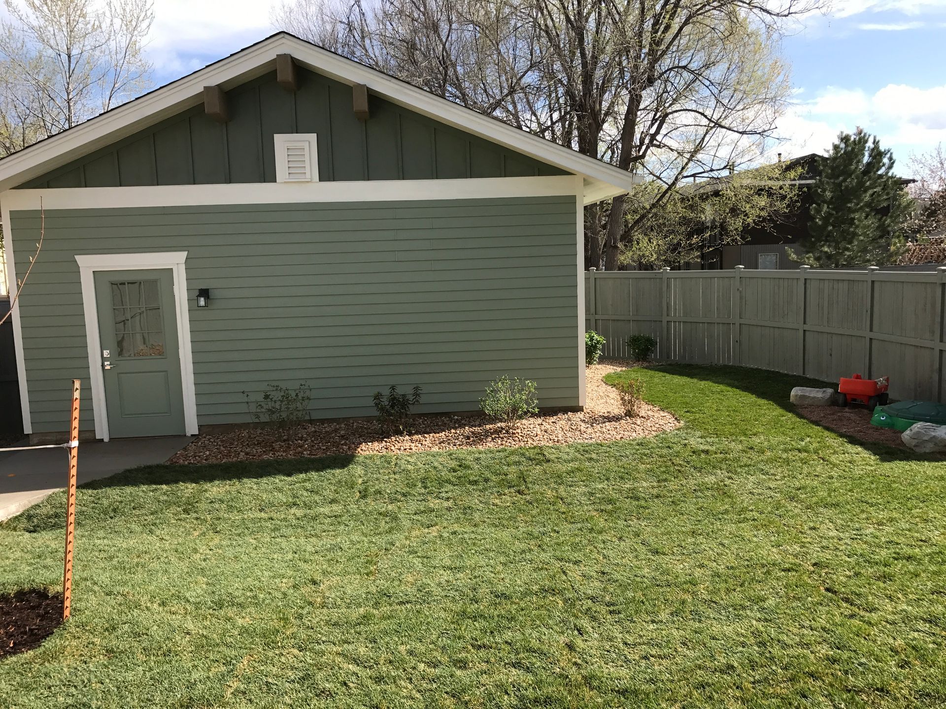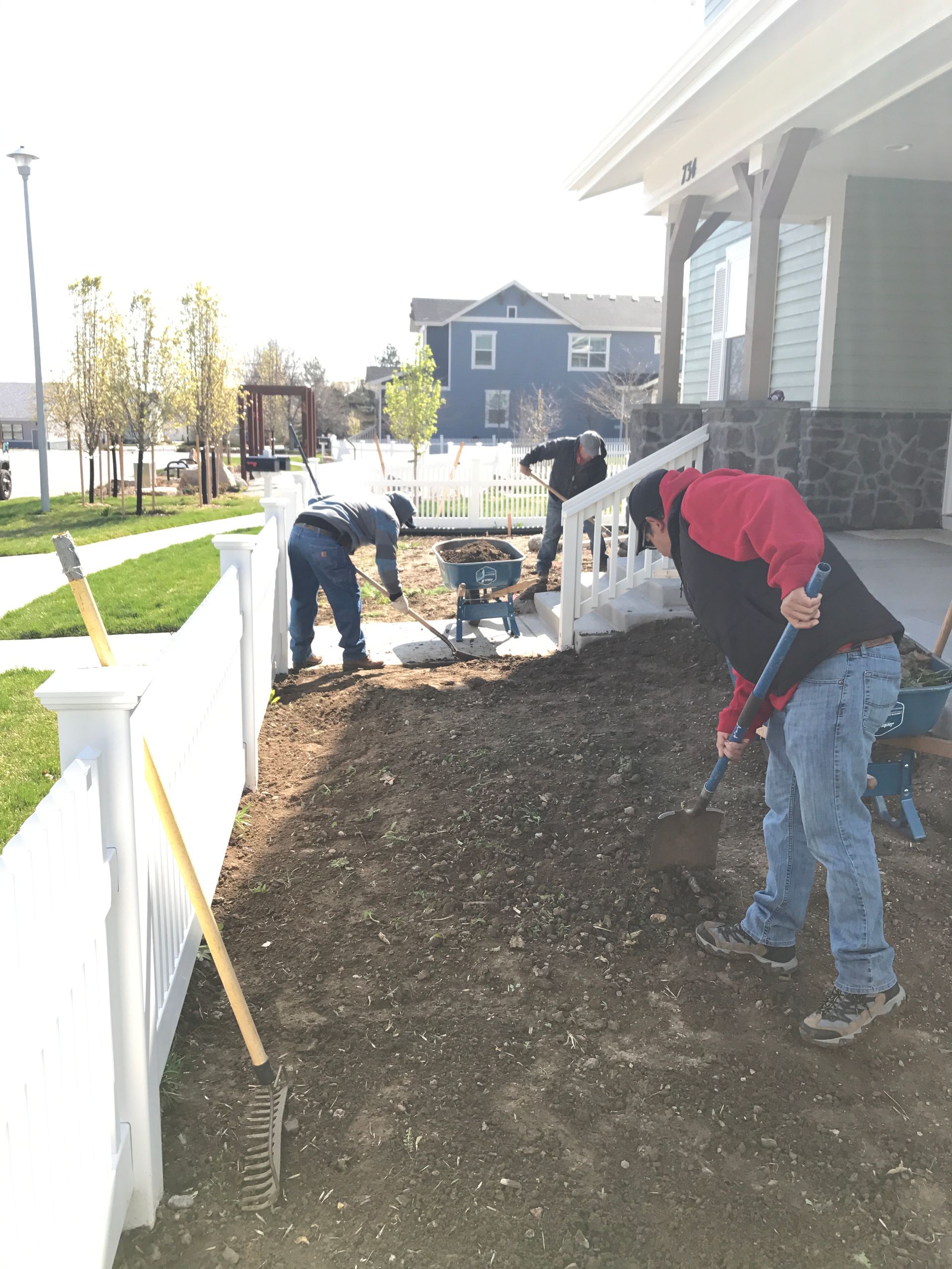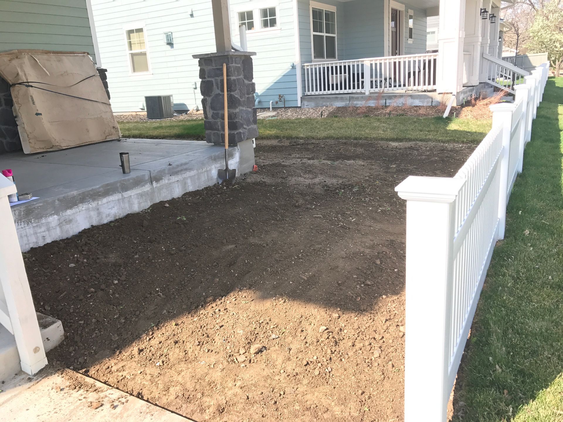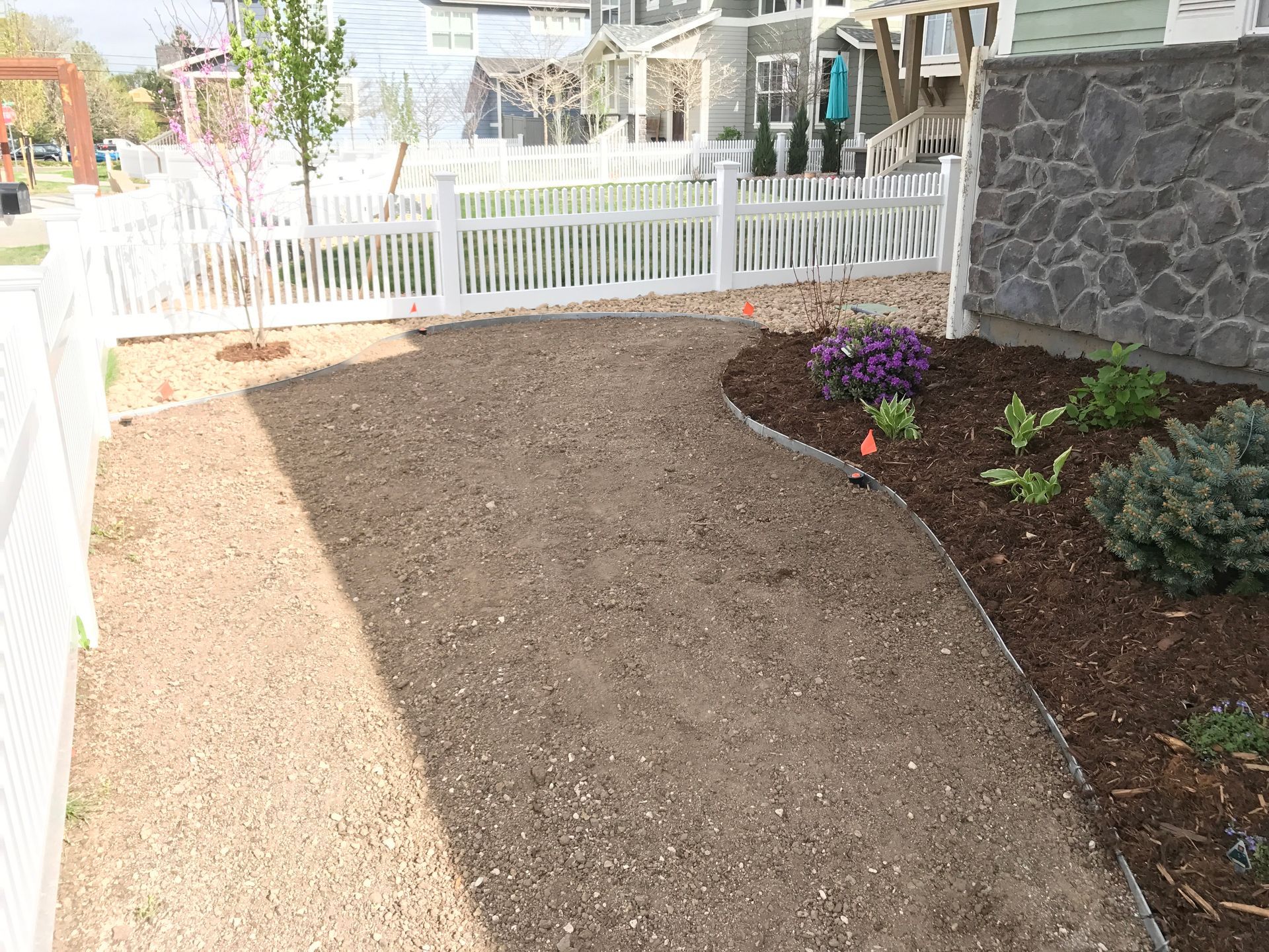Full landscape remodel with decorative rock, plantings, sprinklers and grass. Lafayette, CO 2019