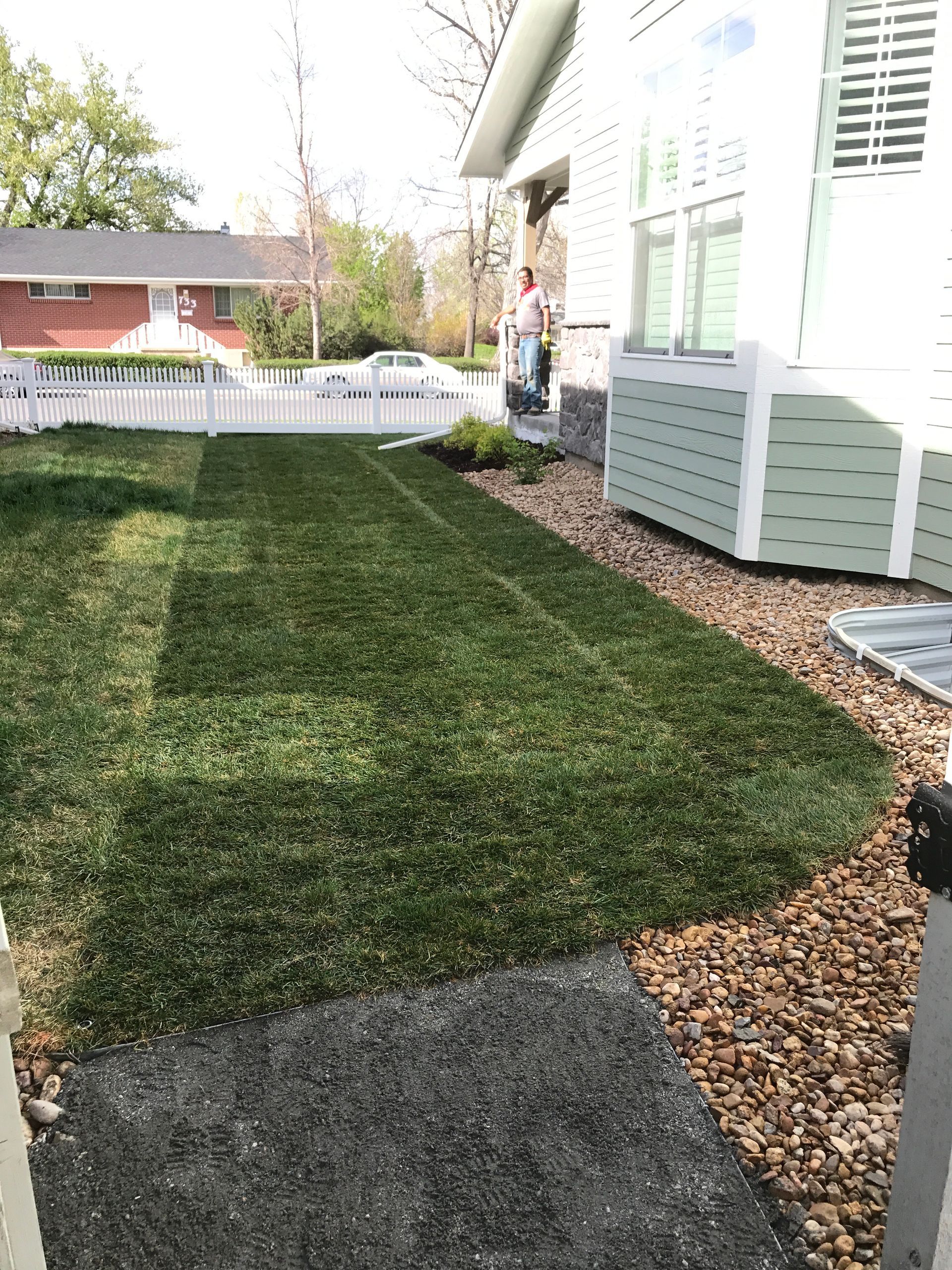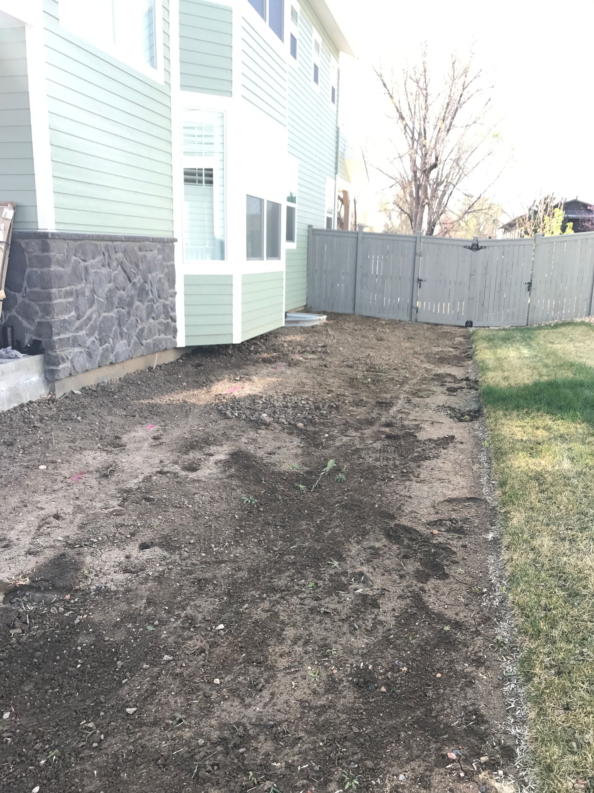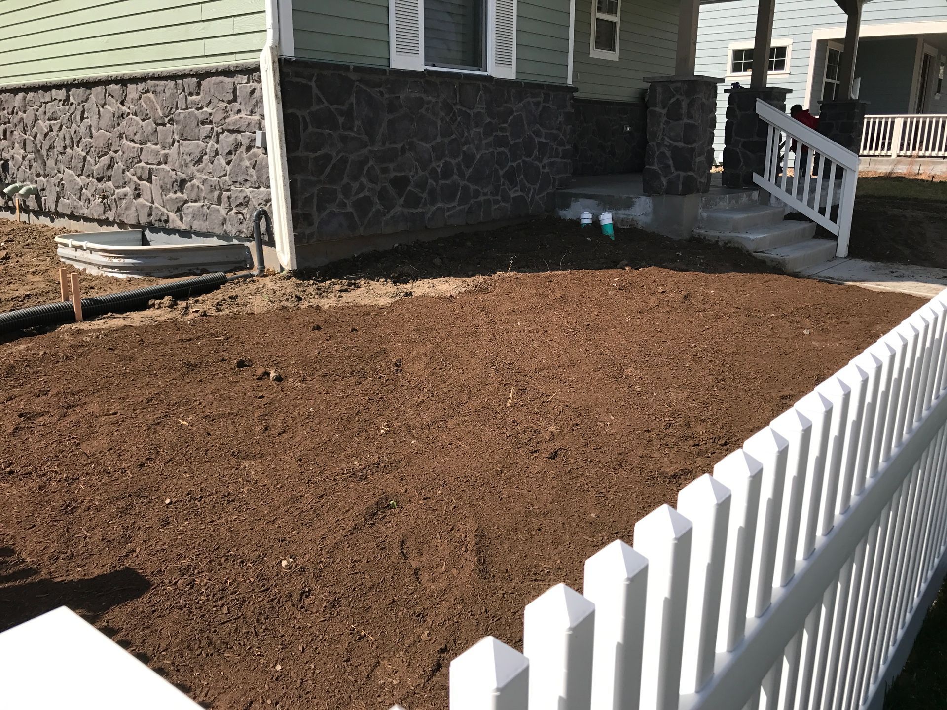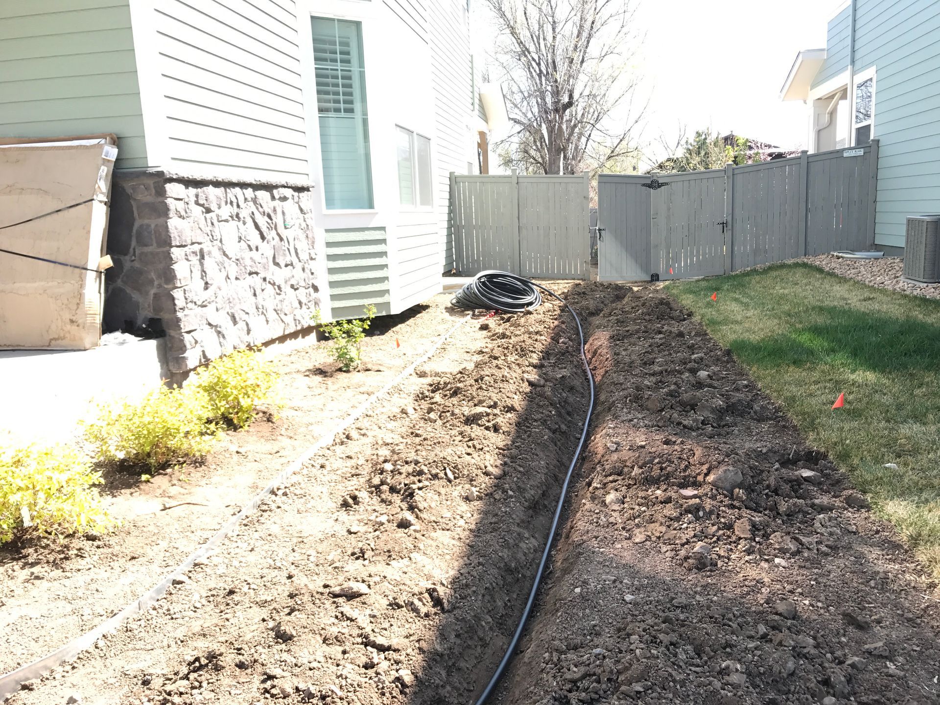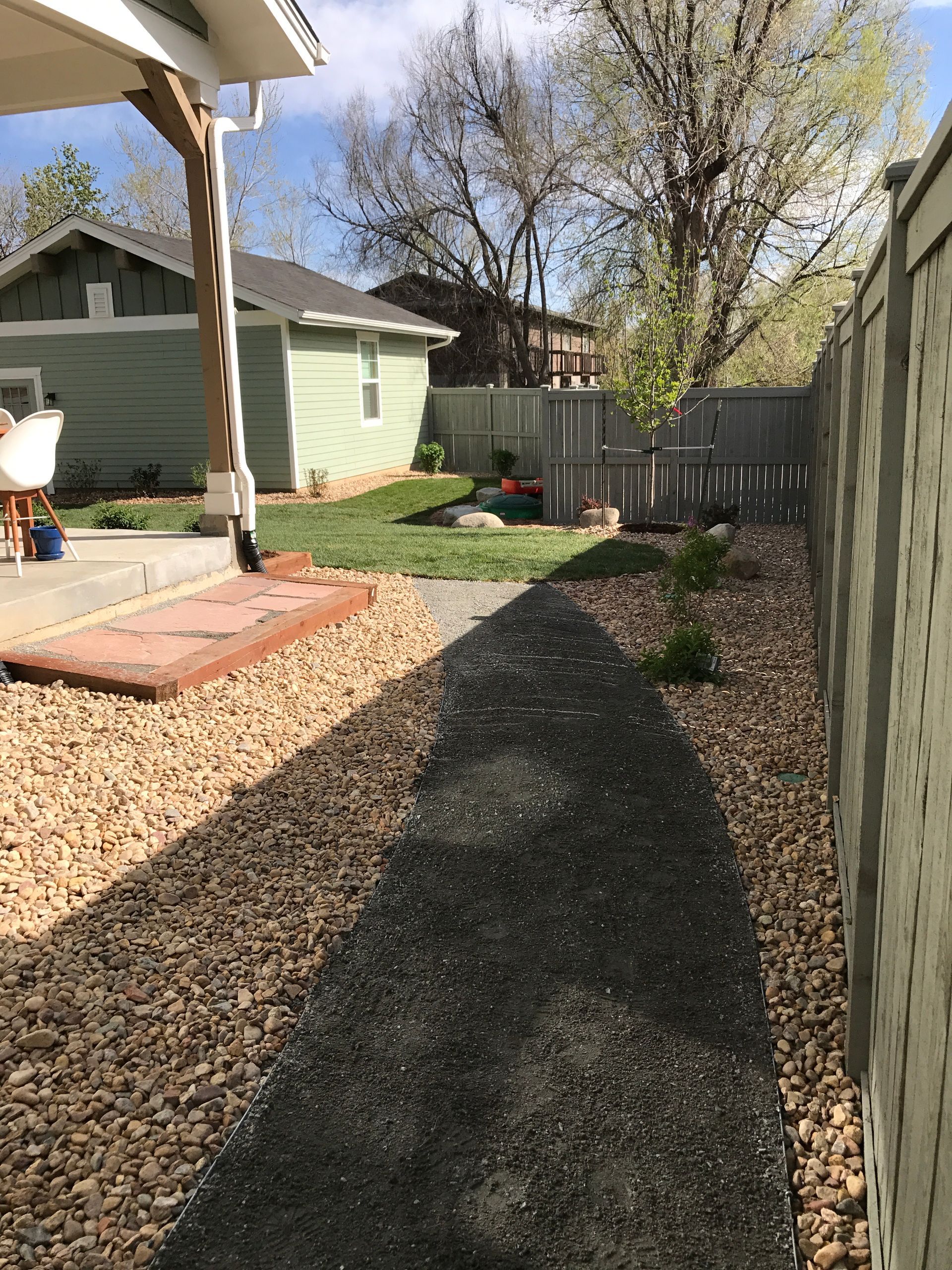 Full landscape remodel with decorative rock, plantings, sprinklers and grass. Lafayette, CO 2019