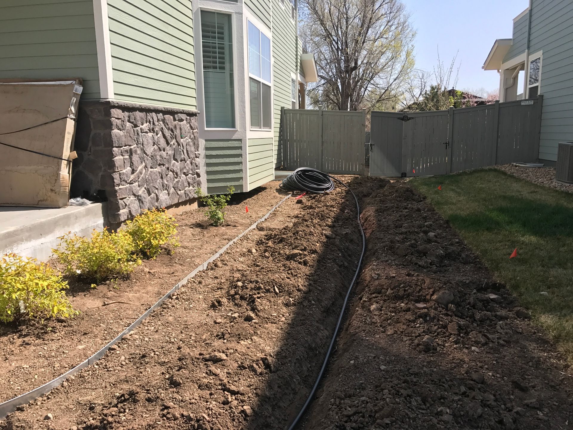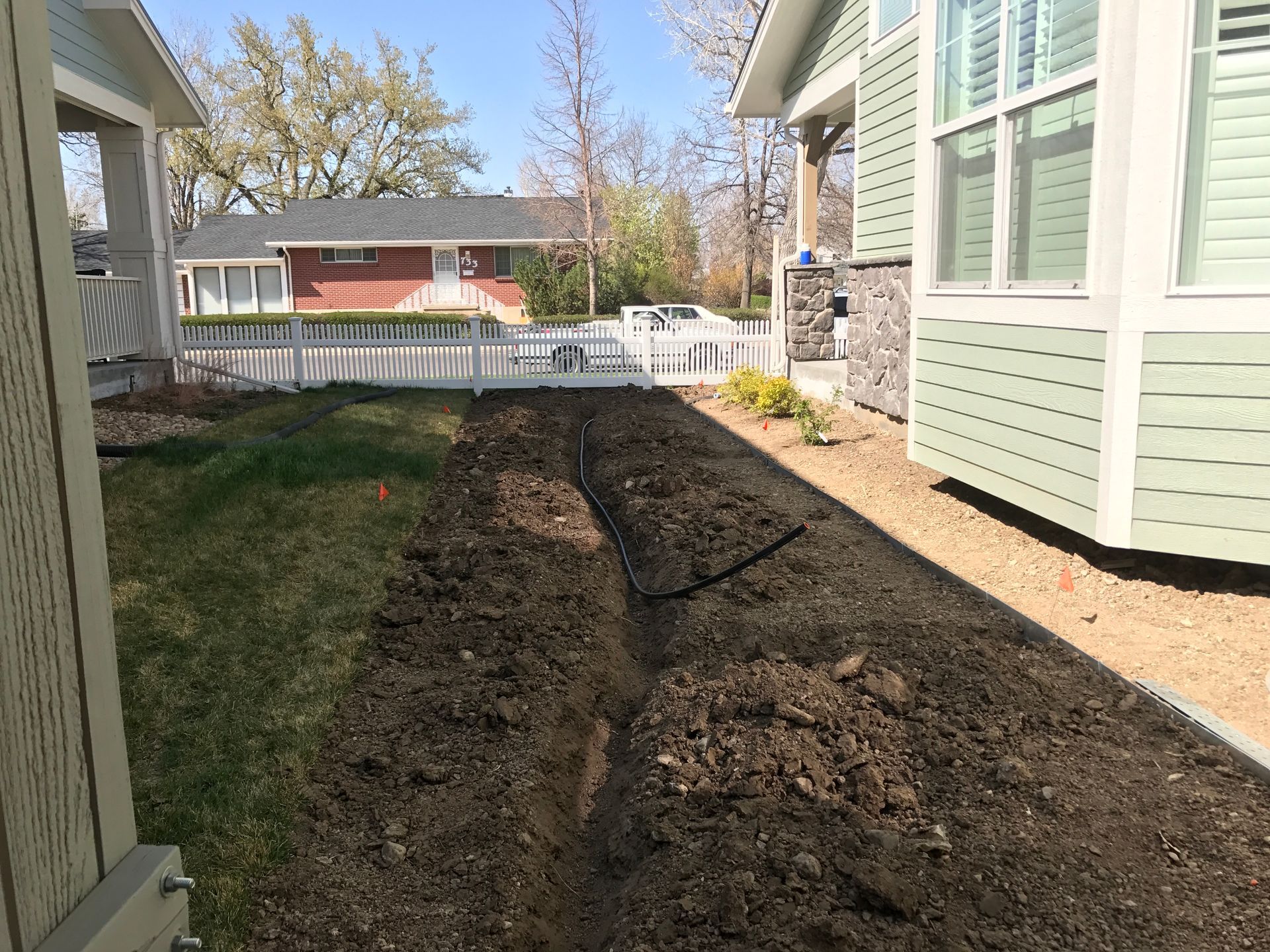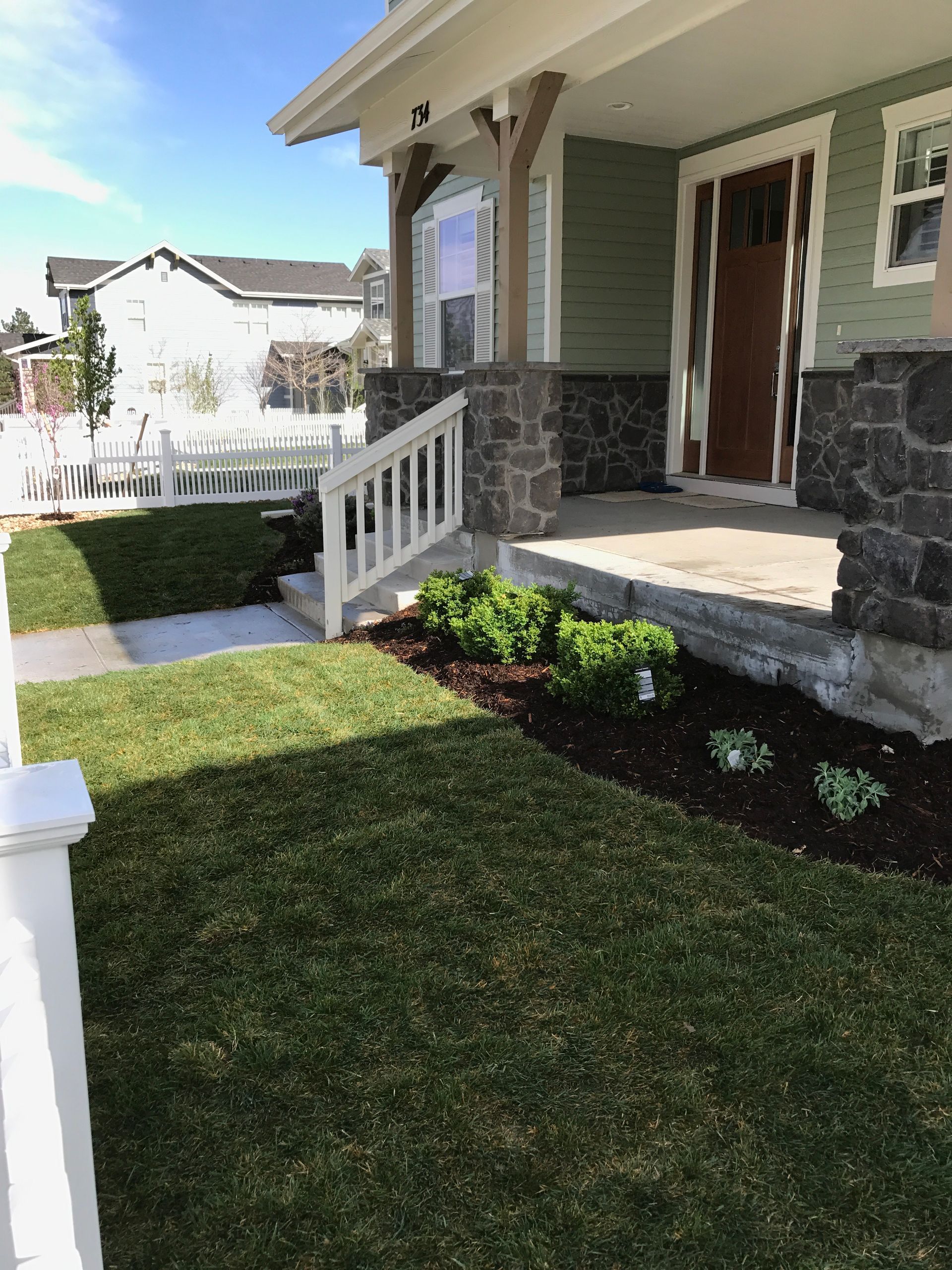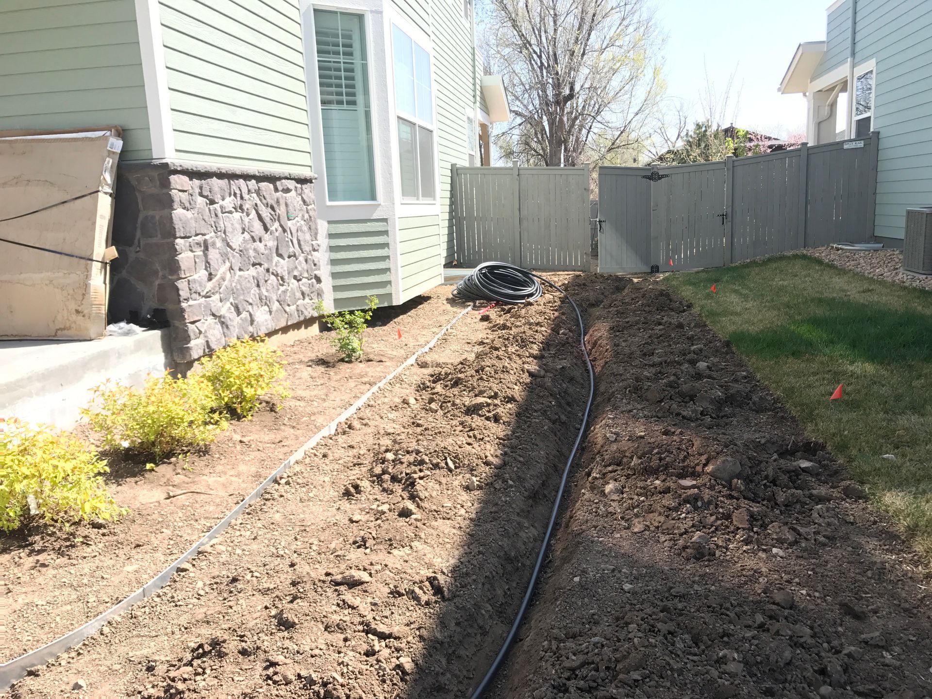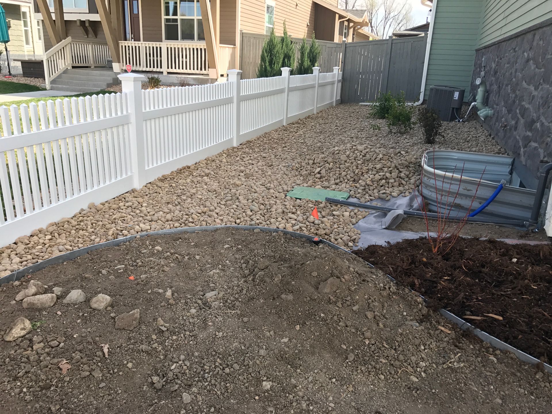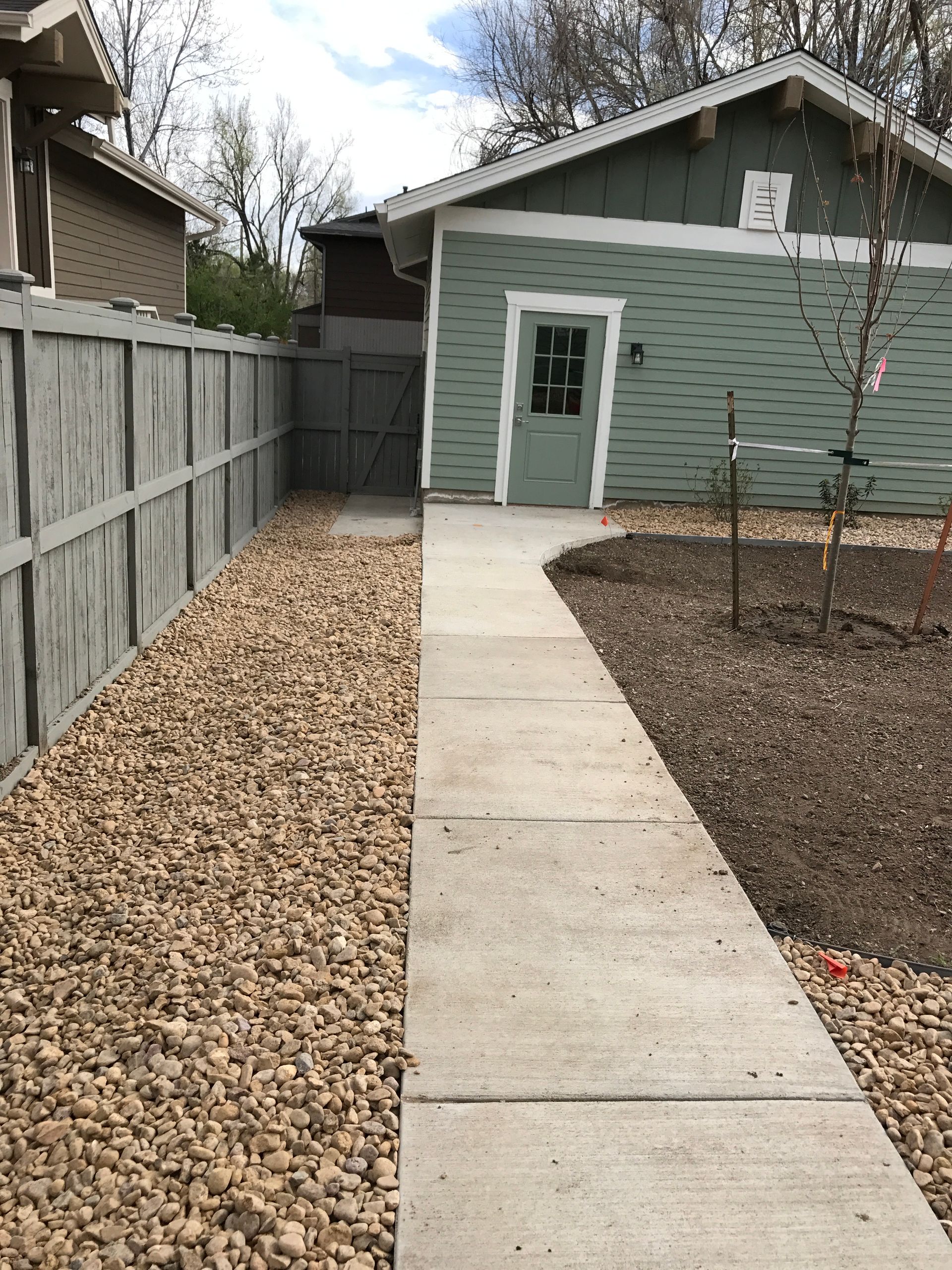 Full landscape remodel with decorative rock, plantings, sprinklers and grass. Lafayette, CO 2019