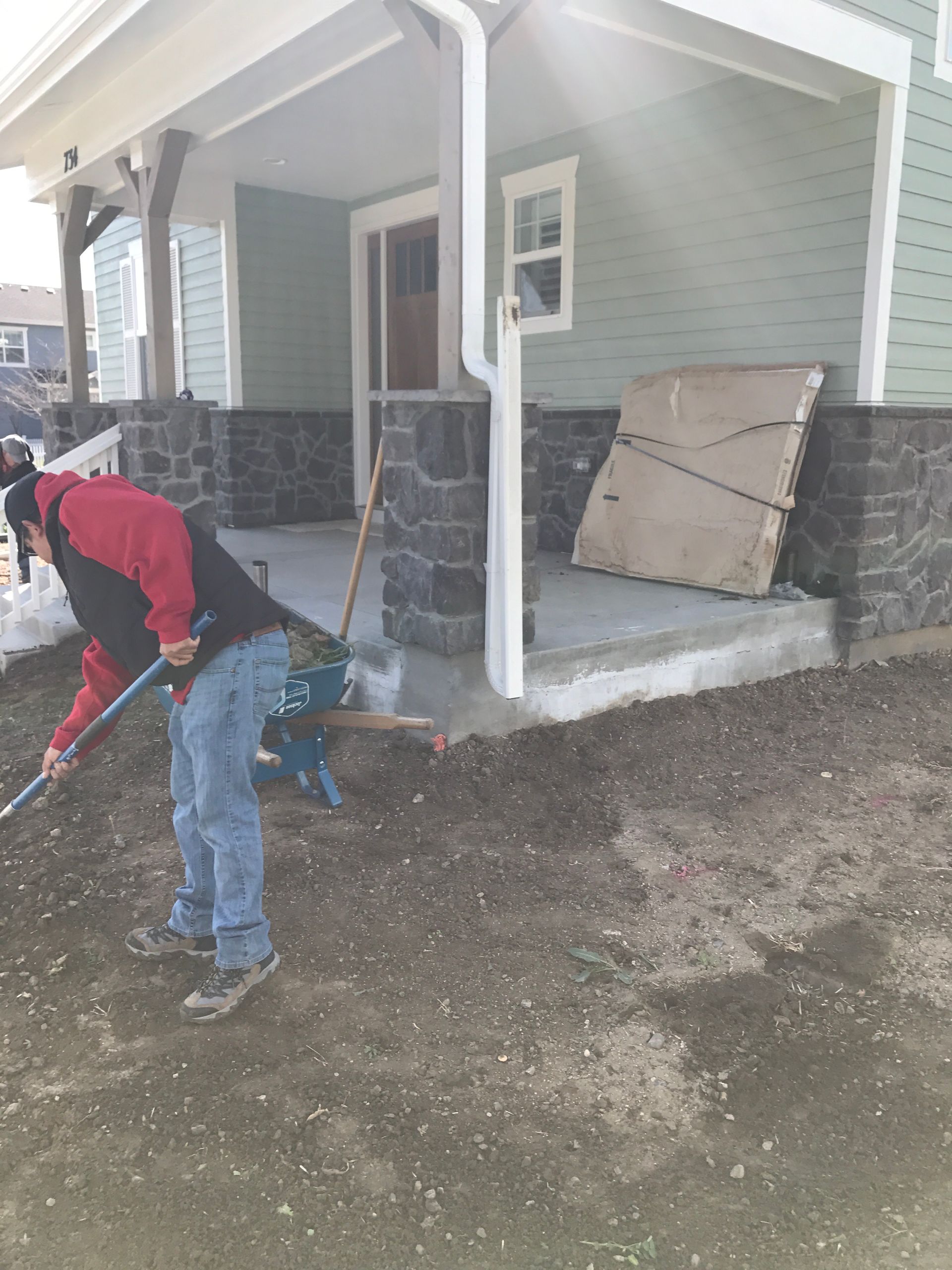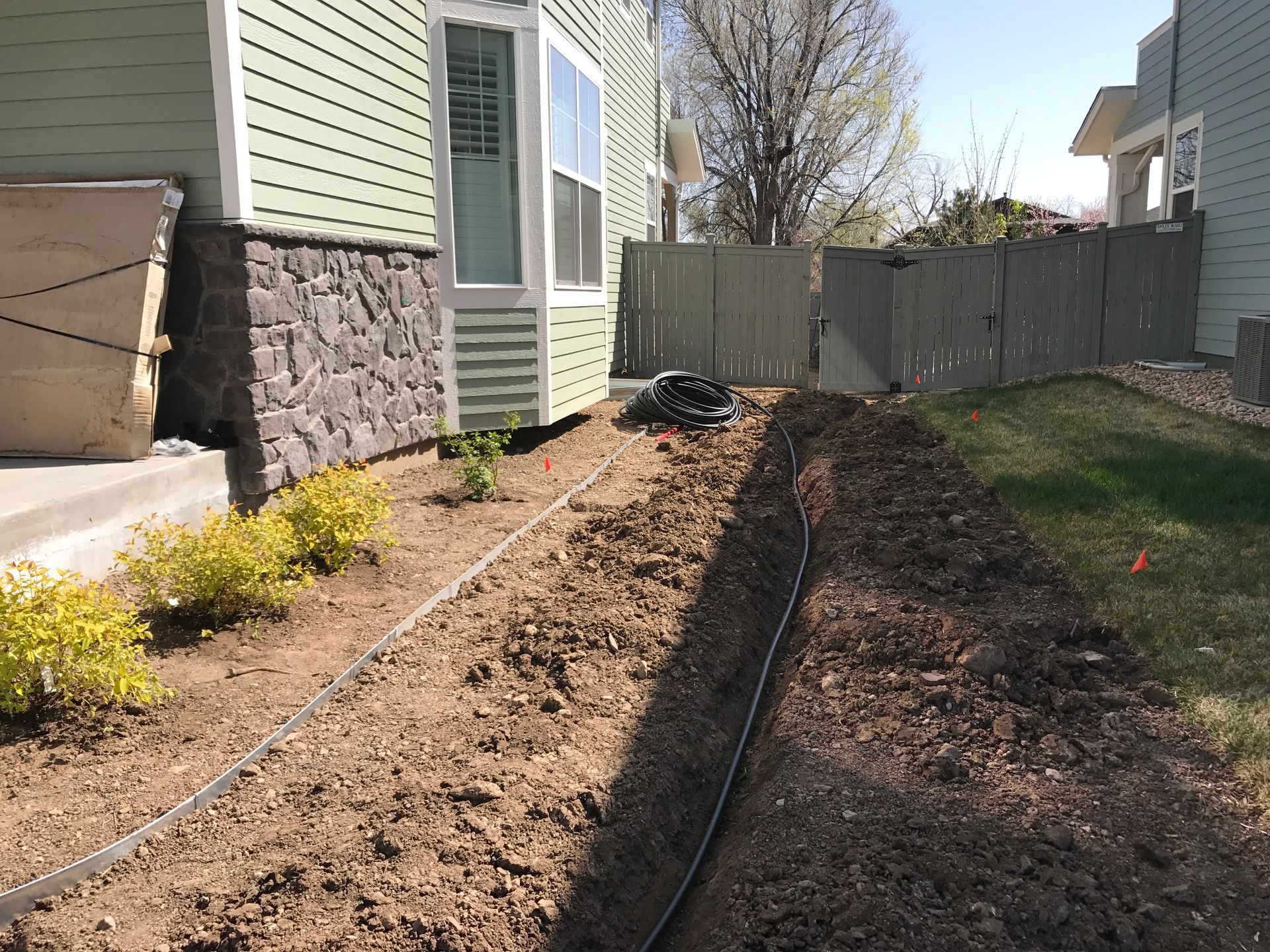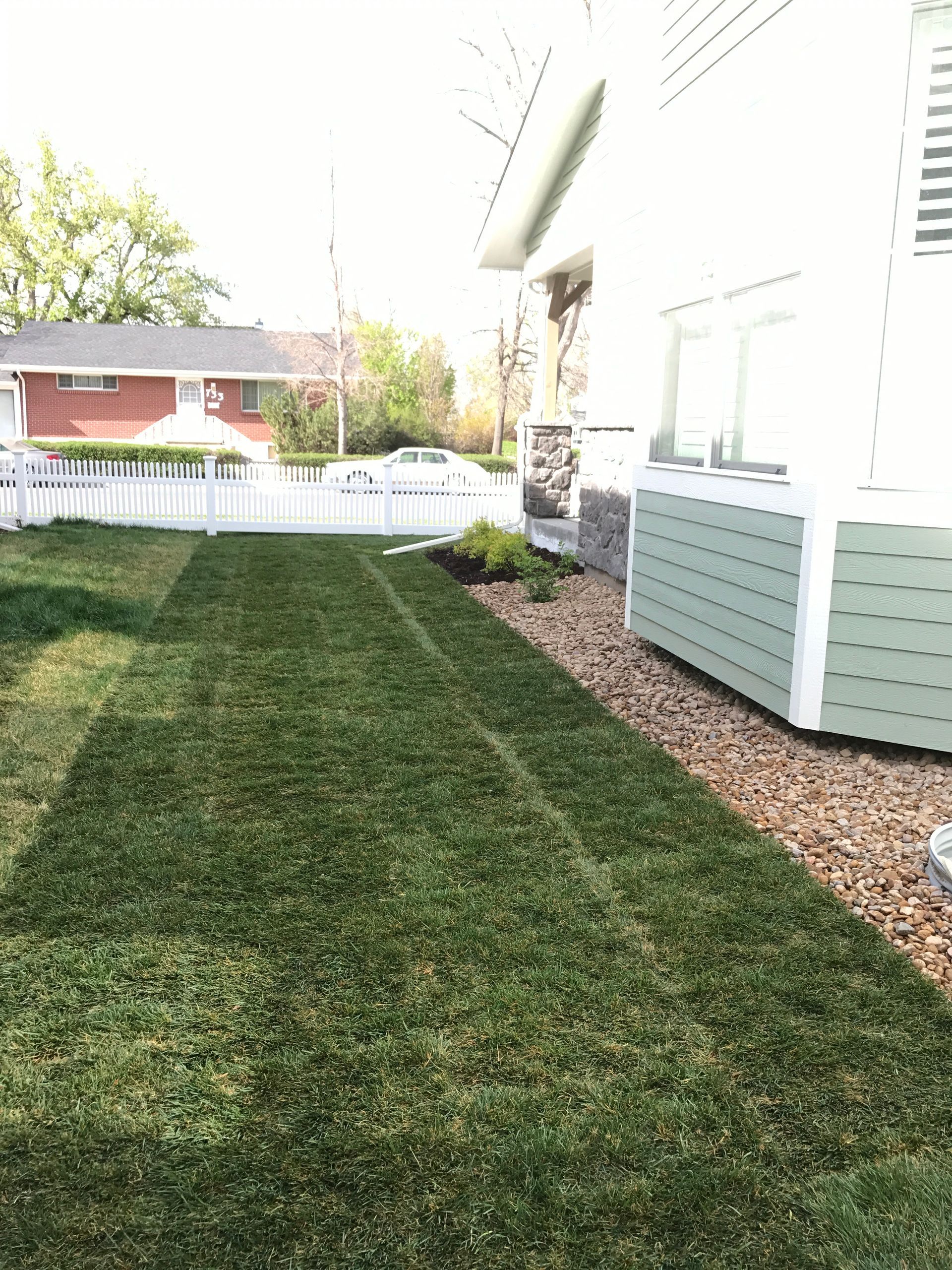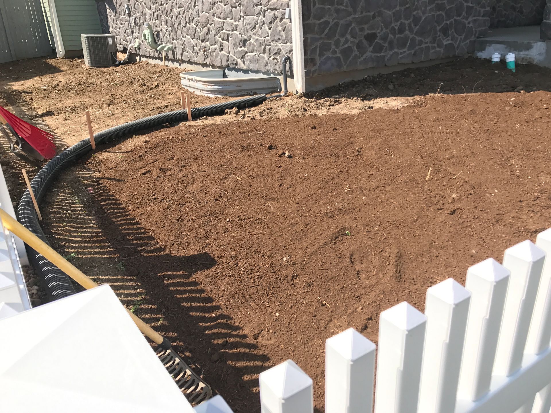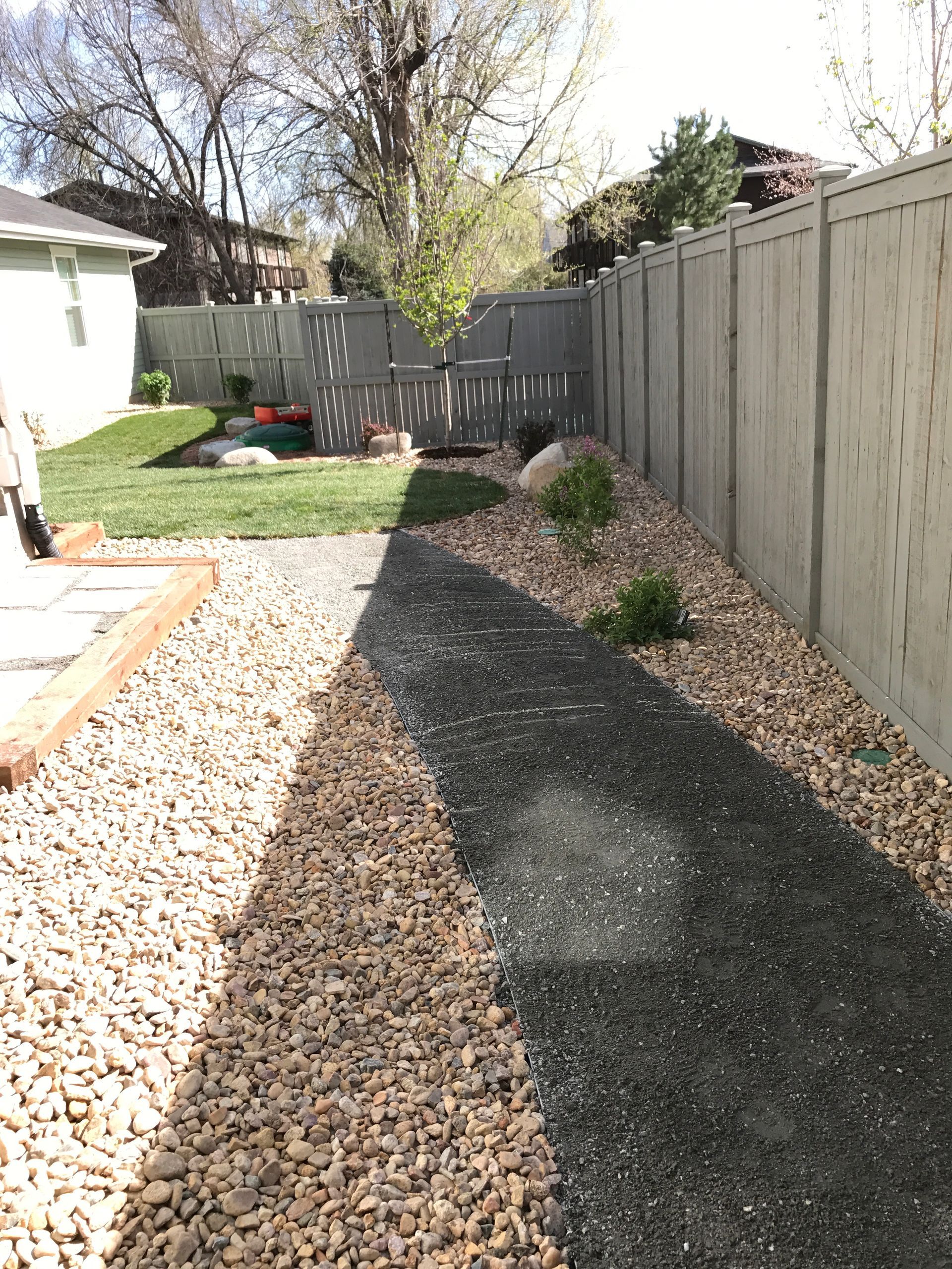 Full landscape remodel with decorative rock, plantings, sprinklers and grass. Lafayette, CO 2019