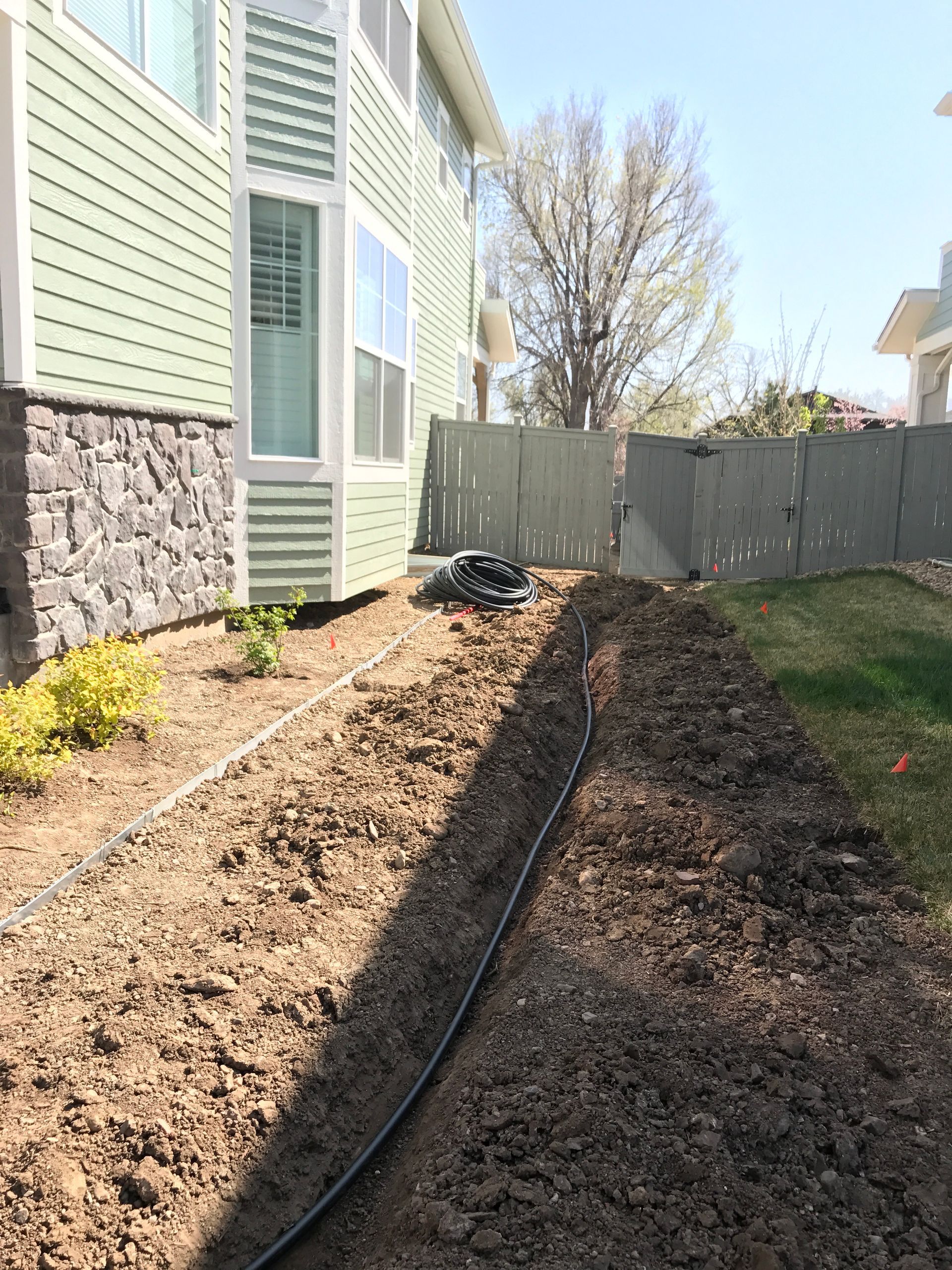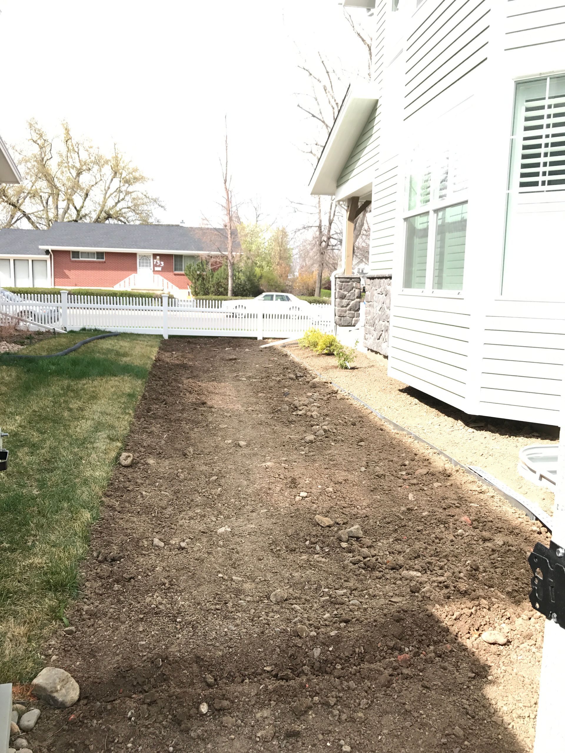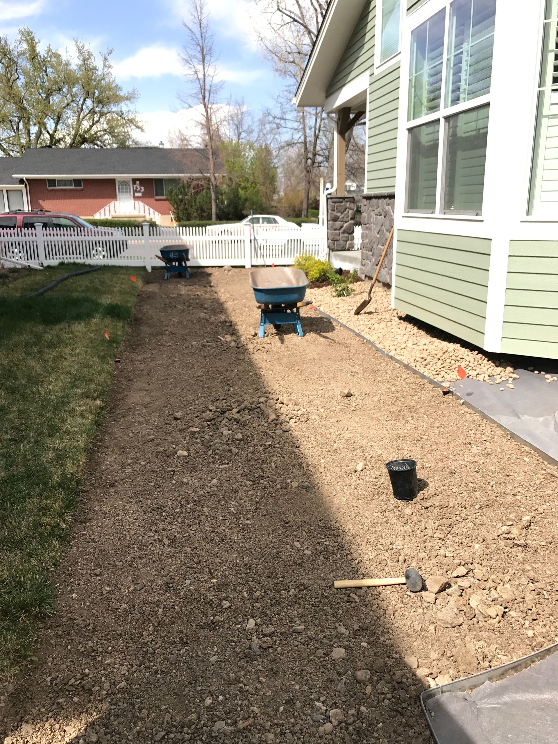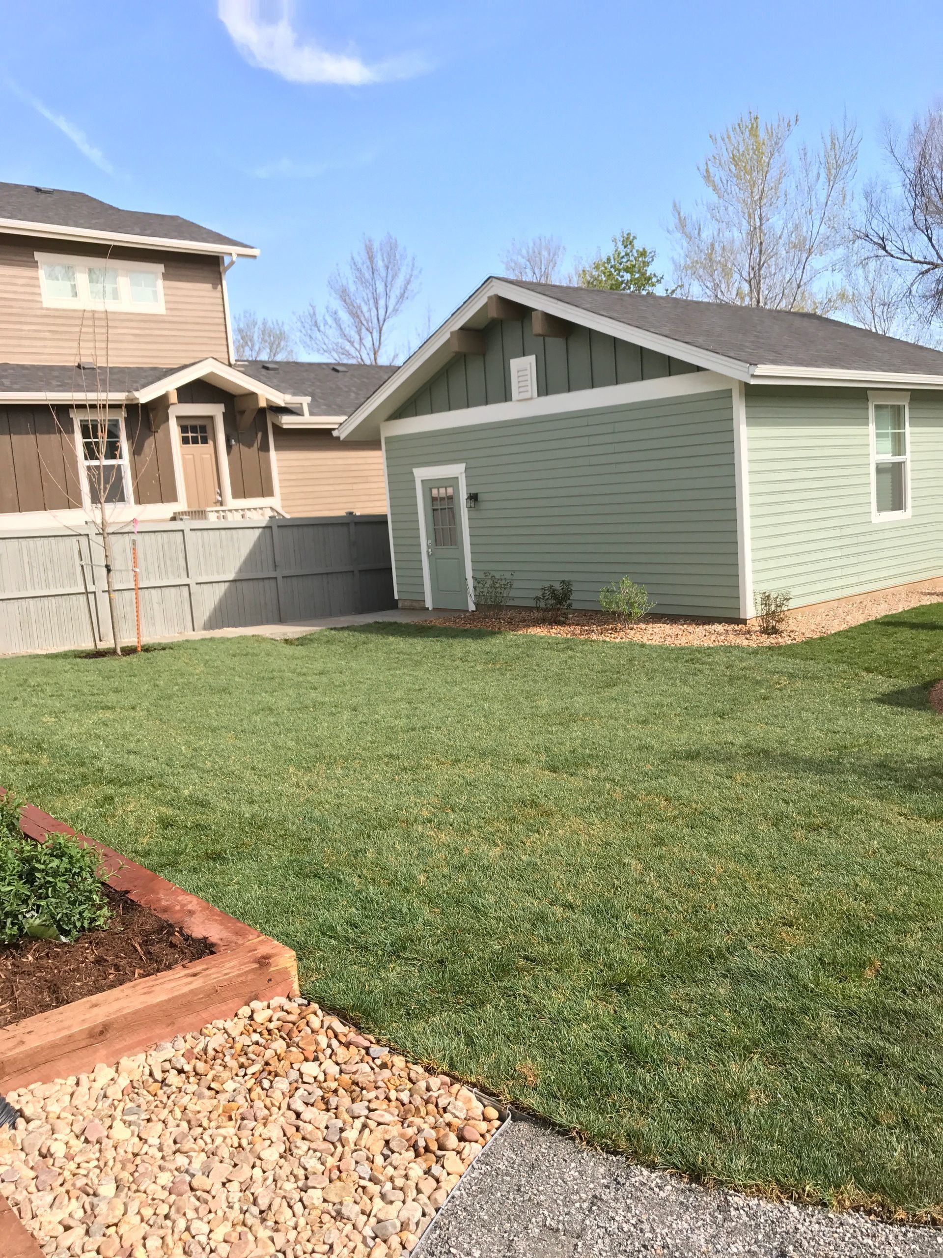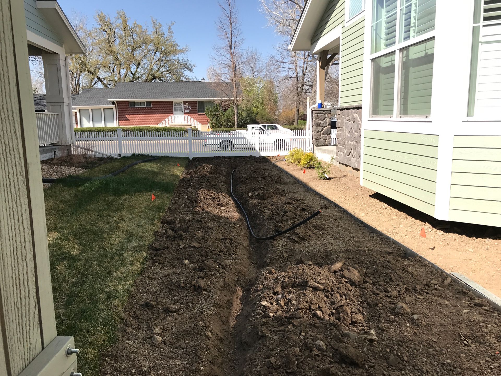 Full landscape remodel with decorative rock, plantings, sprinklers and grass. Lafayette, CO 2019