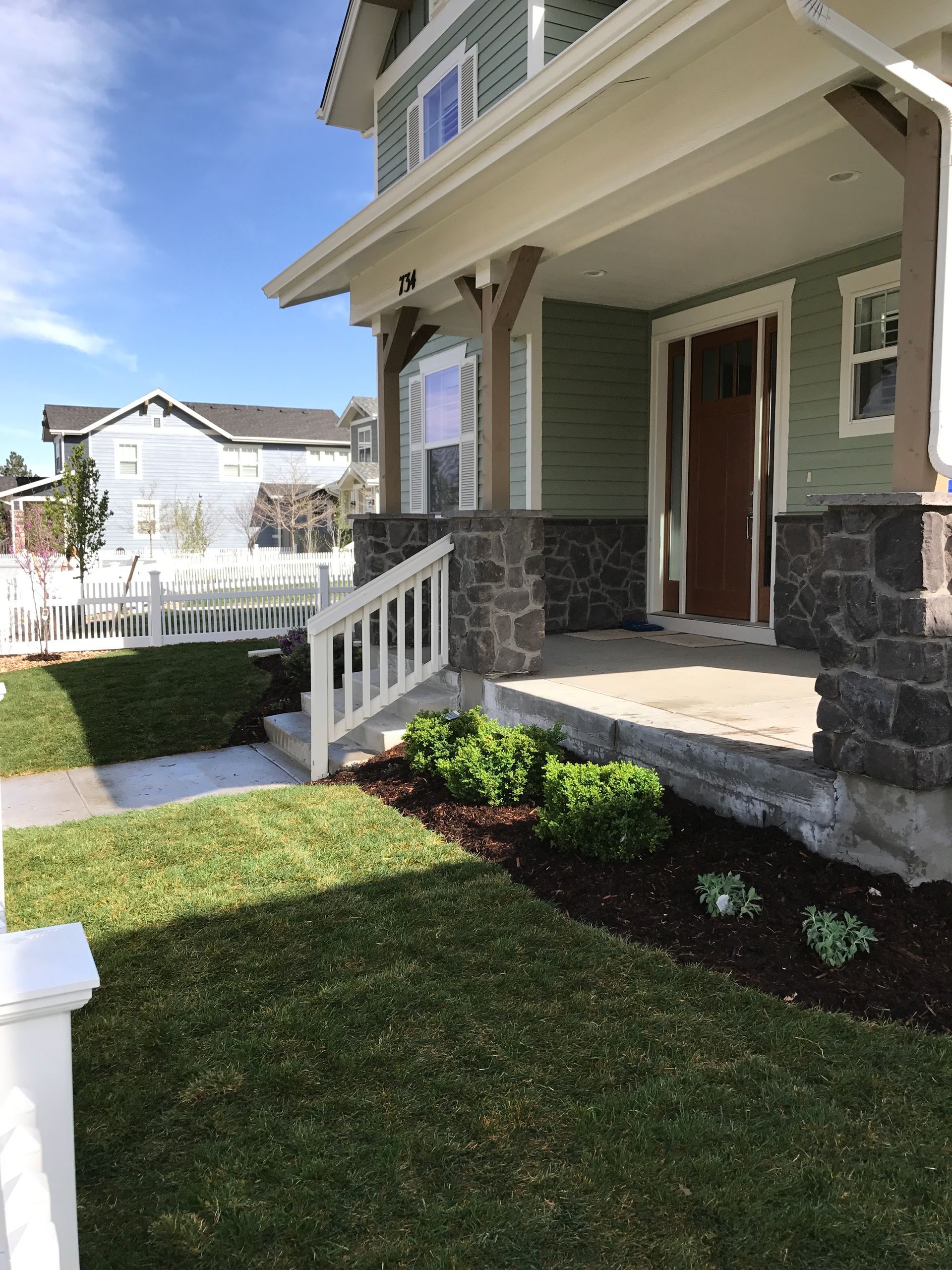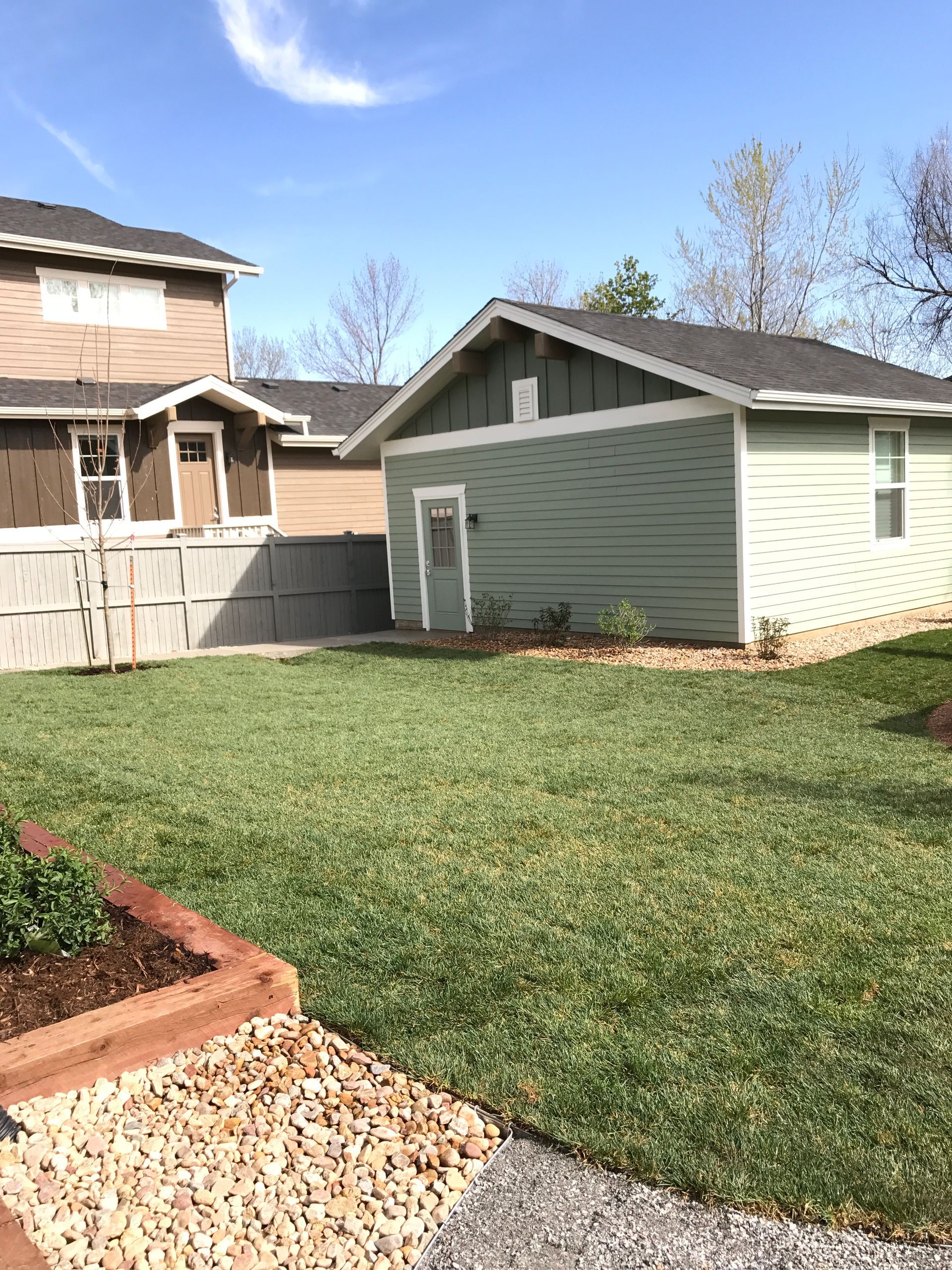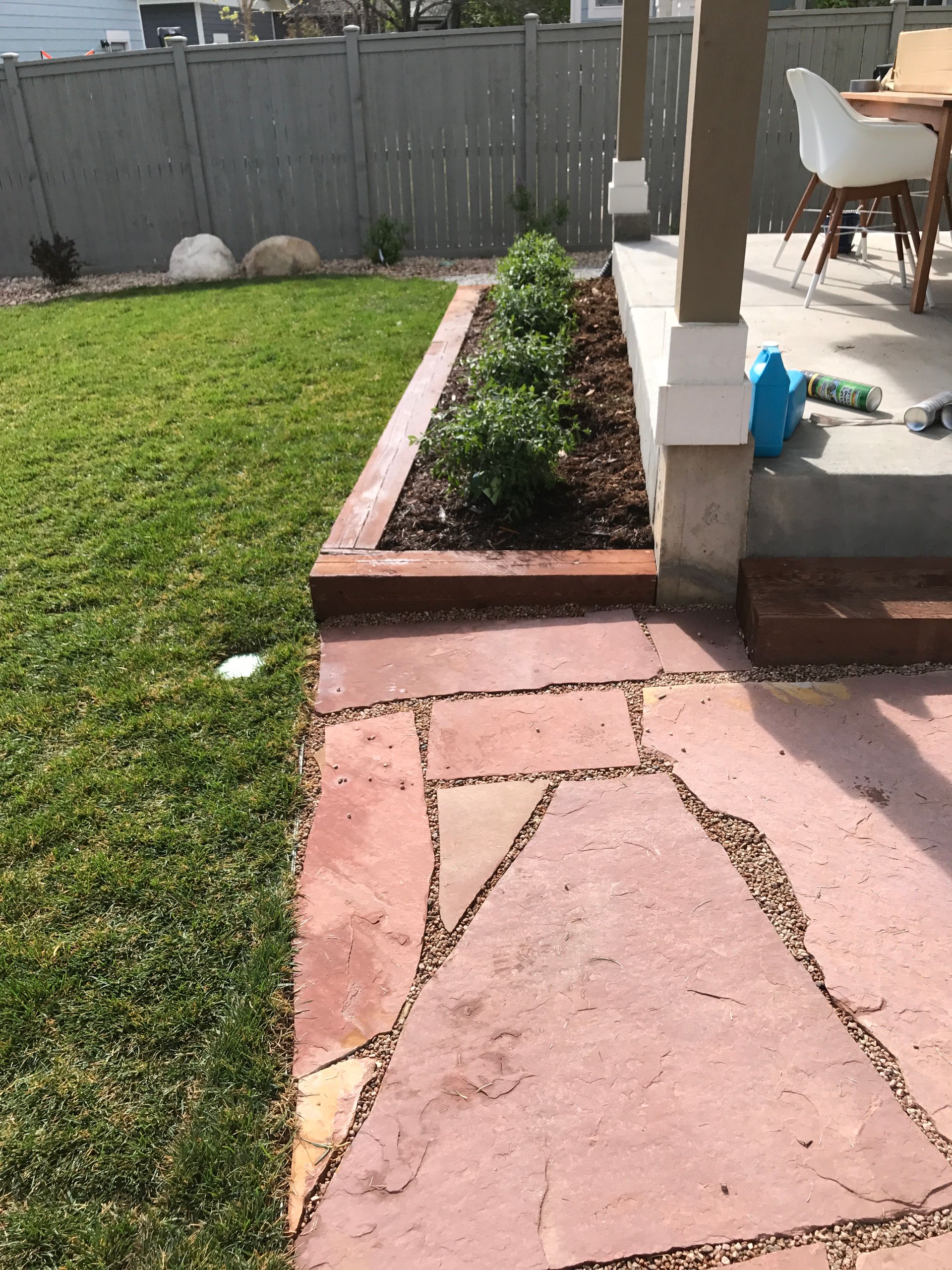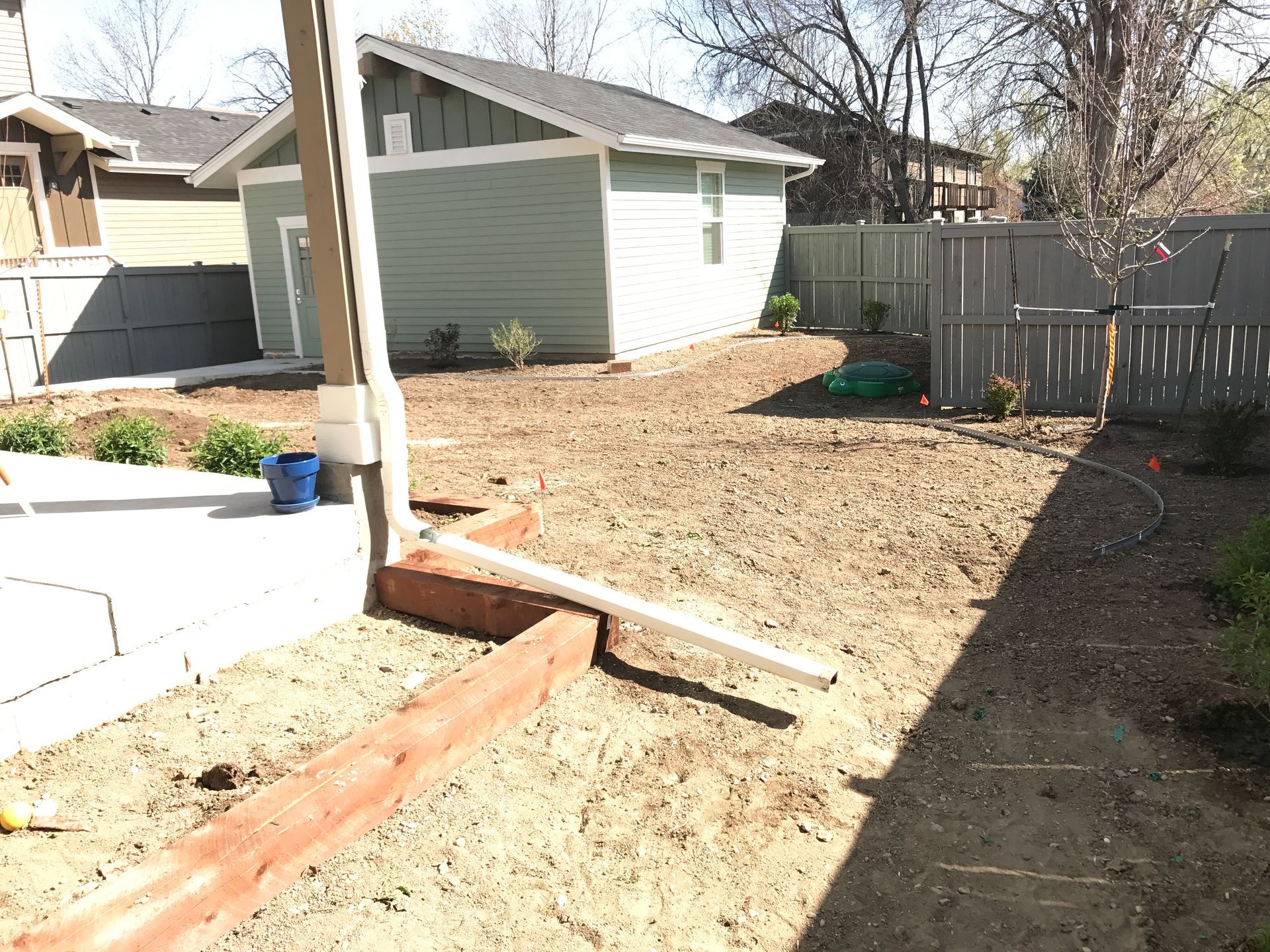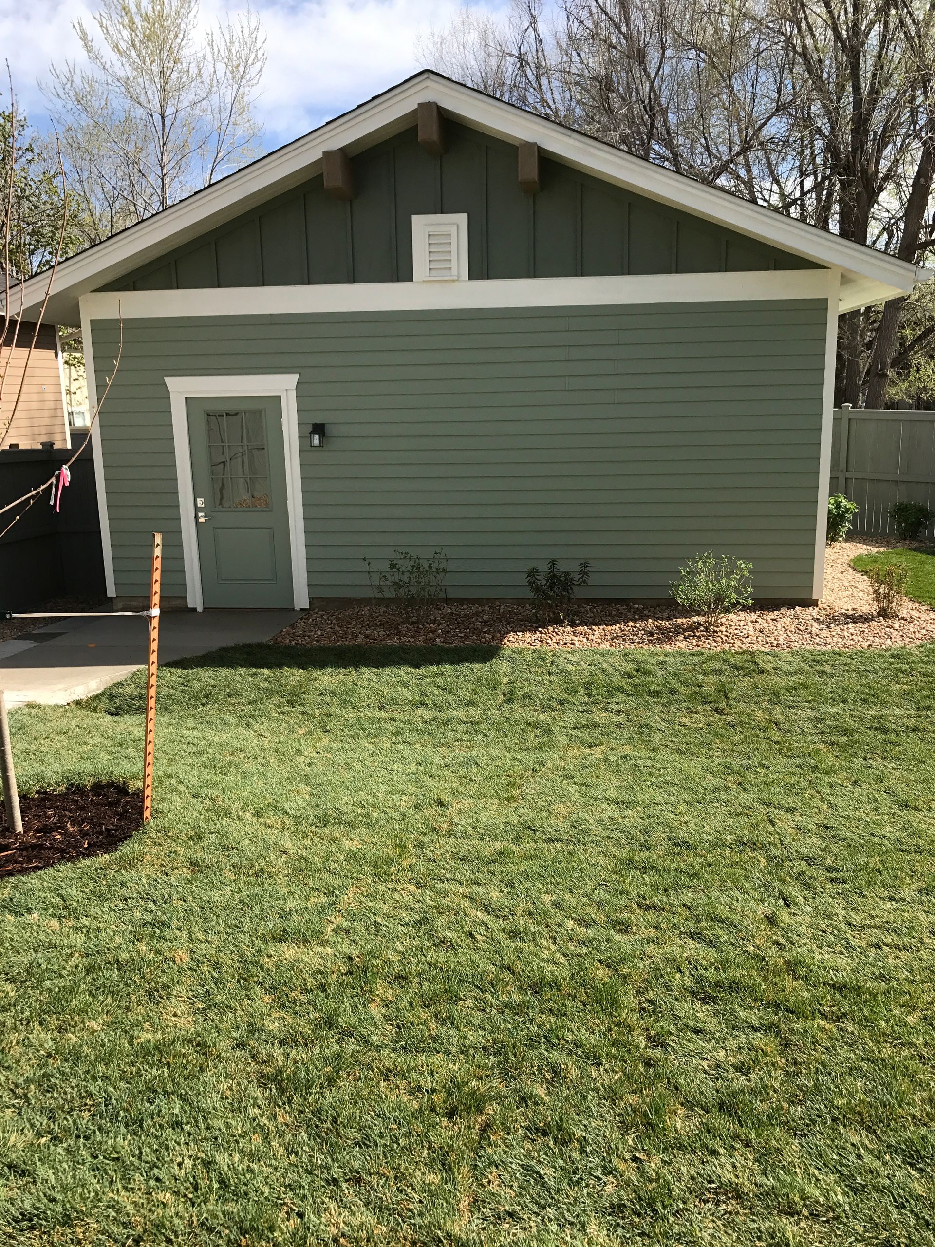 Full landscape remodel with decorative rock, plantings, sprinklers and grass. Lafayette, CO 2019