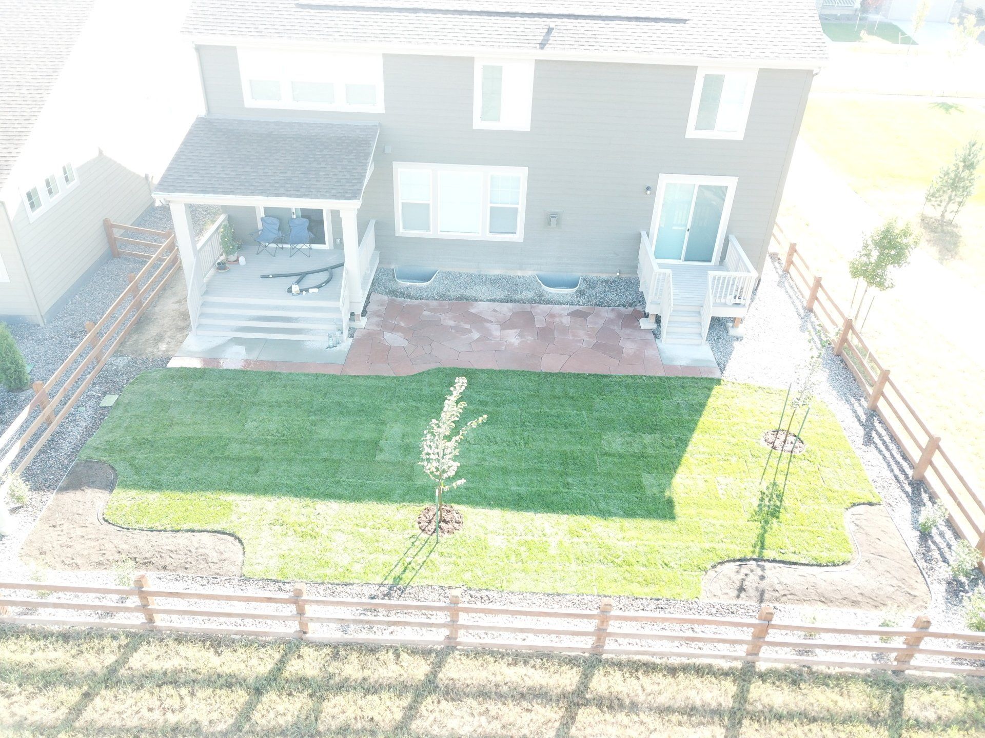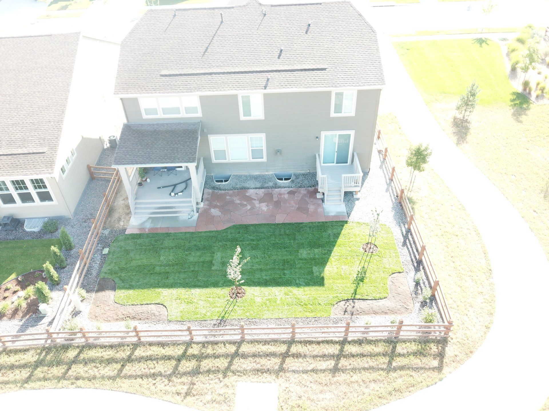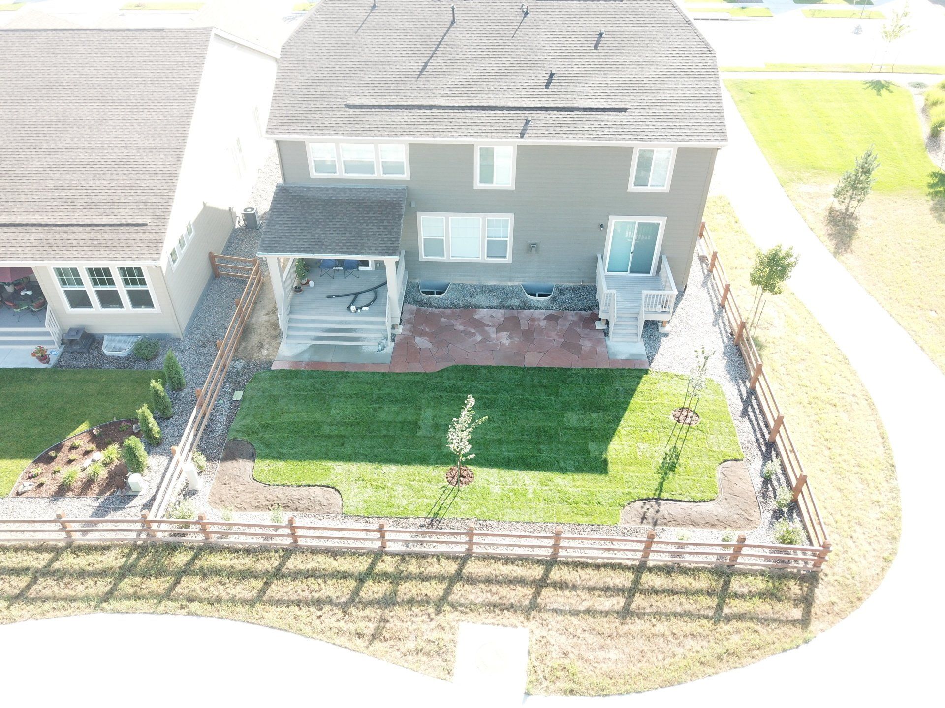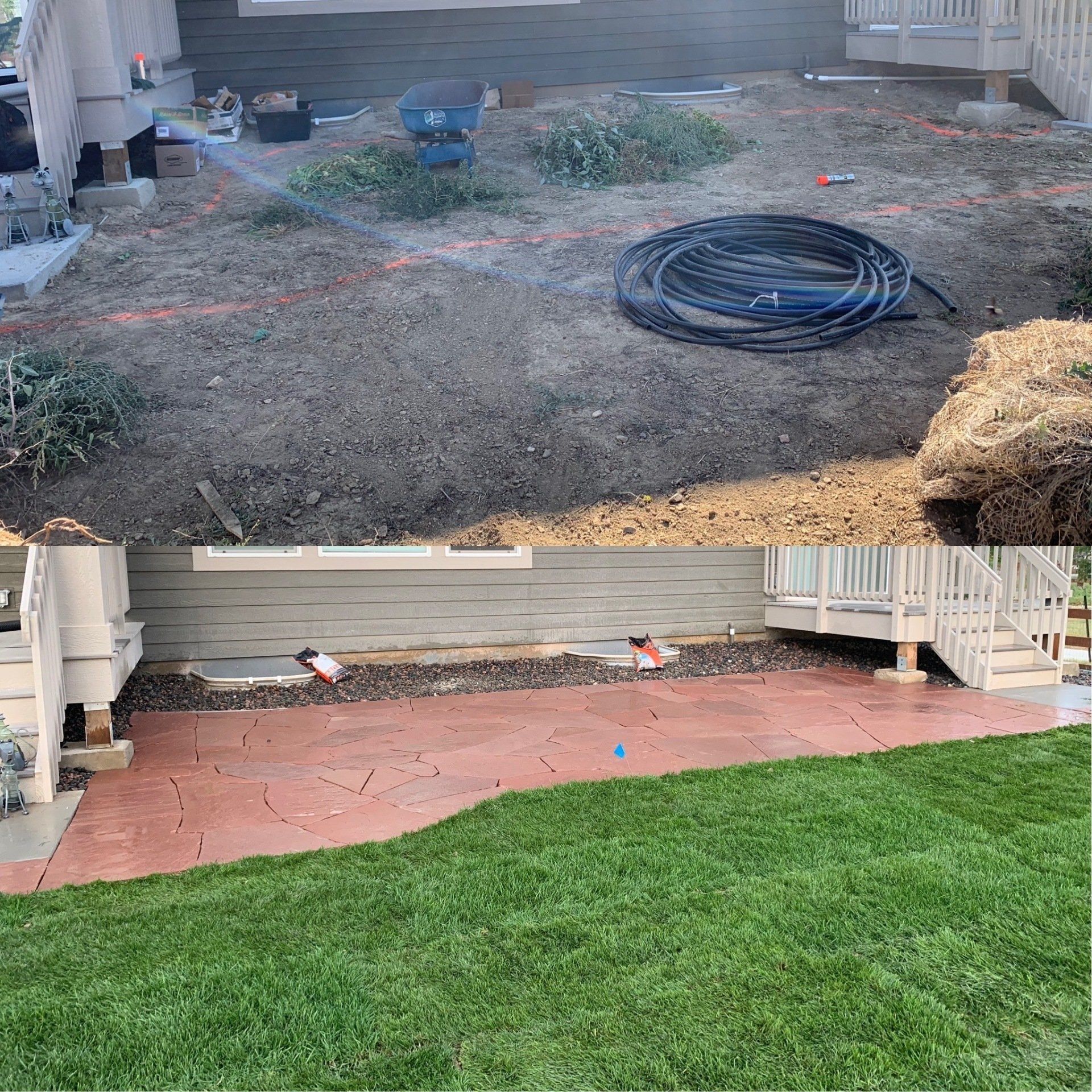 Newly built home with patio, grass, sprinklers, and rock added. From nothing to something.
