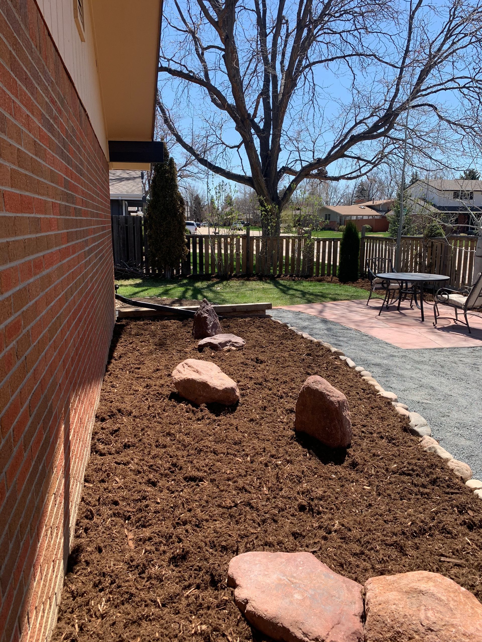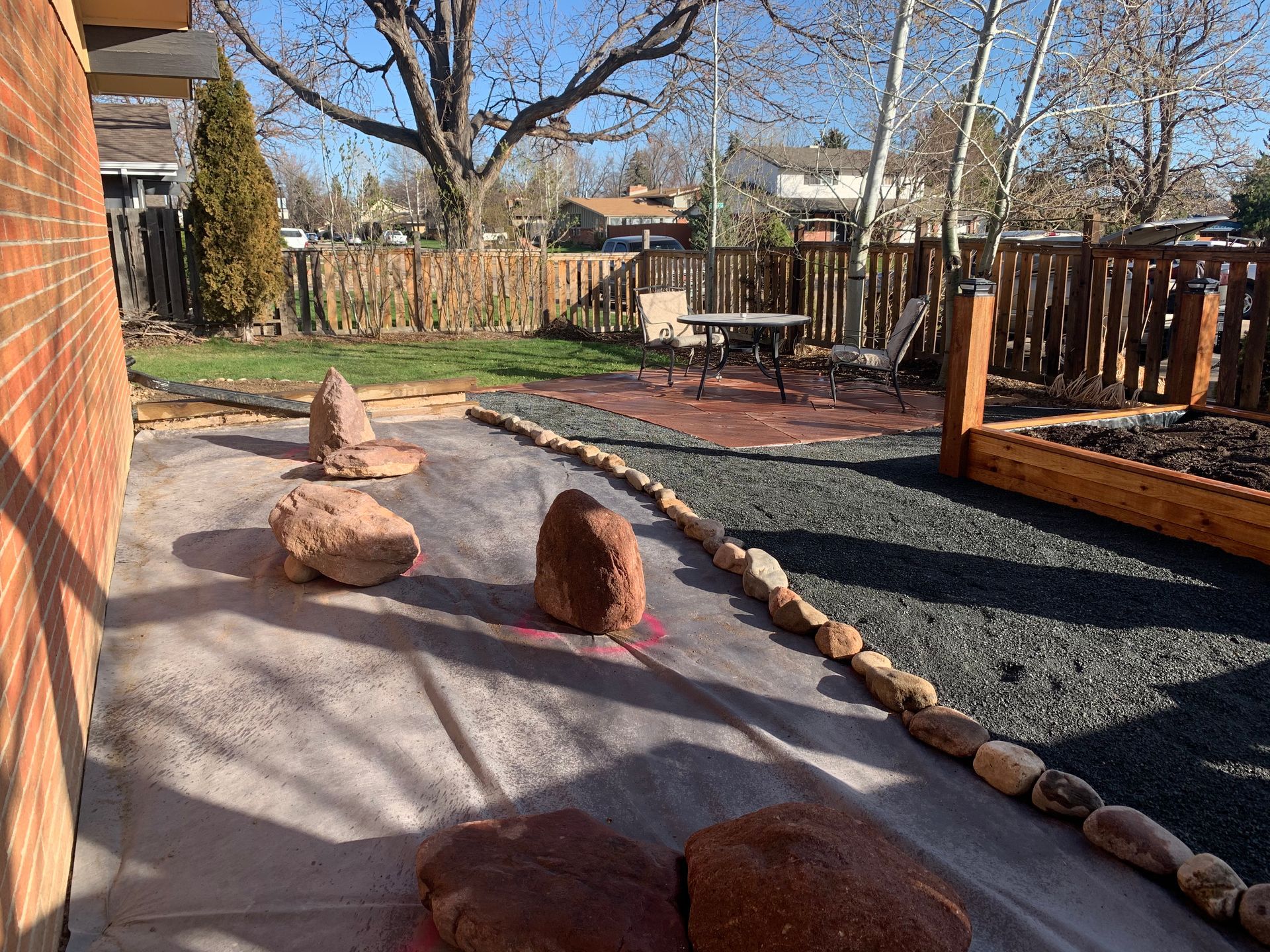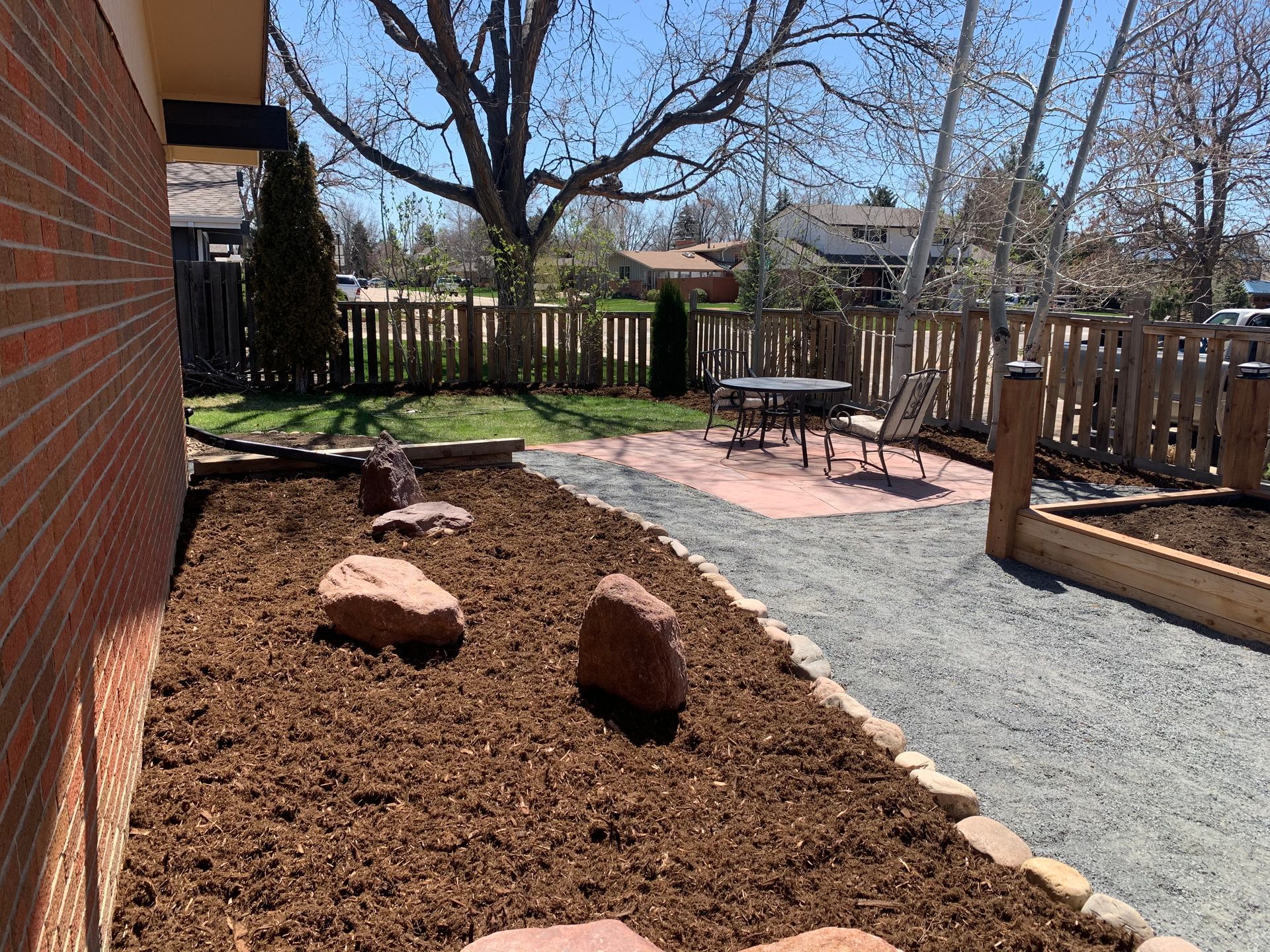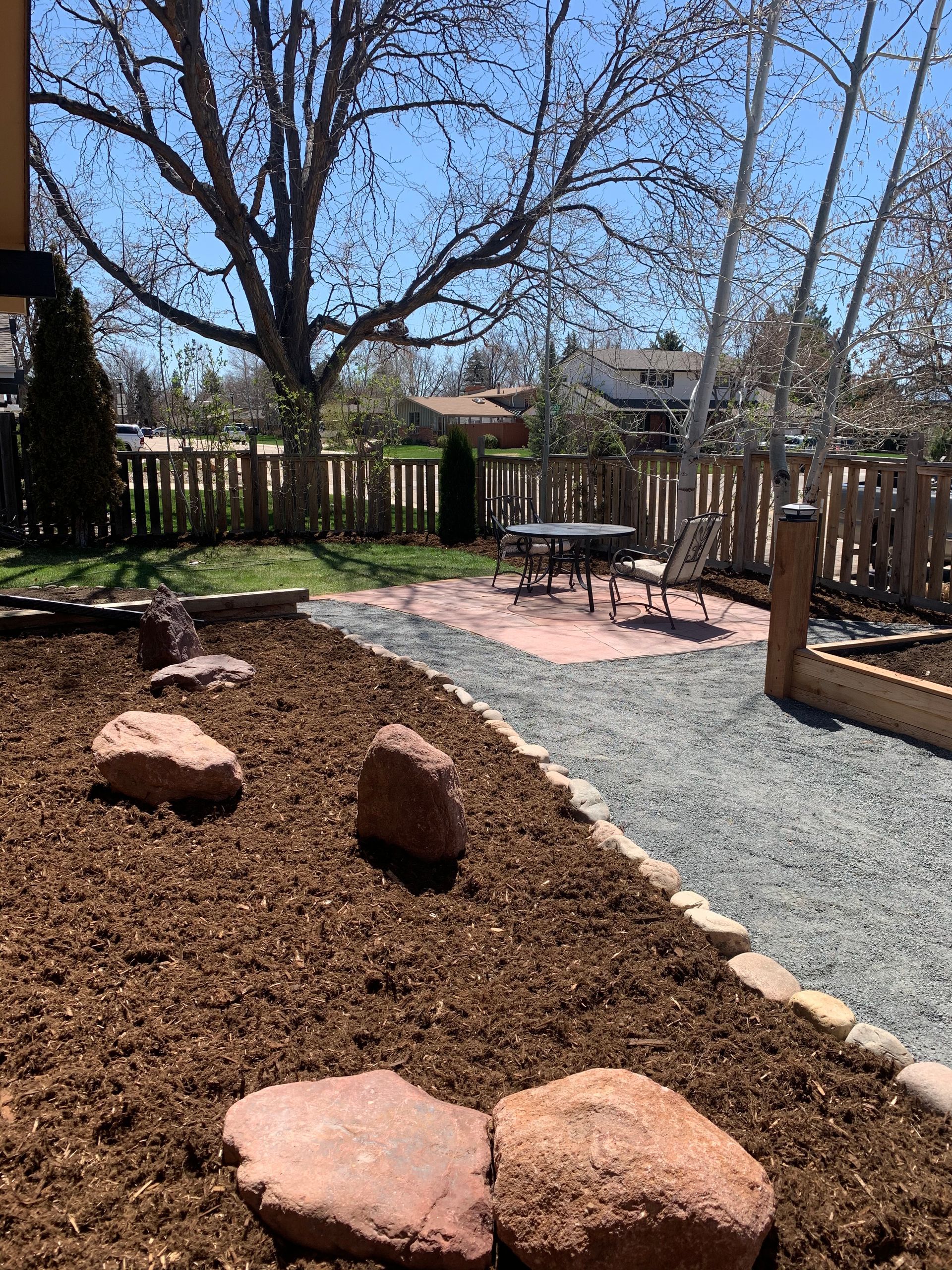New Colorado red flagstone patio, crusher fines, cobble edging, mulch, and boulders. Longmont, CO 2020