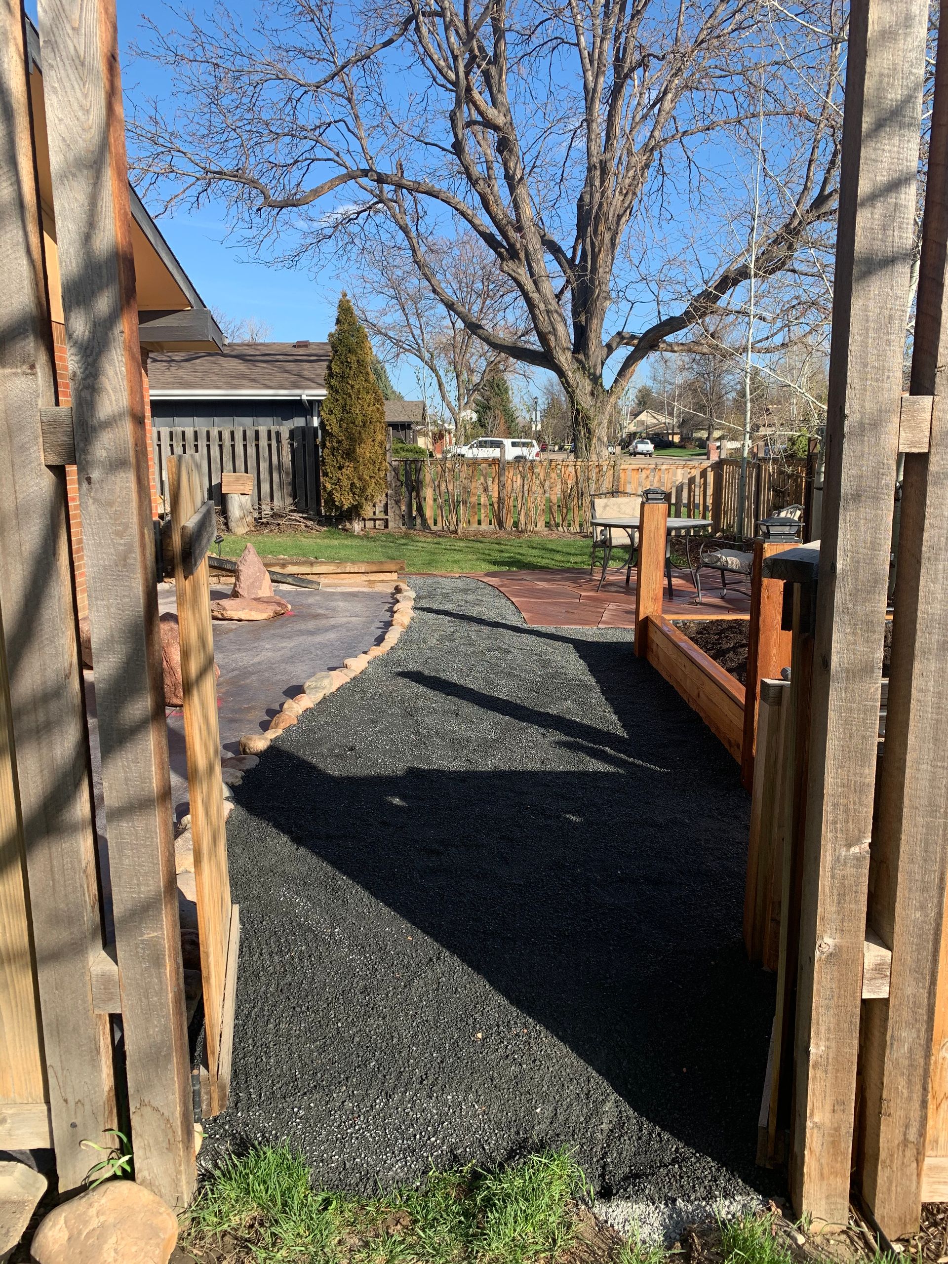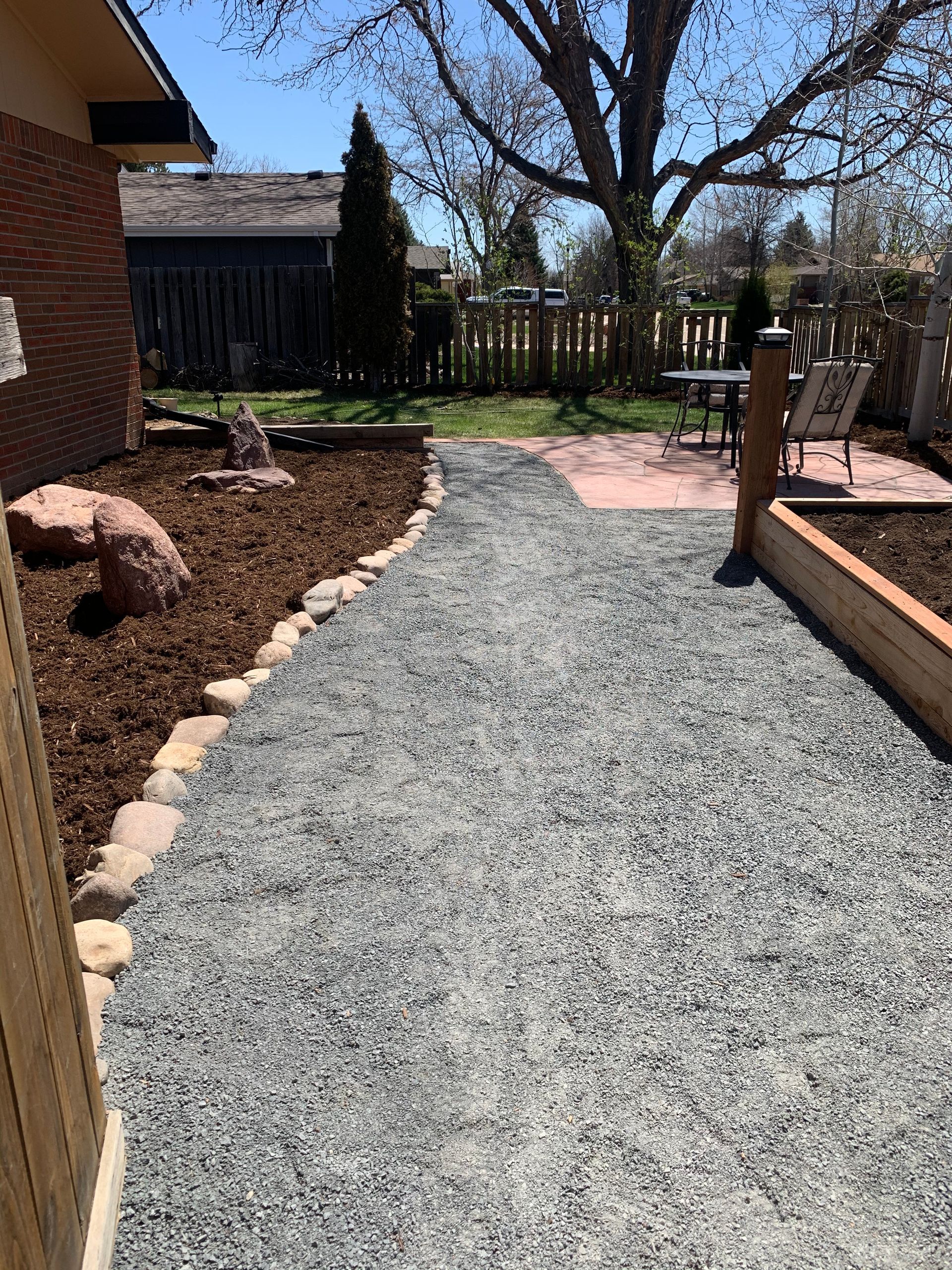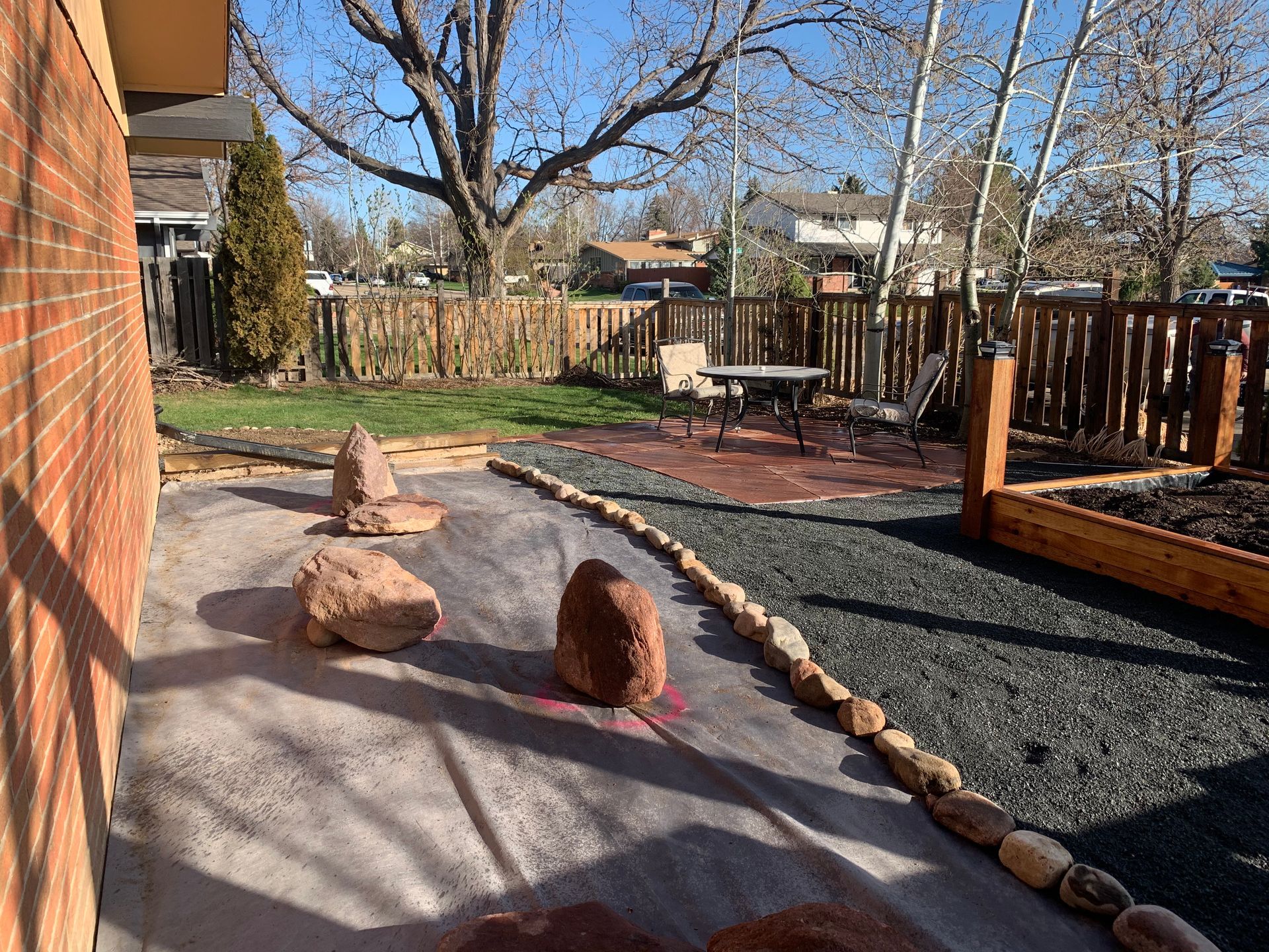 New Colorado red flagstone patio, crusher fines, cobble edging, mulch, and boulders. Longmont, CO 2020