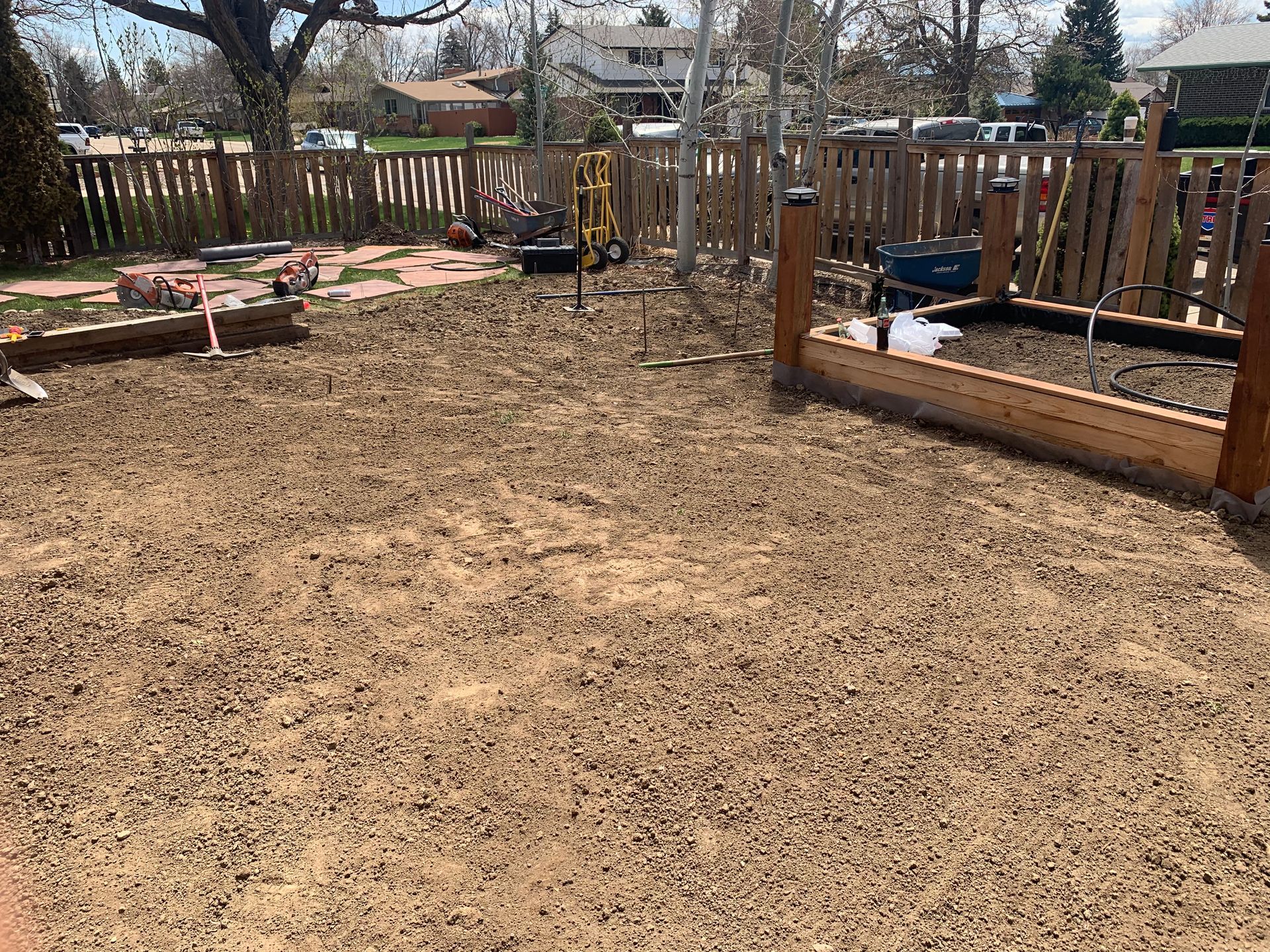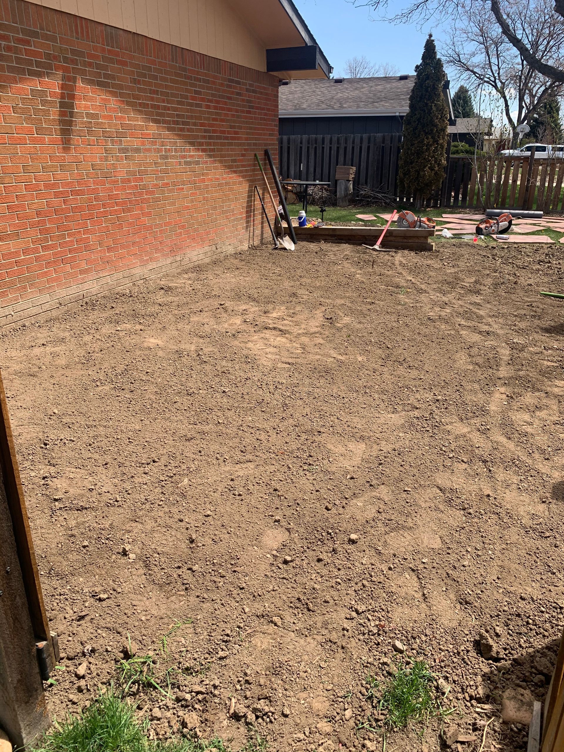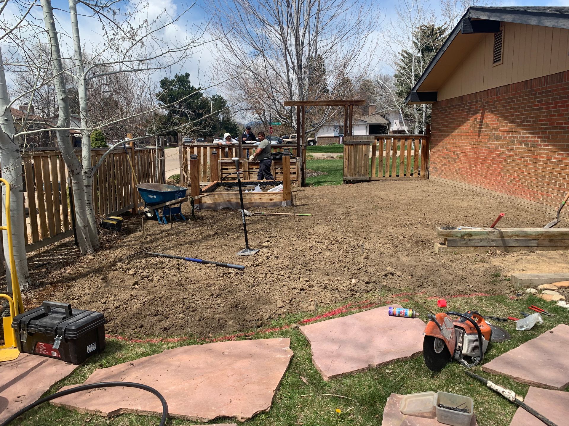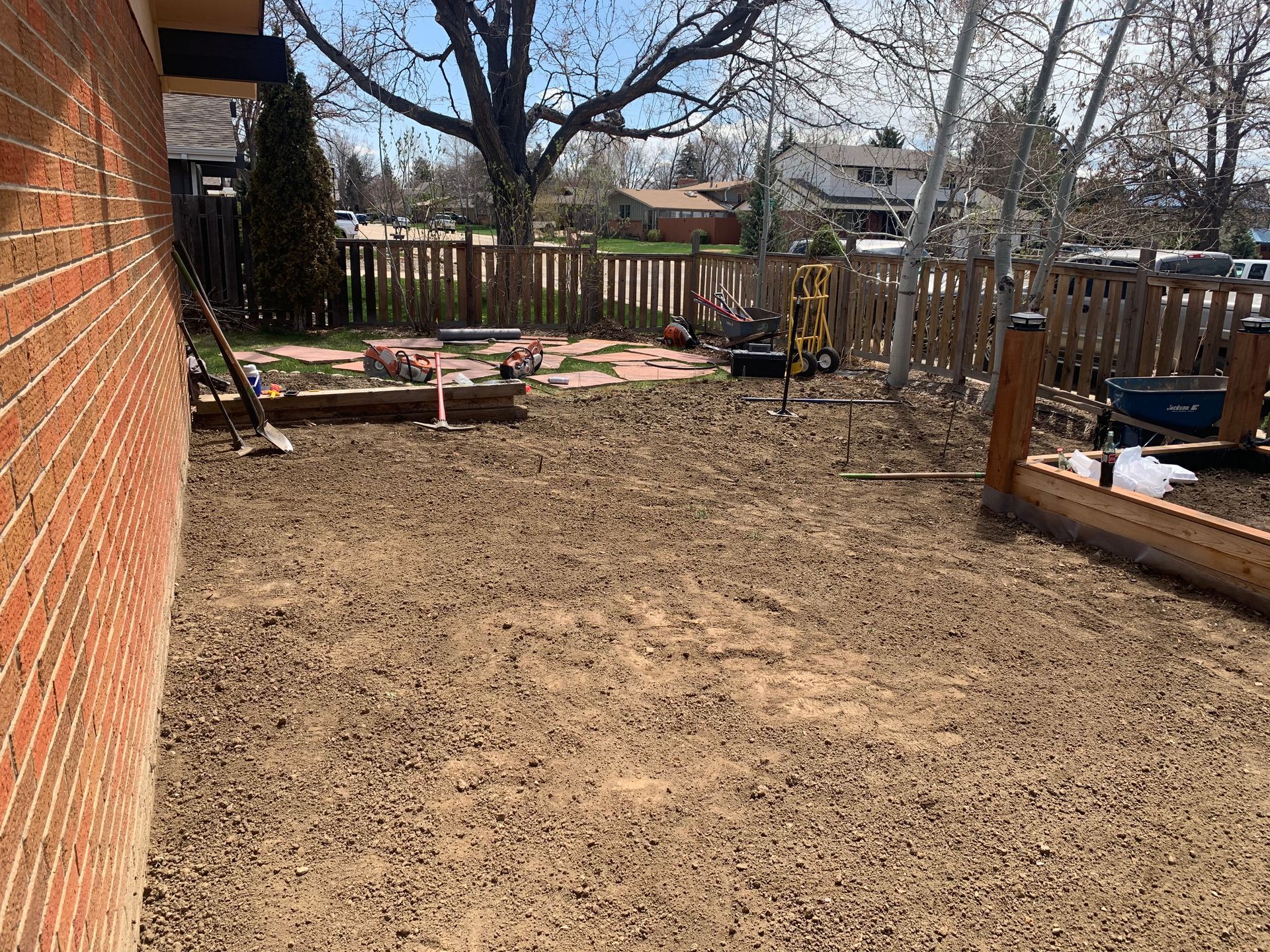 New Colorado red flagstone patio, crusher fines, cobble edging, mulch, and boulders. Longmont, CO 2020